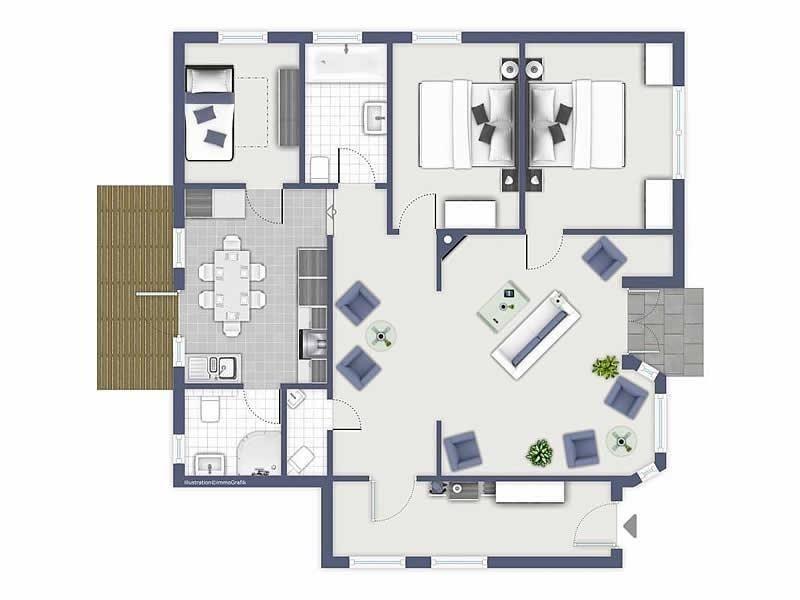 In der Wohnung befindet sich ein Wohnzimmer mit Sitzecke und Sat-TV. Die Küche ist mit Geschirrspüler, Backofen und Esstisch für 6 Personen, Mikrowelle und Gefrierschrank ausgestattet. Das erste Schlafzimmer ist mit einem Doppelbett ausgestattet. Das zweite Schlafzimmer ist mit einem Doppelbett und das dritte Schlafzimmer mit einem Tagesbett erweiterbar auf zwei Betten, ausgestattet. Im Badezimmer befindet sich eine Dusche mit WC und eines mit Badewanne mit WC. Außerdem befindet sich in der Wohnung ein zusätzliches Gäste-WC.