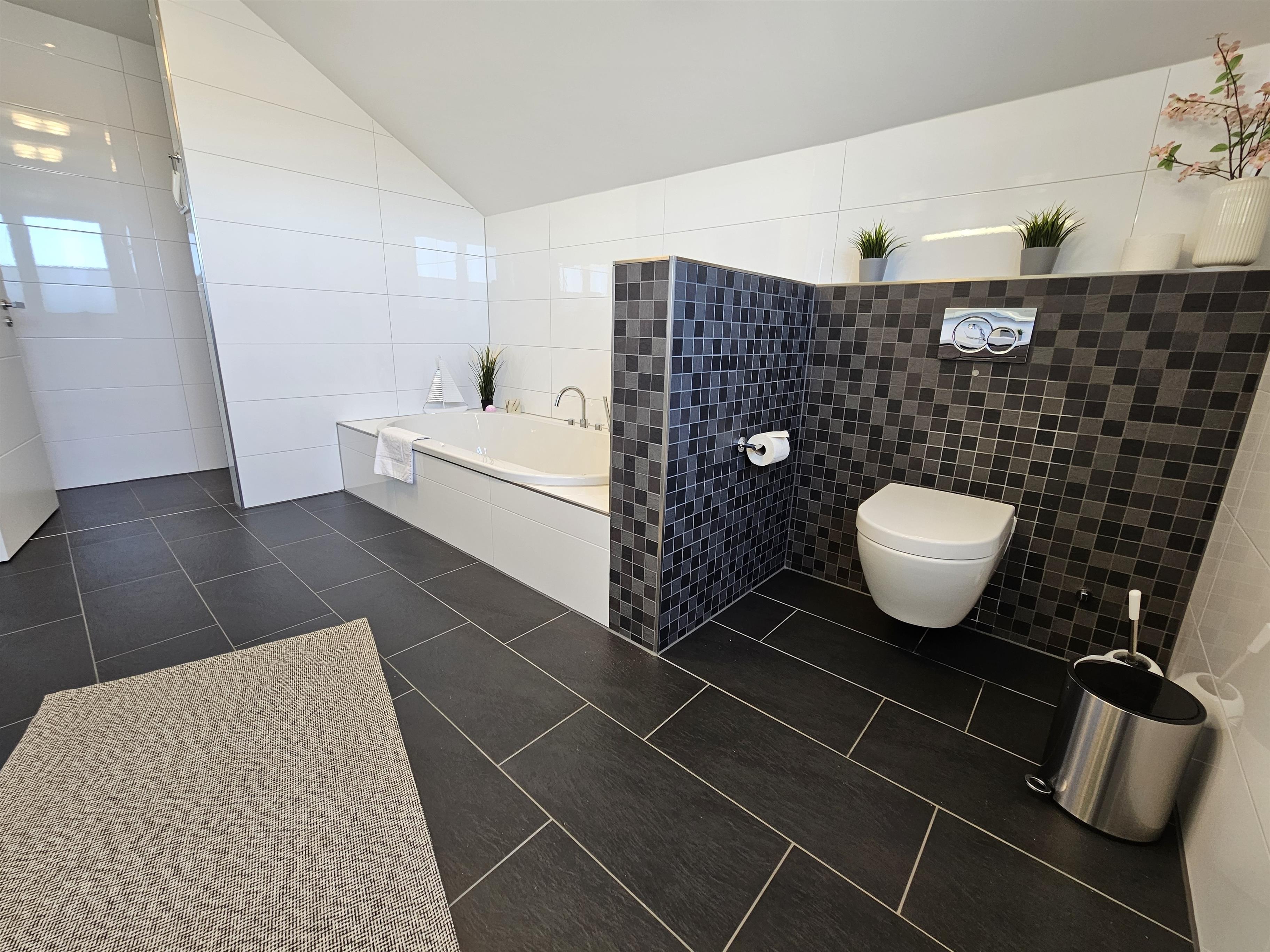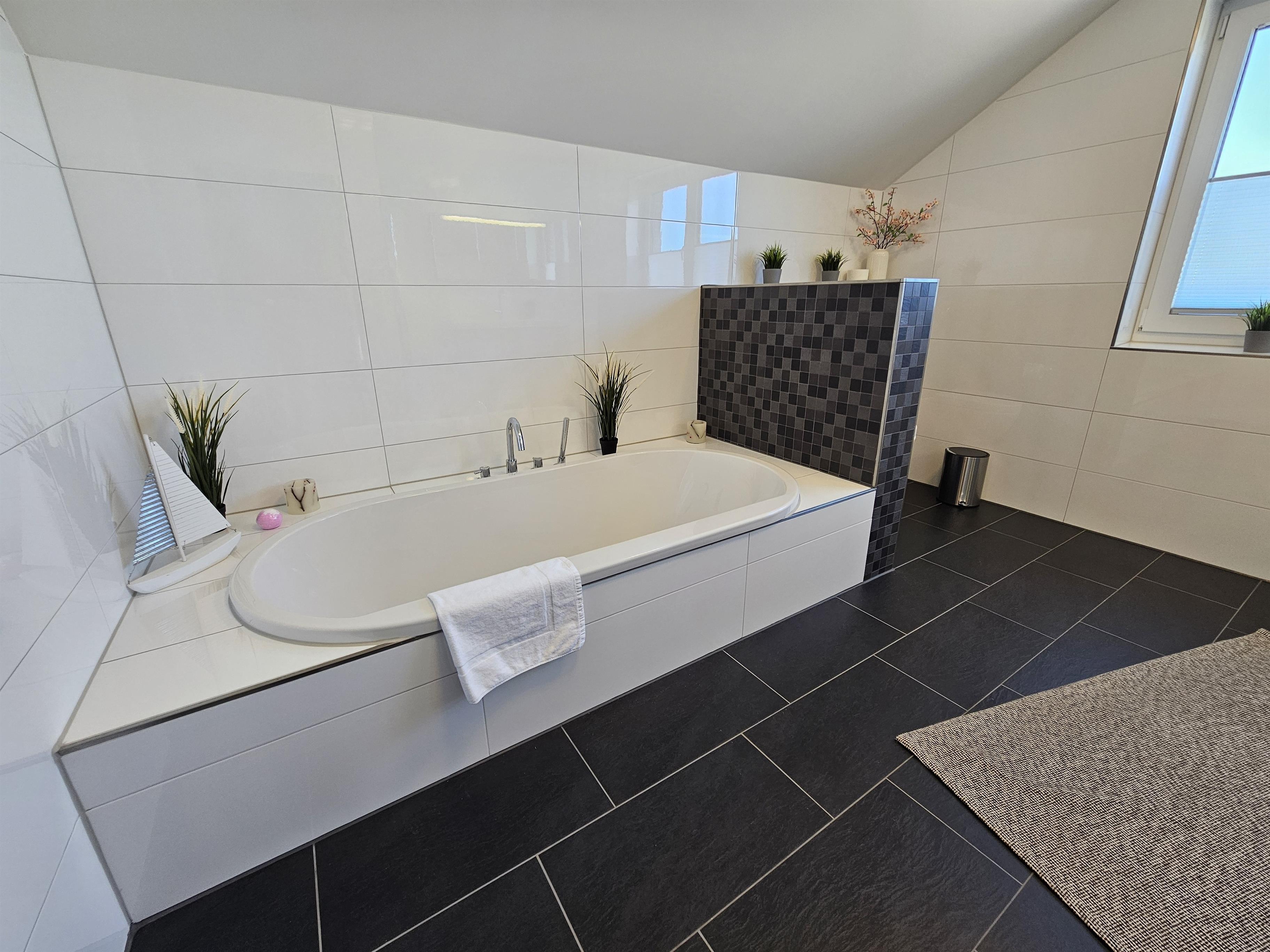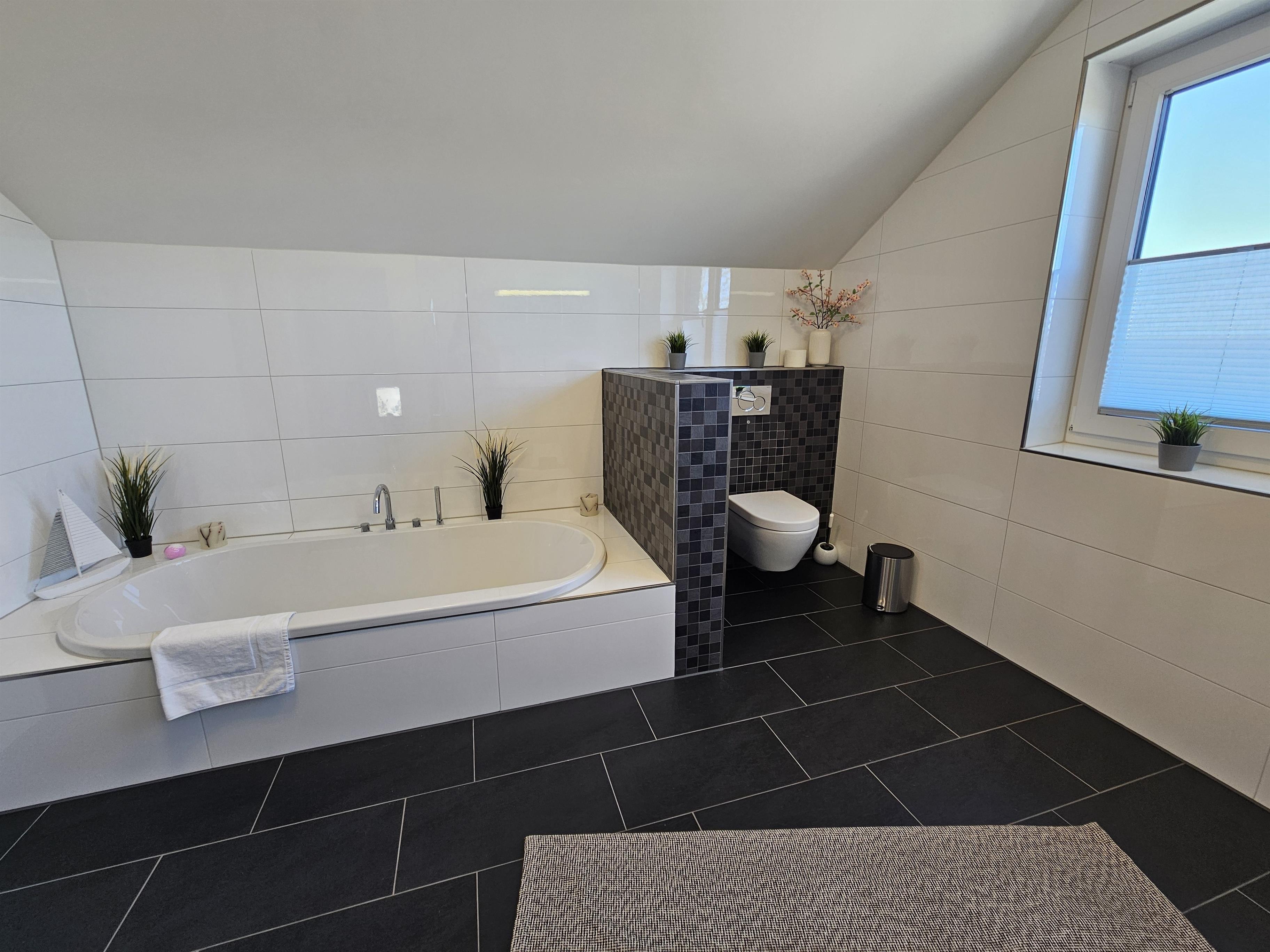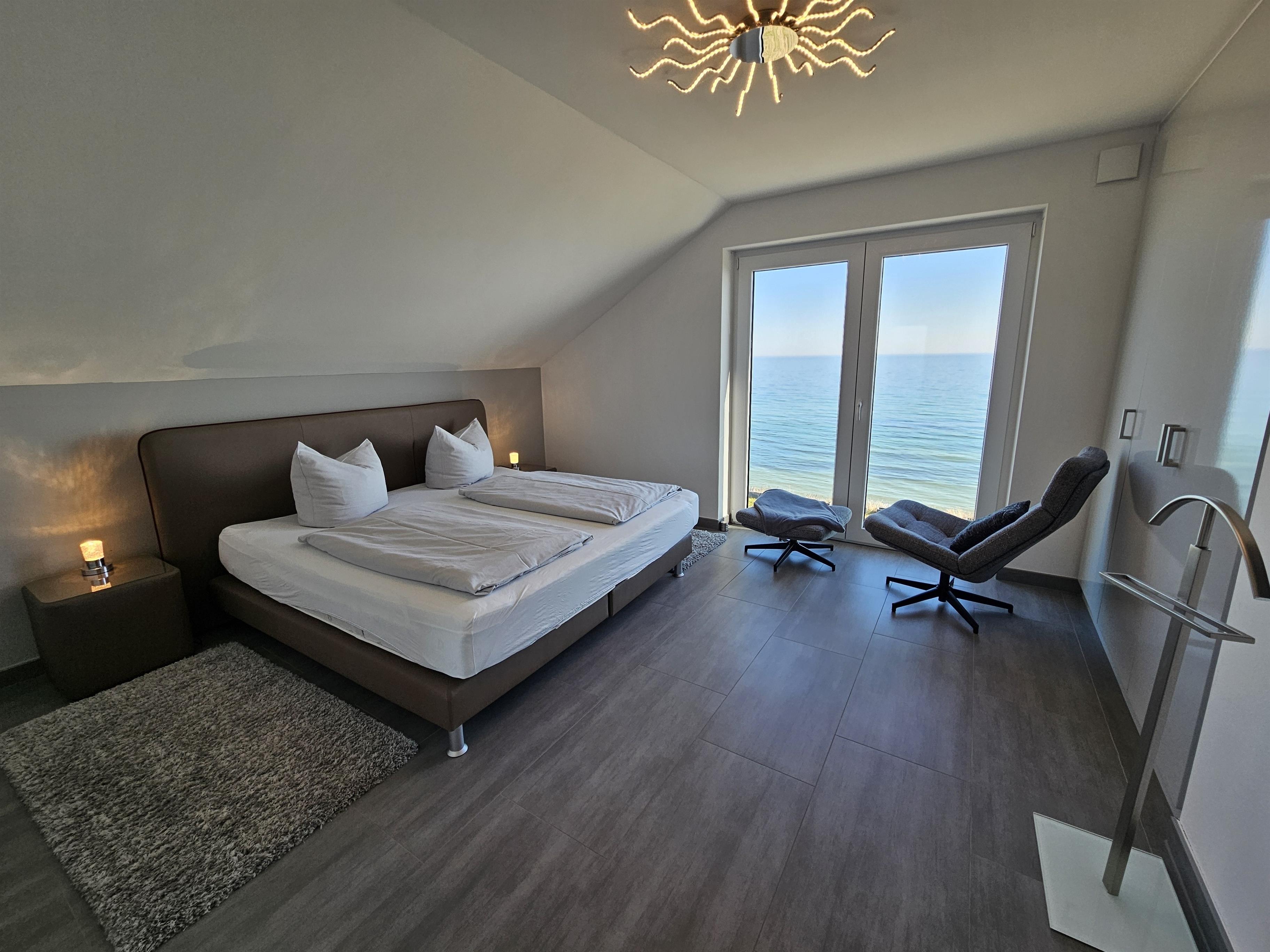 Im Obergeschoss finden Sie zwei geräumige Schlafzimmer, die mit komfortablen Doppelbetten (200x200) und Einbauschränken ausgestattet sind. Beide Räume bieten durch die bodentiefen Doppelglastüren einen herrlichen Blick auf das Meer. Ein weiteres Zimmer mit Schlafsofa (110x200) und TV sowie ein großes Badezimmer mit begehbarer Dusche, Badewanne und breitem Waschbecken runden das Angebot ab.