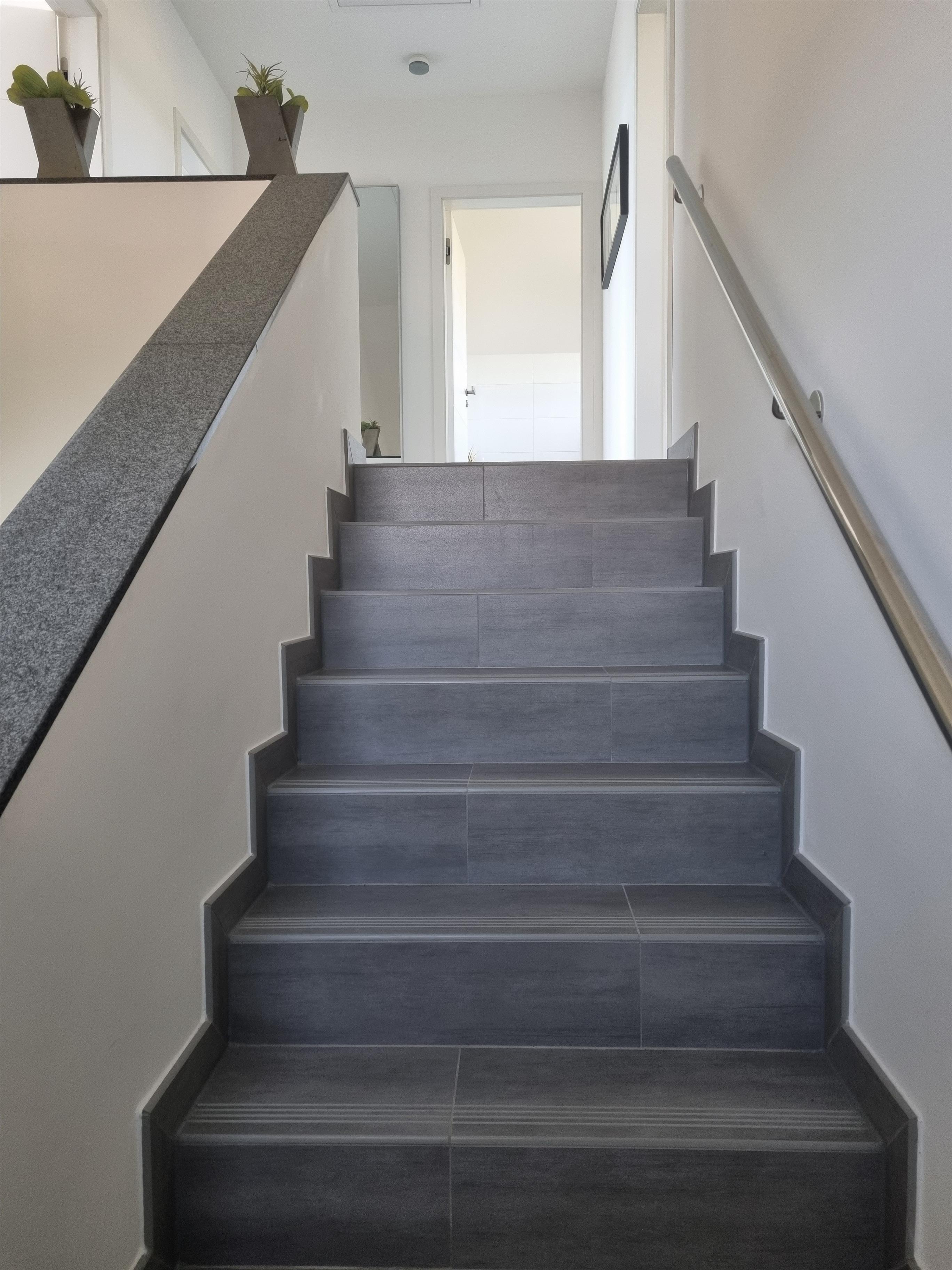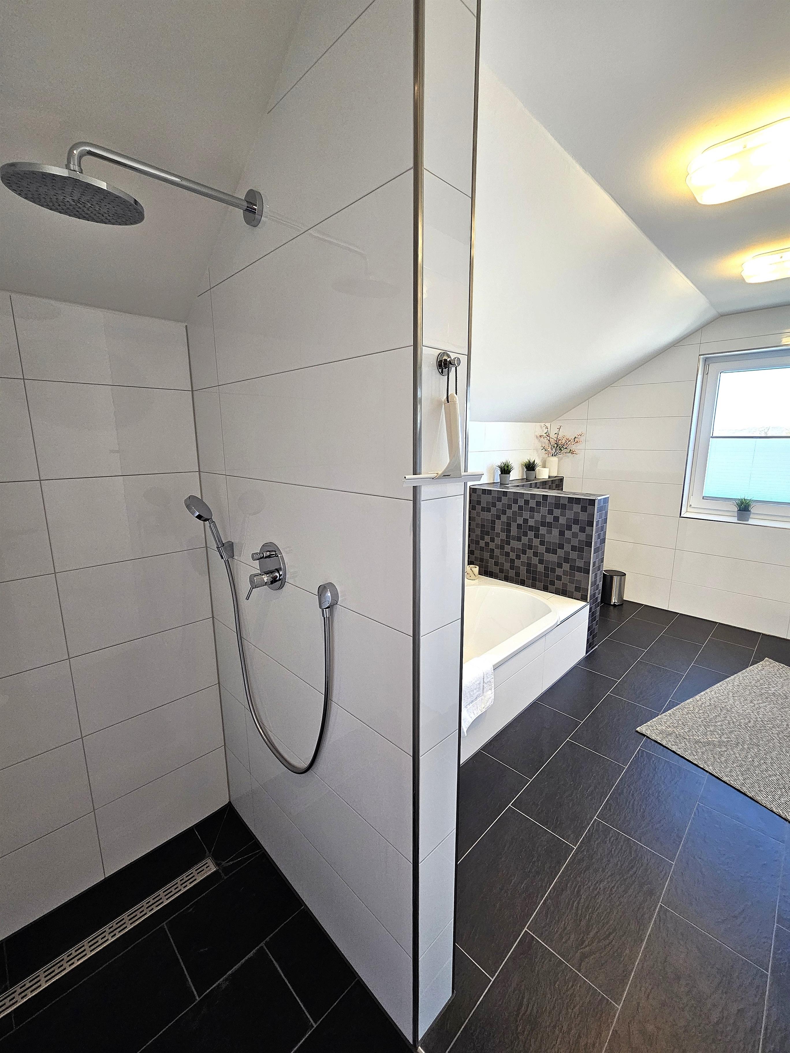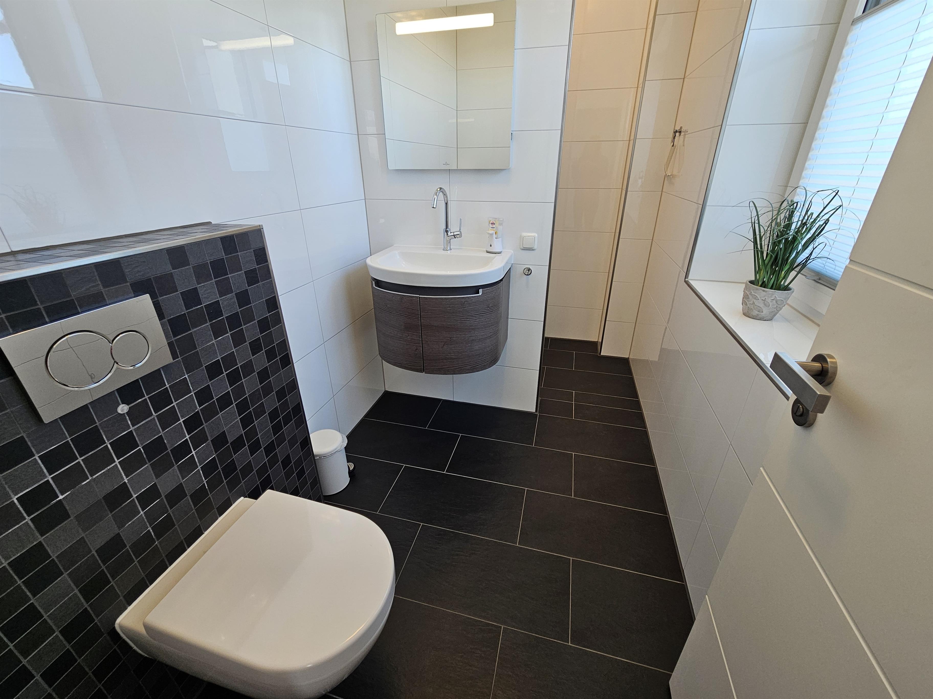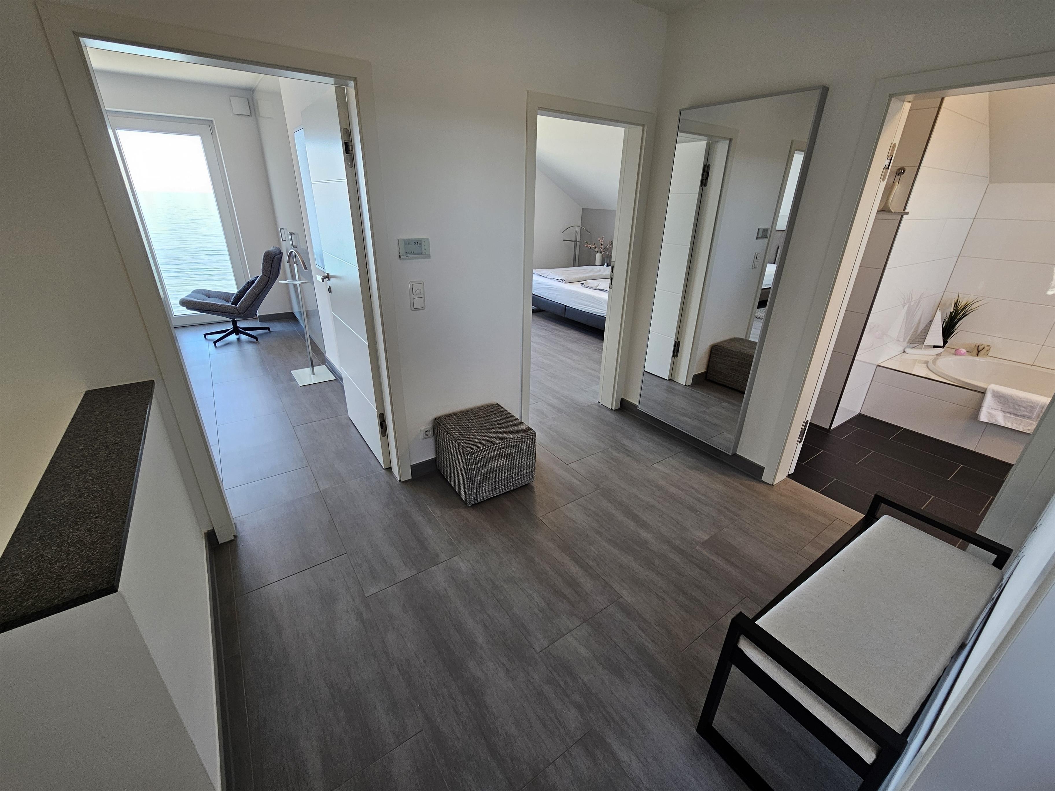 Im Erdgeschoss erwartet Sie ein großzügiger, lichtdurchfluteter Küchen-, Ess- und Wohnbereich mit hohen Decken und bodentiefen Fenstern, die einen direkten Blick auf die Ostsee ermöglichen. Hier können Sie entspannen und die Meeresbrise genießen. Zusätzlich stehen Ihnen ein Gäste-WC mit offener Dusche, ein Hausanschlussraum mit Waschmaschine und Trockner sowie eine Garderobe mit Einbauschrank zur Verfügung.