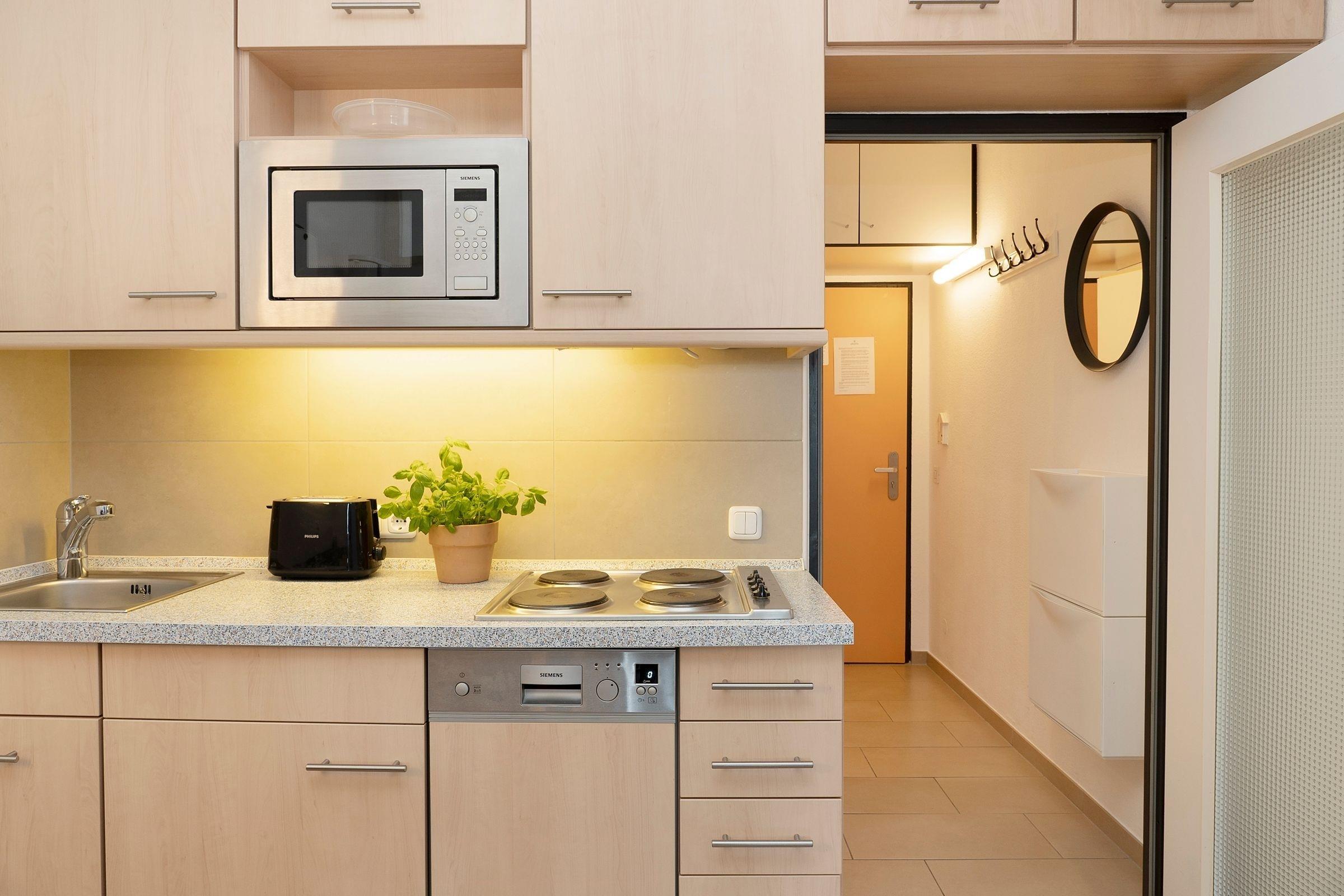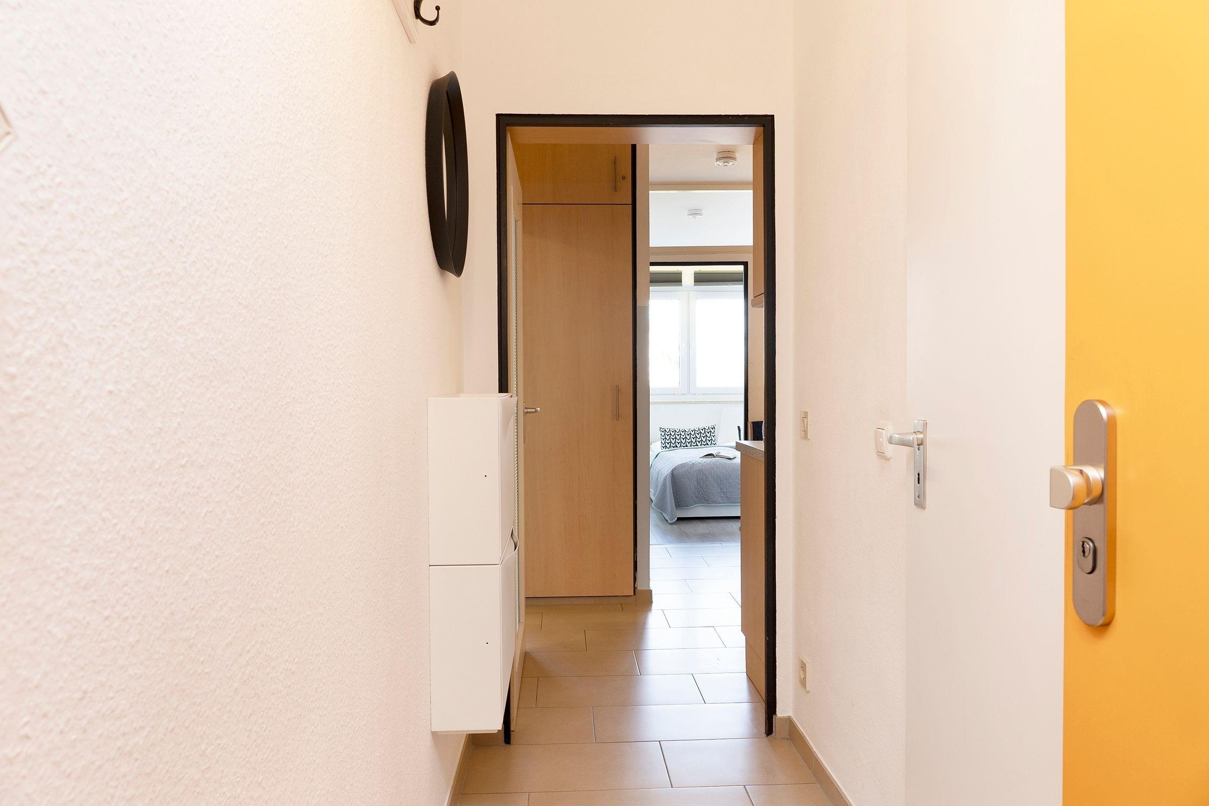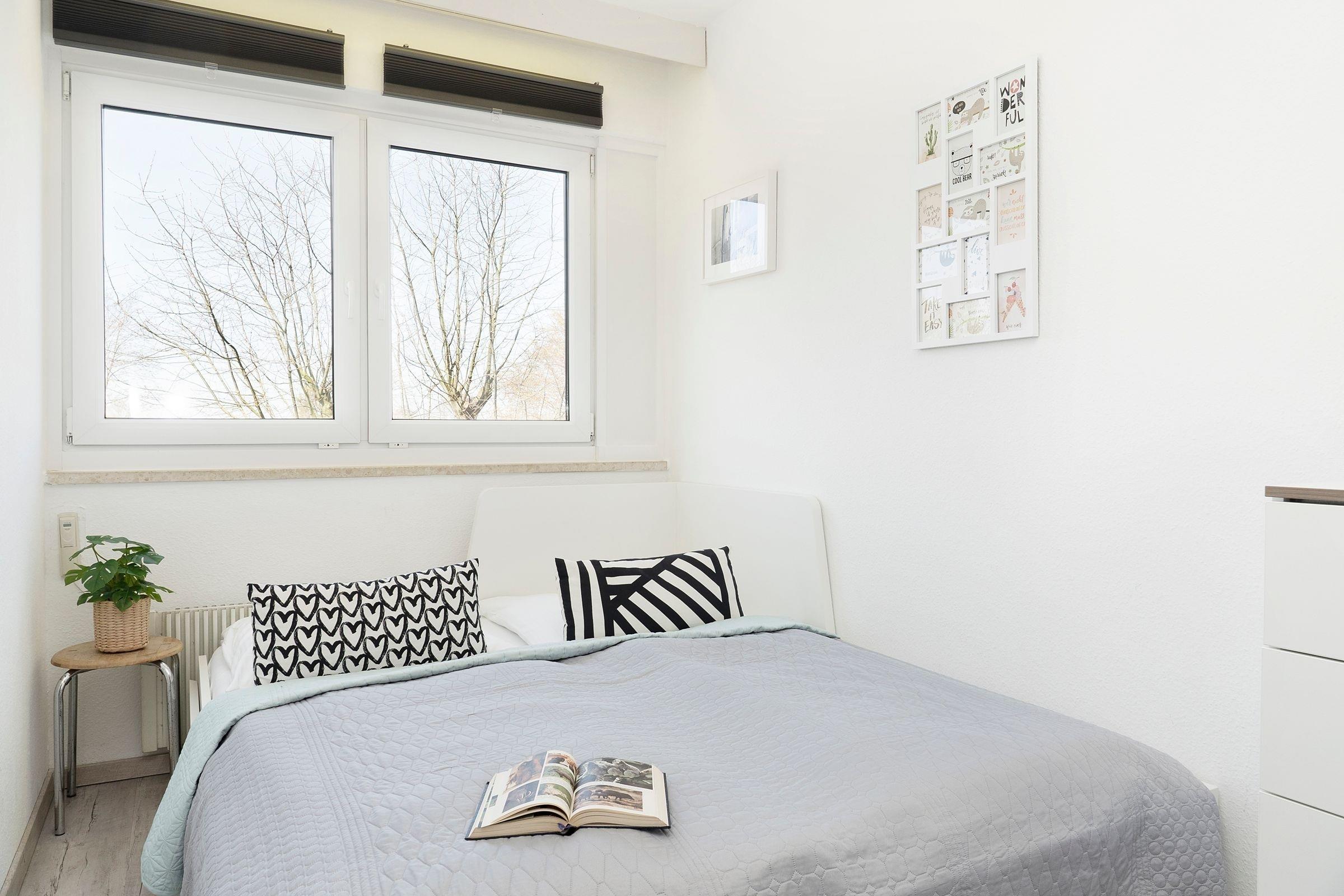 Im Eingangsbereich der Wohnung haben Sie die Möglichkeit, Ihre Jacken an der Garderobe aufzuhängen. Durch den Flur geradeaus erwartet Sie ein kombinierter Wohn- und Schlafraum mit einem komfortablen Doppelbett (180x200 cm), einem gemütlichen Ecksofa, einem großen Kleiderschrank sowie einem Flachbildfernseher. Das separate Schlafzimmer ist mit einem ausziehbaren Kojenbett (160x200 cm) ausgestattet. Dieses Zimmer lässt sich mit Plissees verdunkeln, sodass Sie Ihren wohlverdienten Schlaf im Urlaub erhalten. Die gut ausgestattete Küche mit Induktionsherd verfügt über eine gemütliche Ess-Ecke, an der Sie gemeinsam speisen können. Im hell gefliesten, innenliegenden Badezimmer mit Badewanne sind ausreichend Ablagemöglichkeiten für Ihre Badutensilien vorhanden. Auf dem nach Westen ausgerichteten Balkon fangen Sie den Sonnenuntergang ein. Hier finden Sie eine moderne Wohnung, die keine Wünsche offen lässt. Der WLAN-Anschluss ist für Sie inklusive.