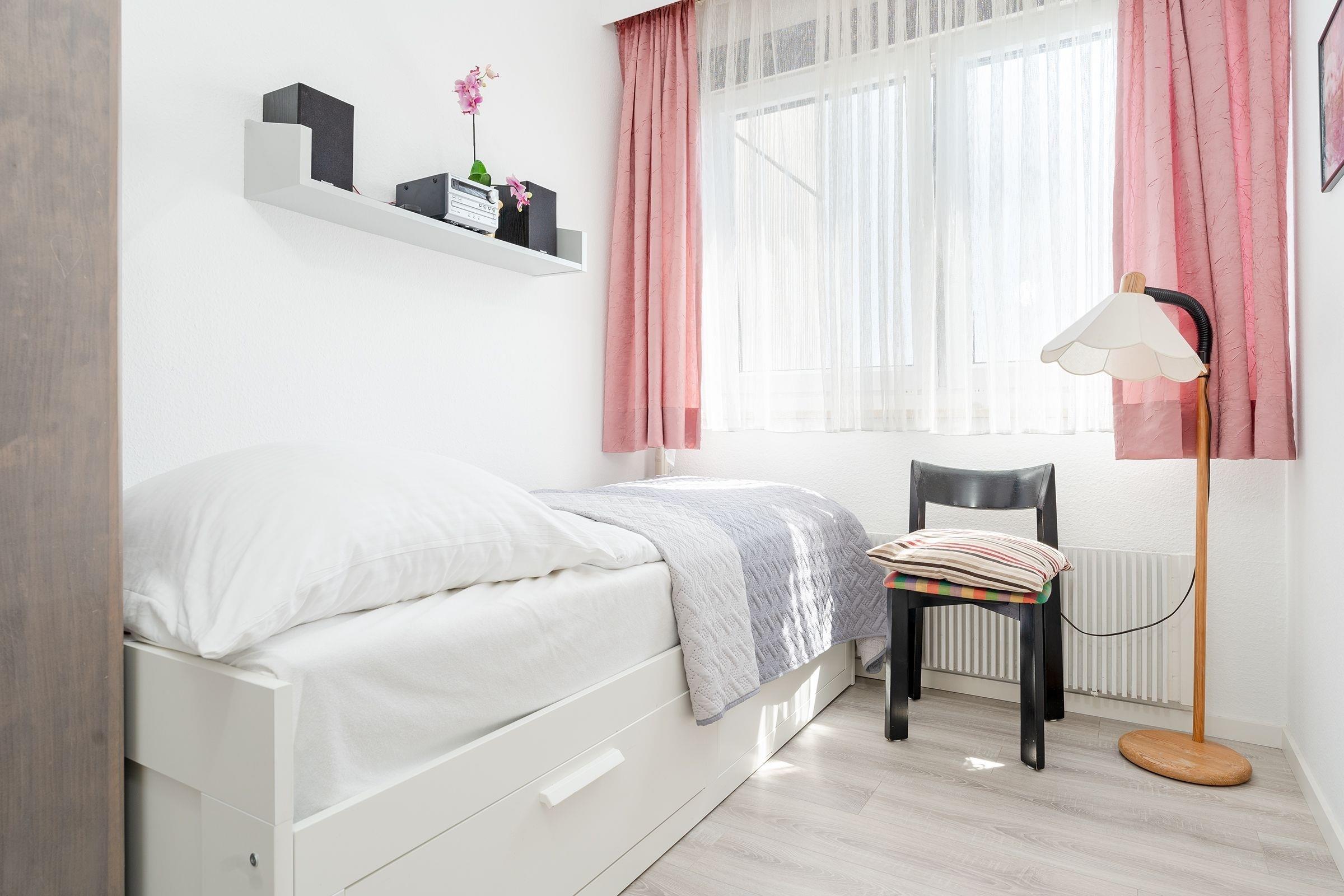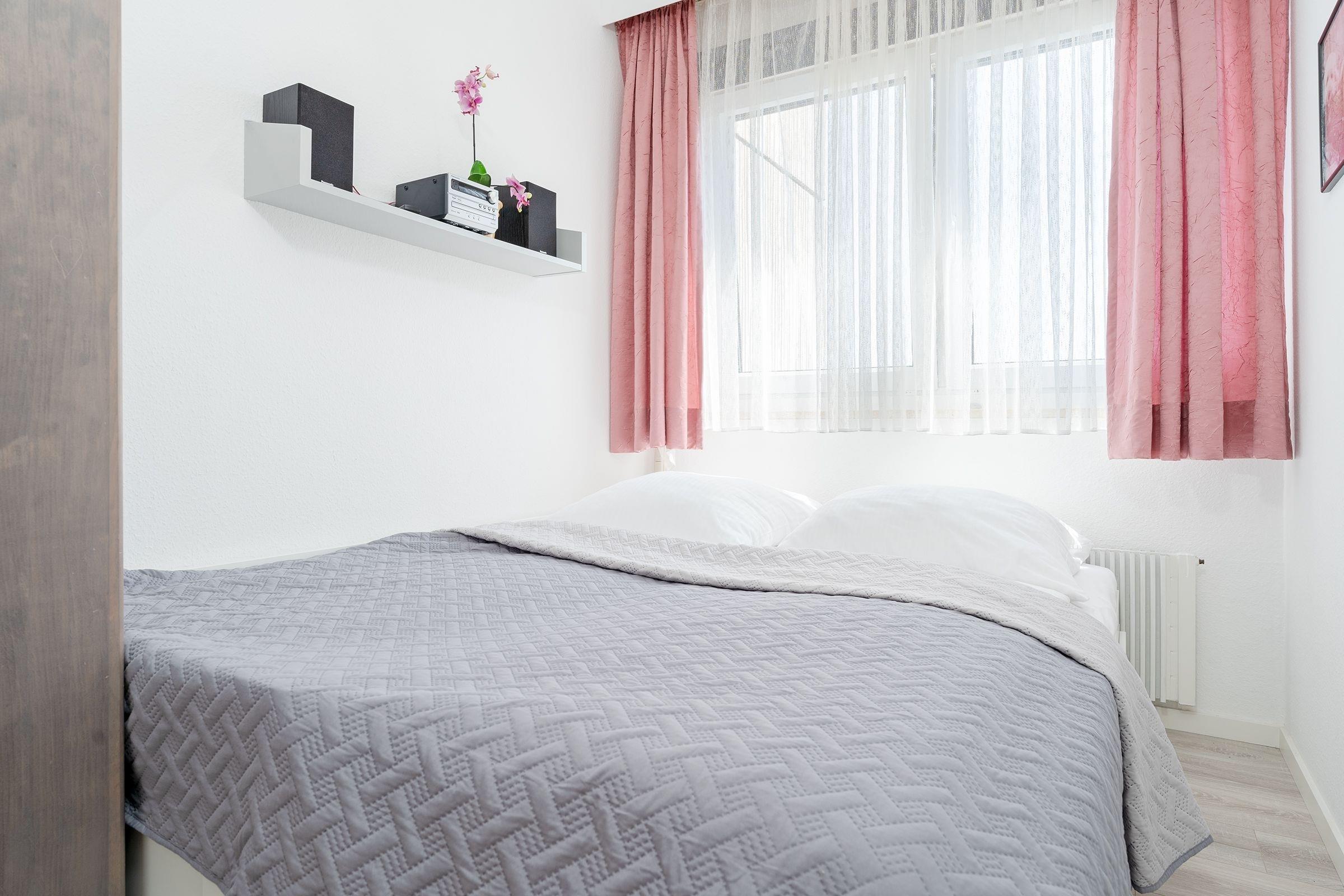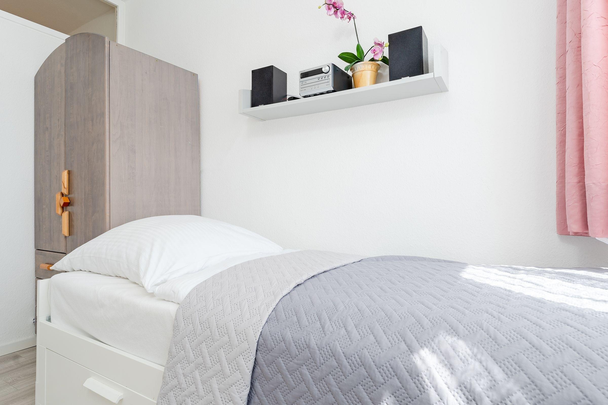 Wohn/Schlafraum: 1 Doppelbett (2x 90x200 cm), Kleiderschrank, Verdunkelung (Jalousie, Gardinen)