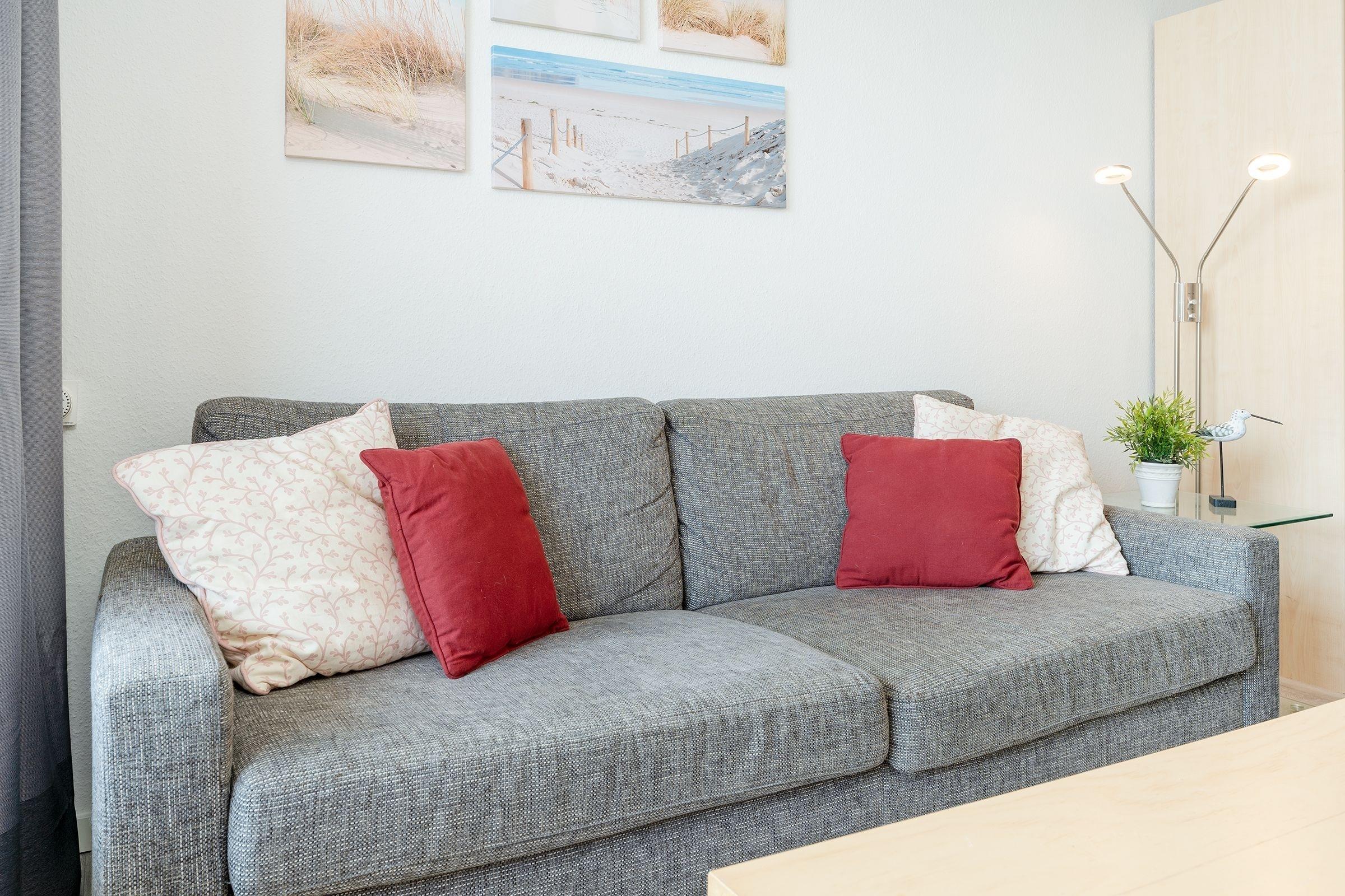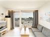Ein geschmackvoll eingerichteter, heller Wohn- und Schlafraum mit einem Sofa, einem Sessel und einem Fernseher erwartet Sie. Als Schlafmöglichkeit dient hier das komfortable Doppelbett (2x 90x200 cm). Das separate (Kinder-) Schlafzimmer mit Fenster erreichen Sie durch die Küche. Dort steht Ihnen ein Kojenbett (je 80x200 cm) und ein Kleiderschrank zur Verfügung. Außerdem verfügt die Wohnung über eine gut ausgestattete, geschlossene Küche mit z. B. einem 4-Plattenkochfeld, einem Kühlschrank und einem Esstisch. Das innenliegende Badezimmer erwartet Sie mit einer Badewanne. Der überdachte, möblierte Balkon bietet Ihnen einen traumhaften Meerblick. Der WLAN-Anschluss ist selbstverständlich inklusive.