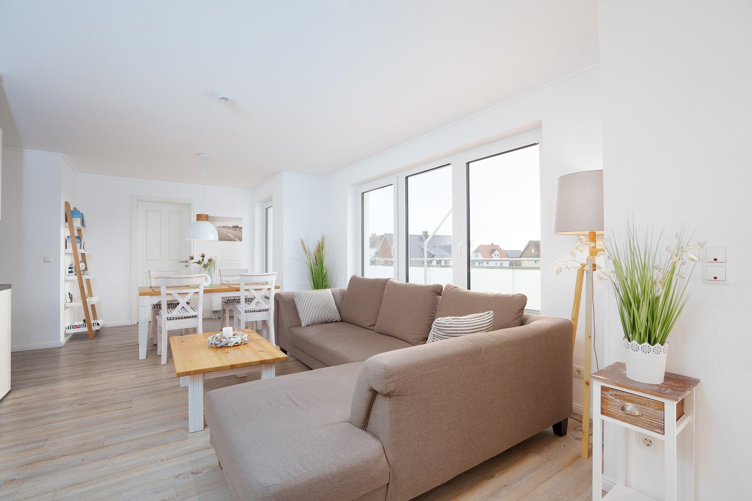 Es begrüßen Sie ein geschmackvoll eingerichtetes Wohn- und Esszimmer mit einer integrierten, voll ausgestatteten Küchenzeile. Zwei separate Schlafräume (1 komfortables Boxspring-Doppelbett 190x200 cm, 2 Einzelbetten mit je 90x200 cm) sowie ein Wohlfühlbad mit ebenerdiger Dusche warten auf Sie. Sowohl im Wohn- als auch in den Schlafräumen befindet sich je ein Smart-TV. Verdunkelungsplissees sorgen im in den Schlafzimmern für erholsame Nächte. Im Hauswirtschaftsraum steht Ihnen ein Waschtrockner zur Verfügung. Von allen Zimmern gelangen Sie auf die ca. 35 m² große Dachterrasse. Genießen Sie Ihr Frühstück im Strandkorb oder lassen Sie den Tag mit einem Grill-Abend ausklingen. Zusätzlich steht Ihnen ein Gemeinschaftsgarten mit Kinderspielplatz zur Verfügung. Ein Elektrogrill, ein Kinderhochstuhl, ein Kinderreisebett sowie der WLAN-Anschluss sind für Sie inklusive.