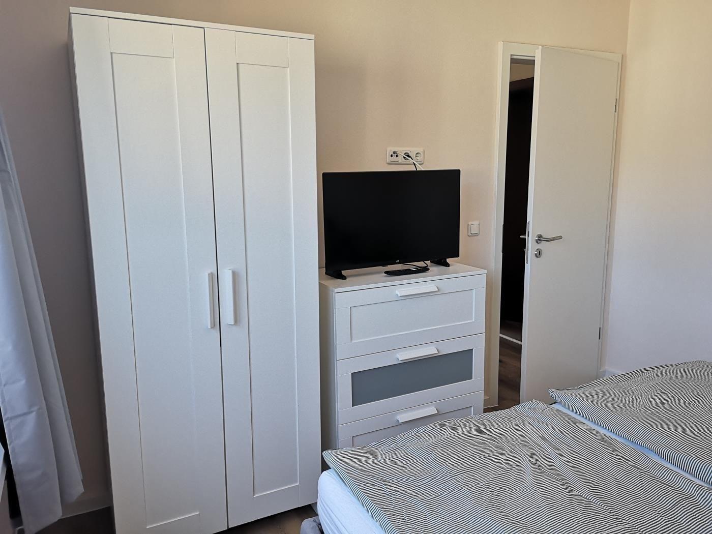 Die Wohnung 2 ist wie folgt aufgeteilt: Wohnzimmer mit integrierter Küchenzeile, Essecke und Sitzecke, Kinderzimmer mit einem Bett, Schlafzimmer mit Doppelbett und die Dusche mit WC