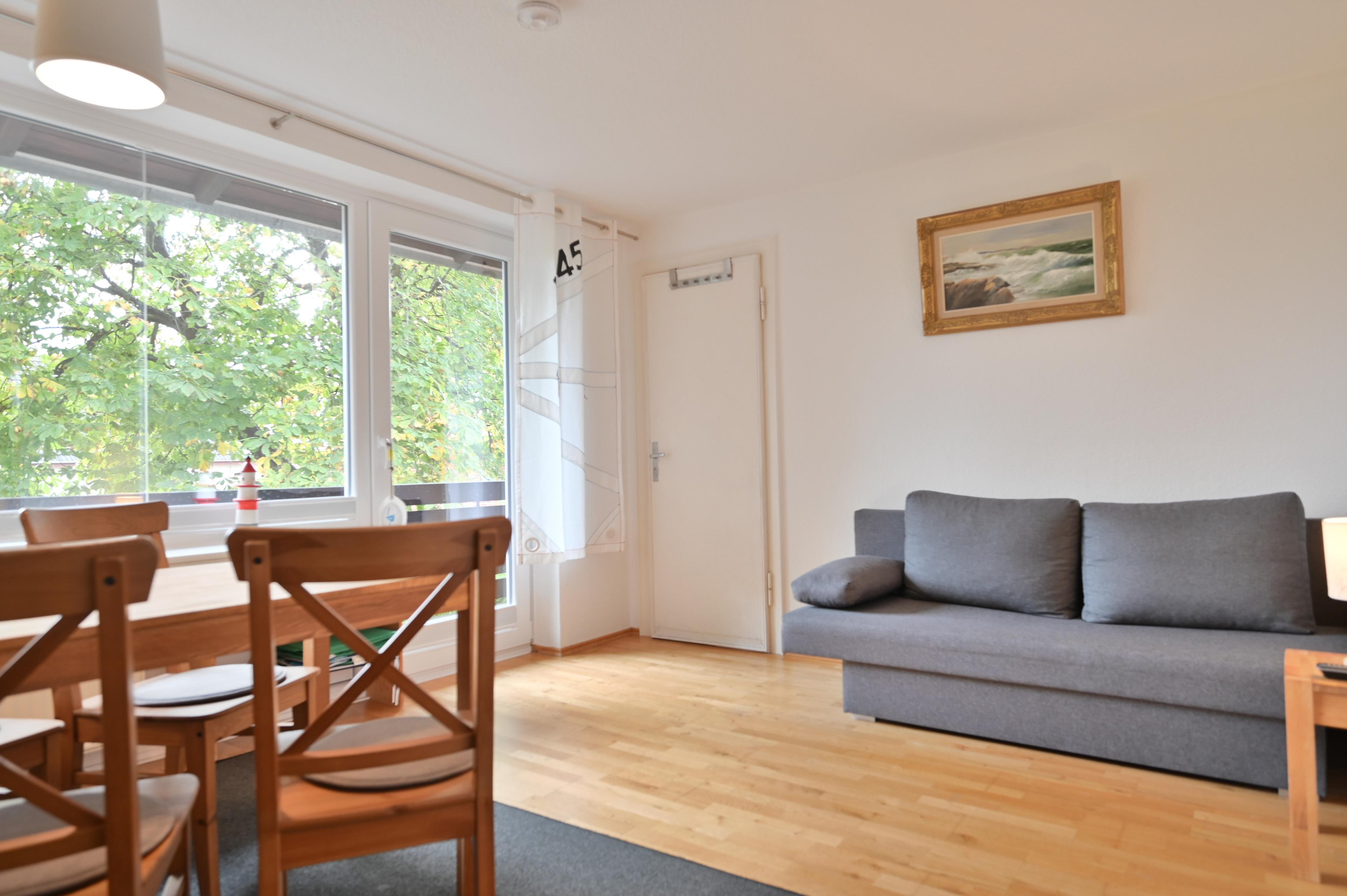 In herrlich ruhiger Kurparklage befindet sich diese kleine Ferienwohnung im 1. OG einer kleinen familiären Appartementanlage, mit nur fünf weiteren Wohnungen, die zum Teil ausschließlich von den Eigentümern genutzt werden. Die Ferienwohnung verfügt über zwei Zimmer und bietet bis zu vier Schlafplätze (Schlafzimmer mit zwei Einzelbetten, Wohnzimmer mit Schlafcouch). Im Wohnzimmer ist Echtholz-Eichenparkett verlegt, im Schlazimmer gleichfalls Eichenparkett und in Flur und Küche befinden sich Echtholzdielen. Die kleine separate Küche verfügt über eine Einbauküche mit E-Herd mit Cerankochfeld, Kühl-Gefrierschrank, Mikrowelle, Kaffeemaschine, Wasserkocher etc. Im Wohnzimmer gibt es einen Flachbild-Sat-Fernseher. Das Duschbad ist im Jahr 2019 grundlegend modernisiert worden inklusive neuer Fliesen und Fußbodenheizung.