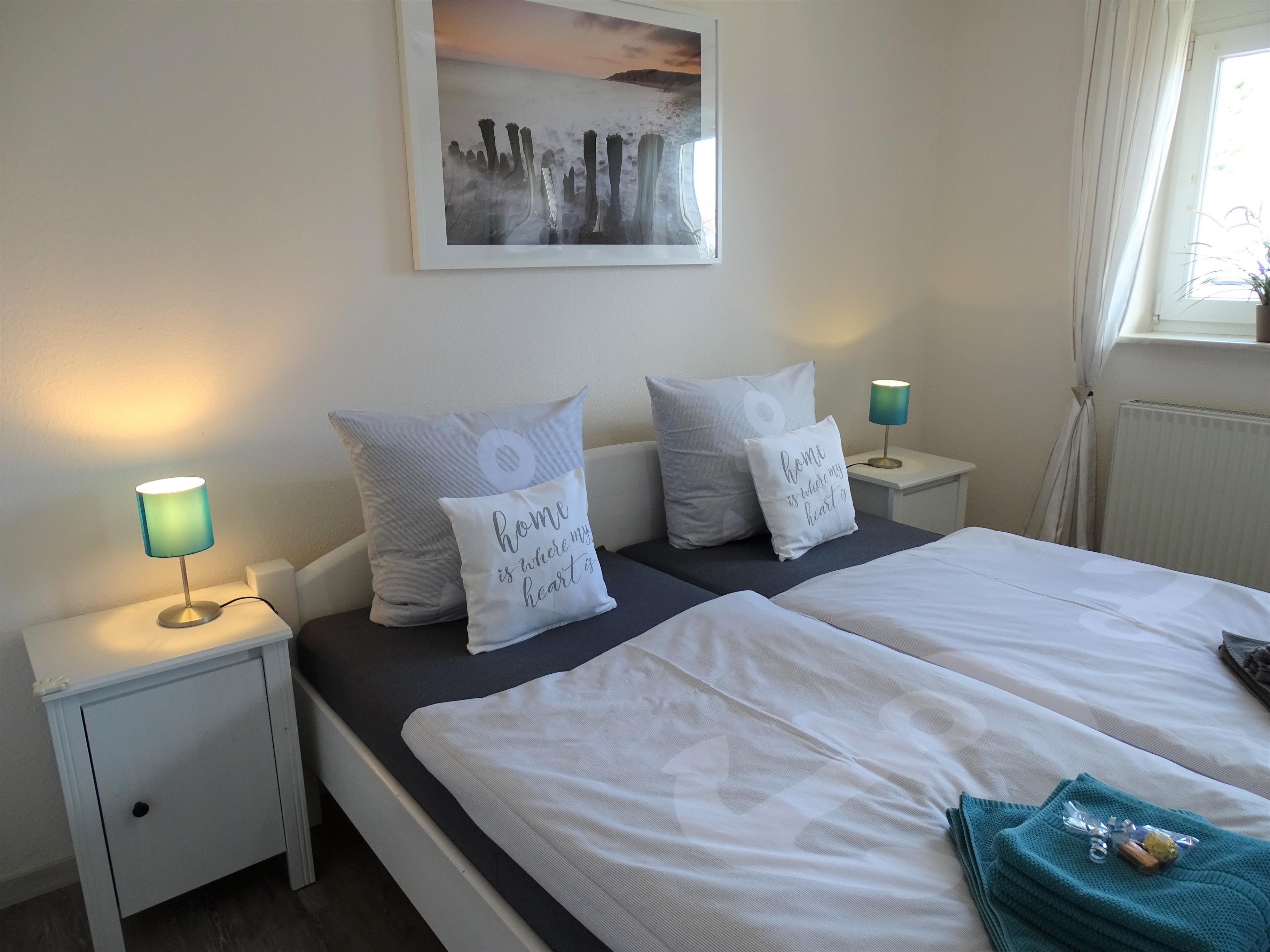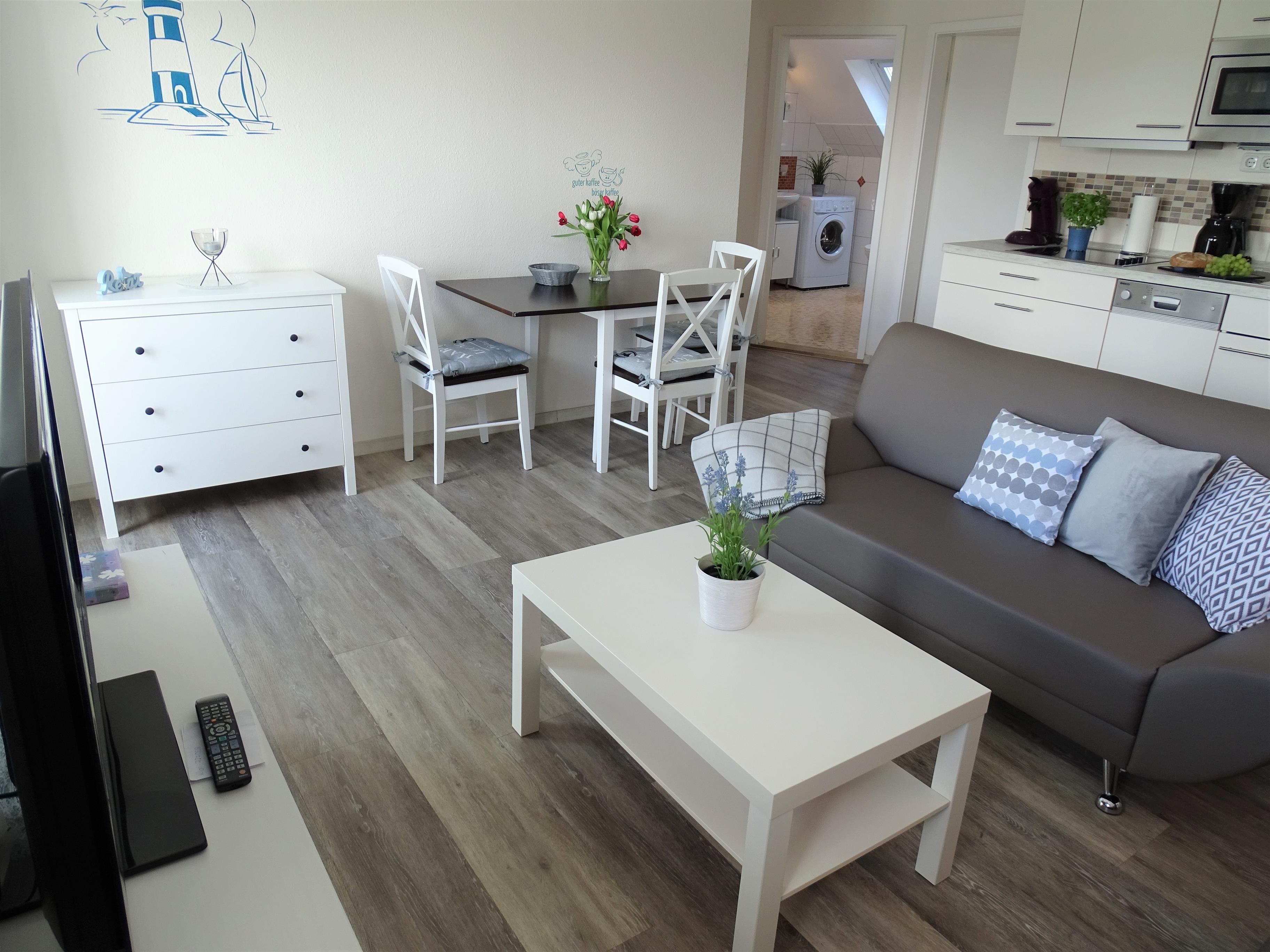 Aufgeteilt ist das moderne Ferienobjekt in Wohnzimmer mit Flachbildfernseher, DVD- Player, WLAN Internetzugang, neuer Küchenzeile, Balkonzugang, 2 Schlafzimmer, eines mit Doppelbett und eines mit 2 Einzelbetten. Hier kann sich die ganze Familie während des Ostseeurlaubes erholen. Der Essbereich befindet sich im Wohnzimmer, dort können Sie am Esstisch 80x80cm mit 4 Stühlen Ihre Speisen zu sich nehmen.