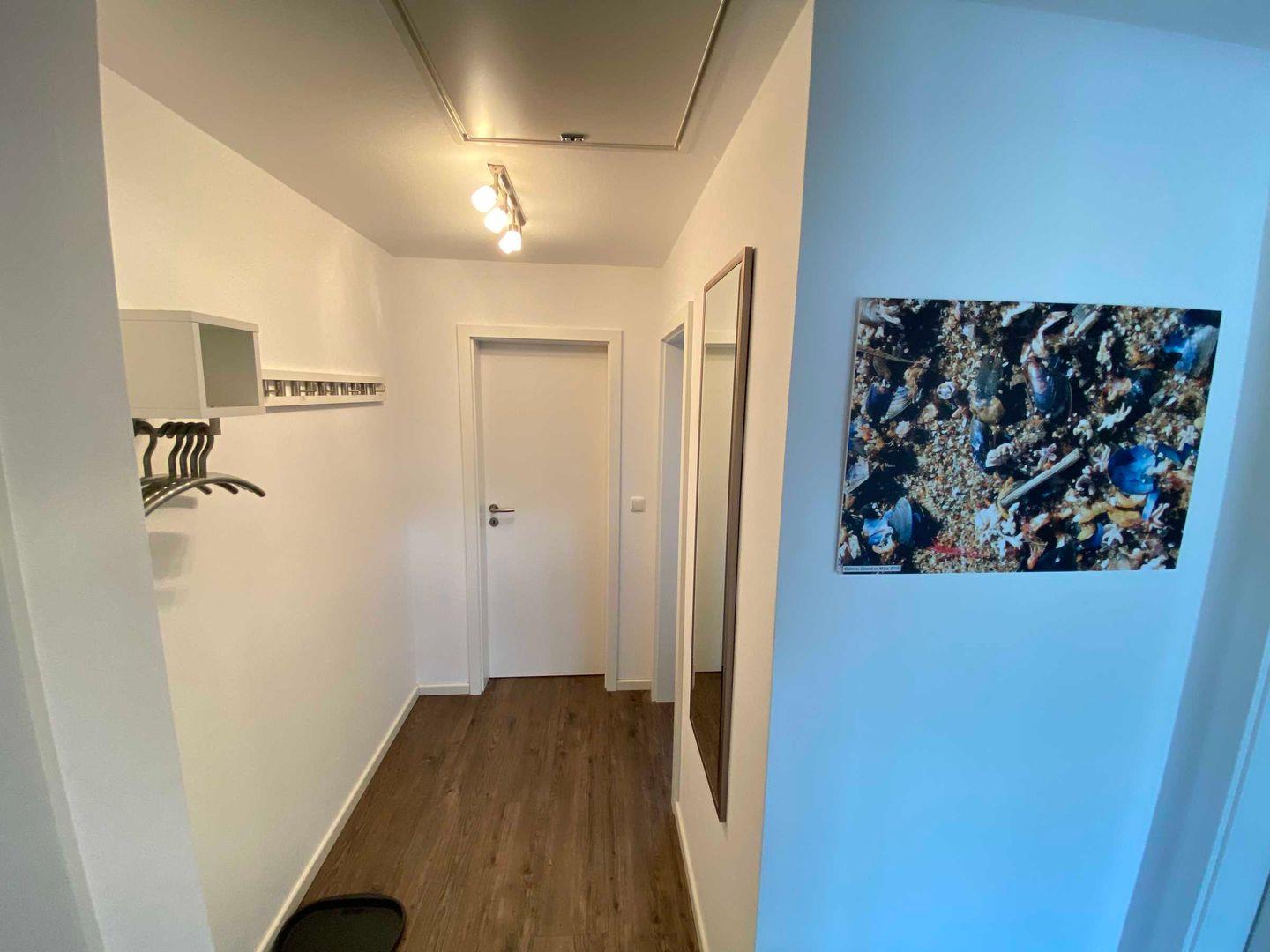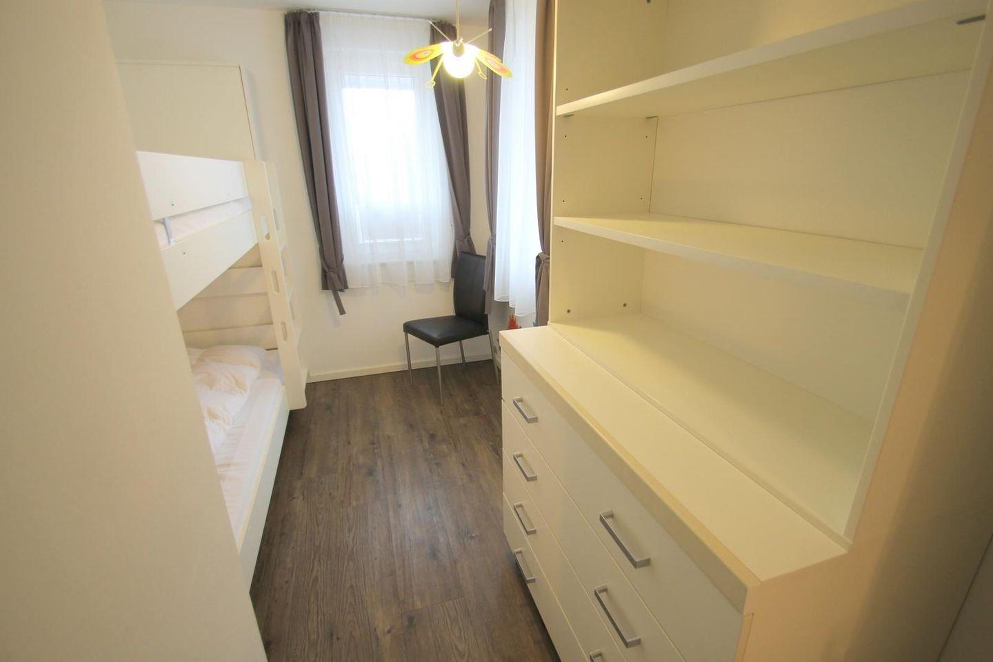 Schöne Wohnung mit Balkon im Obergeschoss einer Doppelhaushälfte. Lichtdurchflutete Wohnung für insgesamt bis zu sechs Personen. Das Wohnzimmer mit Schlafsofa (180 x 200 cm) und die offene Küche mit modernsten Elektrogeräten lässt keine Wünsche übrig. Ein Schlafzimmer mit Doppelbett und ein Schlafzimmer mit Etagenbett (auch geeignet für Erwachsene). Das moderne Tageslichtduschbad mit bodentiefer Dusche bietet viel Komfort. BluRay-Player, HiFi mit Ipod Docking und Verdunklungsvorhänge ergänzen die Komfortausstattung. Ein PKW-Stellplatz mit kostenpflichtiger Wallbox steht Ihnen direkt vor dem Haus zur Verfügung. Ihr Urlaubsdomizil verfügt über eine Nespresso-Maschine. Wir möchten Sie bitten, entsprechende Kapseln mitzubringen, da diese in der Wohnung nicht vorrätig sind. Waschmaschine und Trockner können gemeinschaftlich mit der unteren Wohnung genutzt werden.