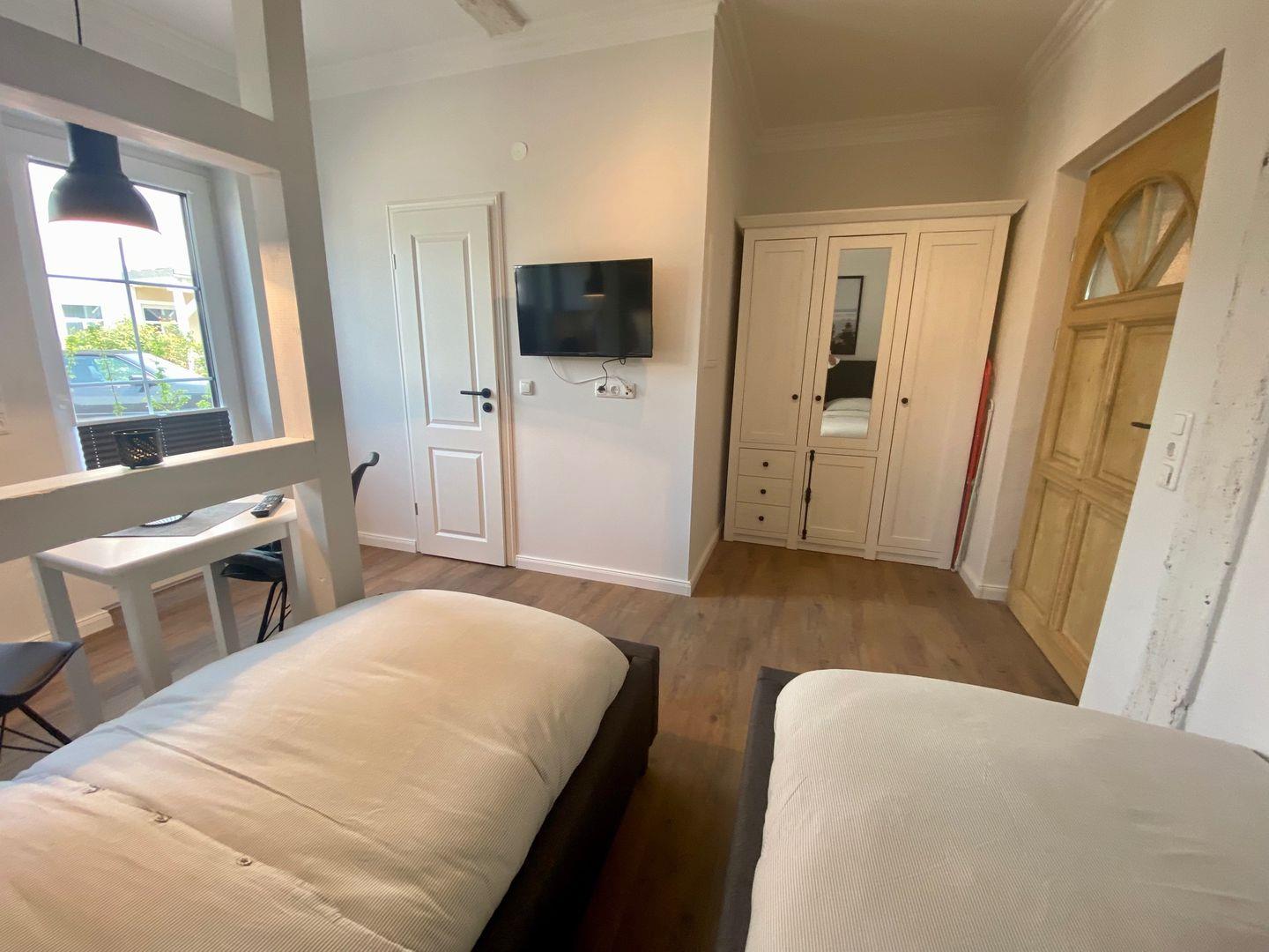 Diese ehemalige Remise wurde behutsam renoviert. Die lässig-modern gehaltenen Innenräume wurden liebevoll im urbanen Landhausstil gestaltet. Bei der Einrichtung wurde großer Wert auf Komfort gelegt. Farben und Materialien sind harmonisch aufeinander abgestimmt Im Objekt gibt es insgesamt 5 Appartements. Das Herzstück bildet ein Saal mit großem Esstisch für 12 Personen. Daher eignet sich dieses Objekt auch sehr gut für einen Urlaub mit mehreren kleinen Familien, die auch mal gerne zusammen sitzen möchten. Das Appartement "Kleine Muschel" empfängt Sie mit einem offenen Wohn / Schlaf- und Küchenbereich und hält ein modernes Bad für Sie bereit. Es erwarten Sie 2 Einzelbetten (je 90x200 cm) ein Kleiderschrank und TV. Genießen Sie die Ruhe und den charmanten Hofcharakter auf Ihrer eigenen, möblierten Terrasse. Der WLAN-Anschluss ist inklusive.