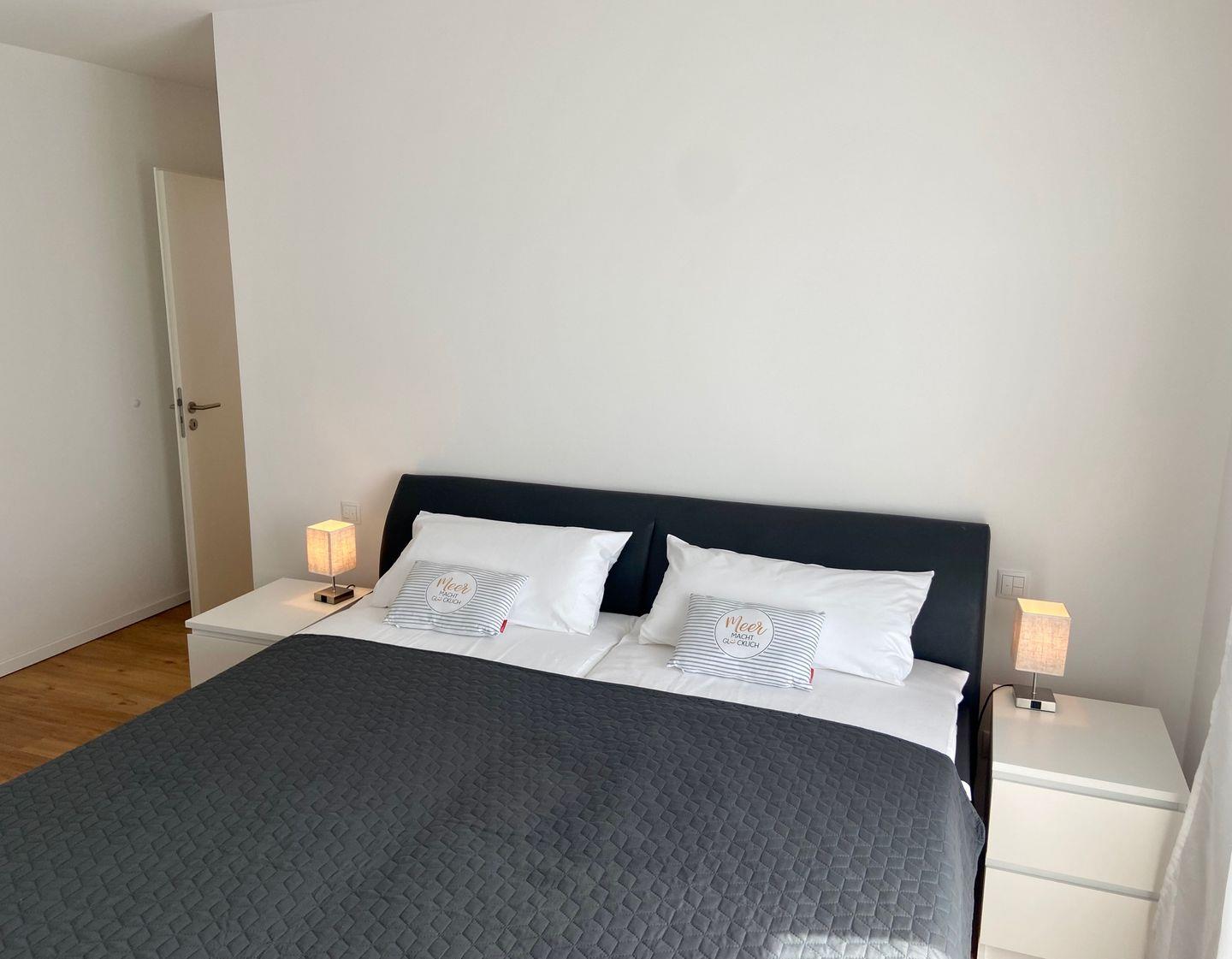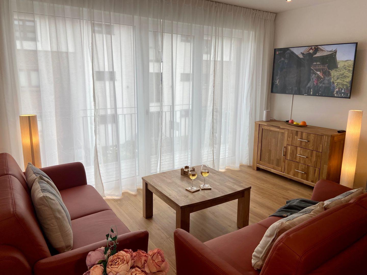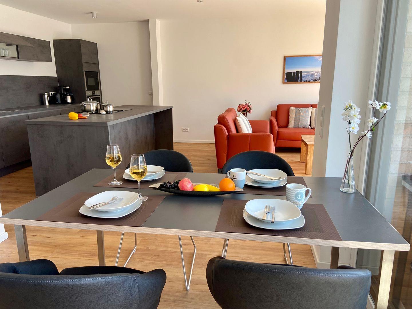 Es erwartet Sie eine äußerst hochwertig ausgestattete und geschmackvoll eingerichtete Ferienwohnung, die mit 2 separaten Schlafzimmern ausreichend Raum für 4 Personen bietet, um einen entspannten Urlaub in einem herrlichen Ambiente zu verleben. Fußbodenheizung, elektrische Außenjalousien und bodentiefe Fensterelemente, die für ein offenes Raumgefühl sorgen, gewährleisten einen hohen Wohnstandard. Mittelpunkt der Ferienwohnung bildet die Design Küche mit Kochinsel in bester Ausstattung, die zum gemeinsamen Kochen einlädt, Zusätzlich gibt es einen Essbereich . Der behagliche Wohnbereich, eingerichtet mit Sofa und TV, bietet Blick und Zugang auf die großzügig angelegte Südterrasse mit Garten- und Loungemöbeln, um den Tag bei einem Glas Wein ausklingen zu lassen. Beide Schlafzimmer bieten einen großzügigen Ausblick und sind mit Doppelbetten (2 x 90x200 cm) in unterschiedlichen Härtegraden (H2 und H3) ausgestattet. Beide Schlafräume verfügen über geräumige Schränke mit ausreichend Stauraum für die Urlaubsgarderobe. Das Bad ist sehr hochwertig und modern, ausgestattet mit einer Walk-In-Regendusche. Außerdem verfügt die Wohnung über ein Gäste-WC. Eine Waschmaschine befindet sich in einem Abstellraum in der Wohnung. WLAN steht selbstverständlich zur kostenlosen Nutzung zur Verfügung.