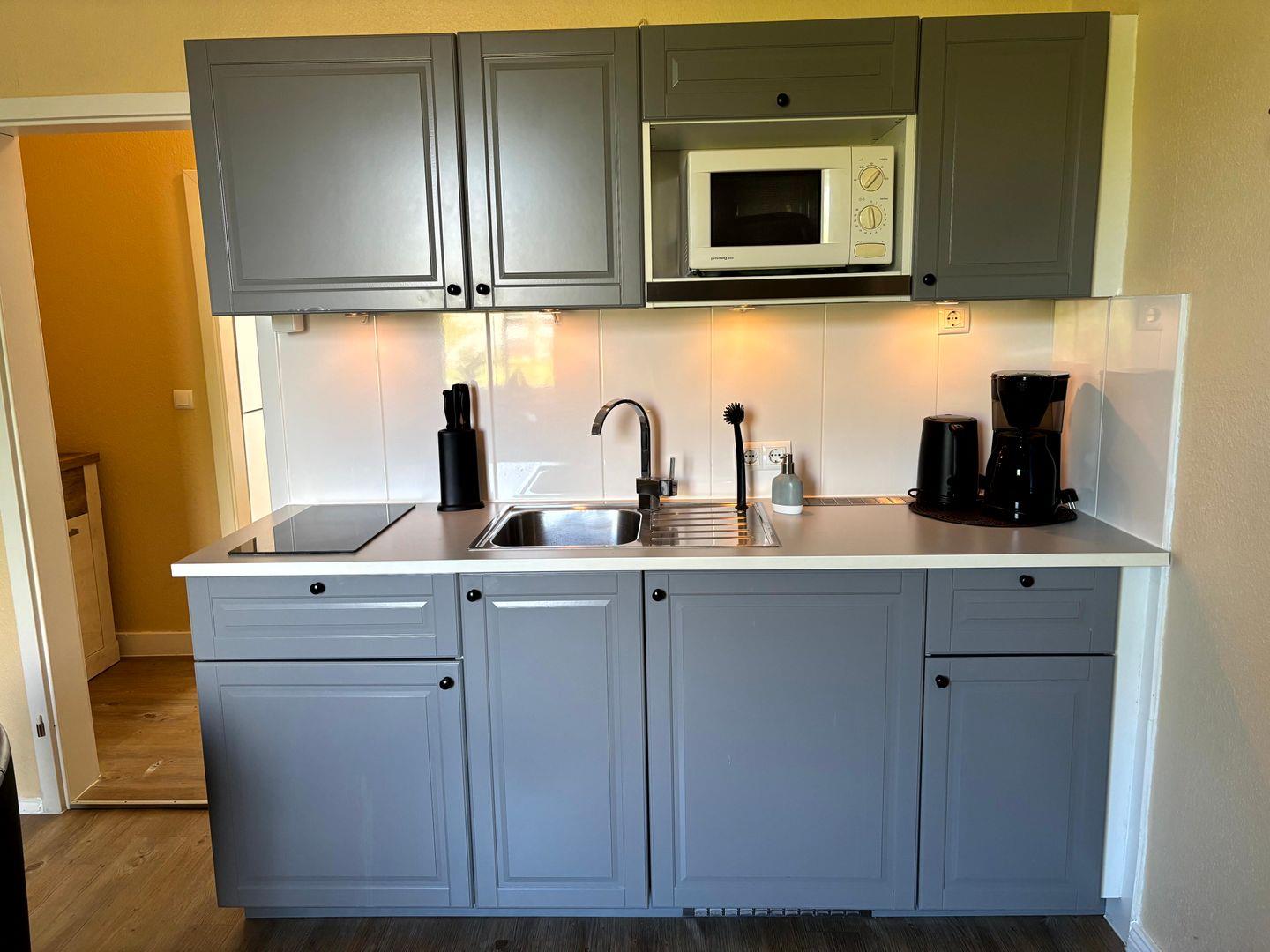 Ceranfeld mit 4 Kochzonen. Kaffeemaschine. Toaster. Eierkocher. Mikrowelle.