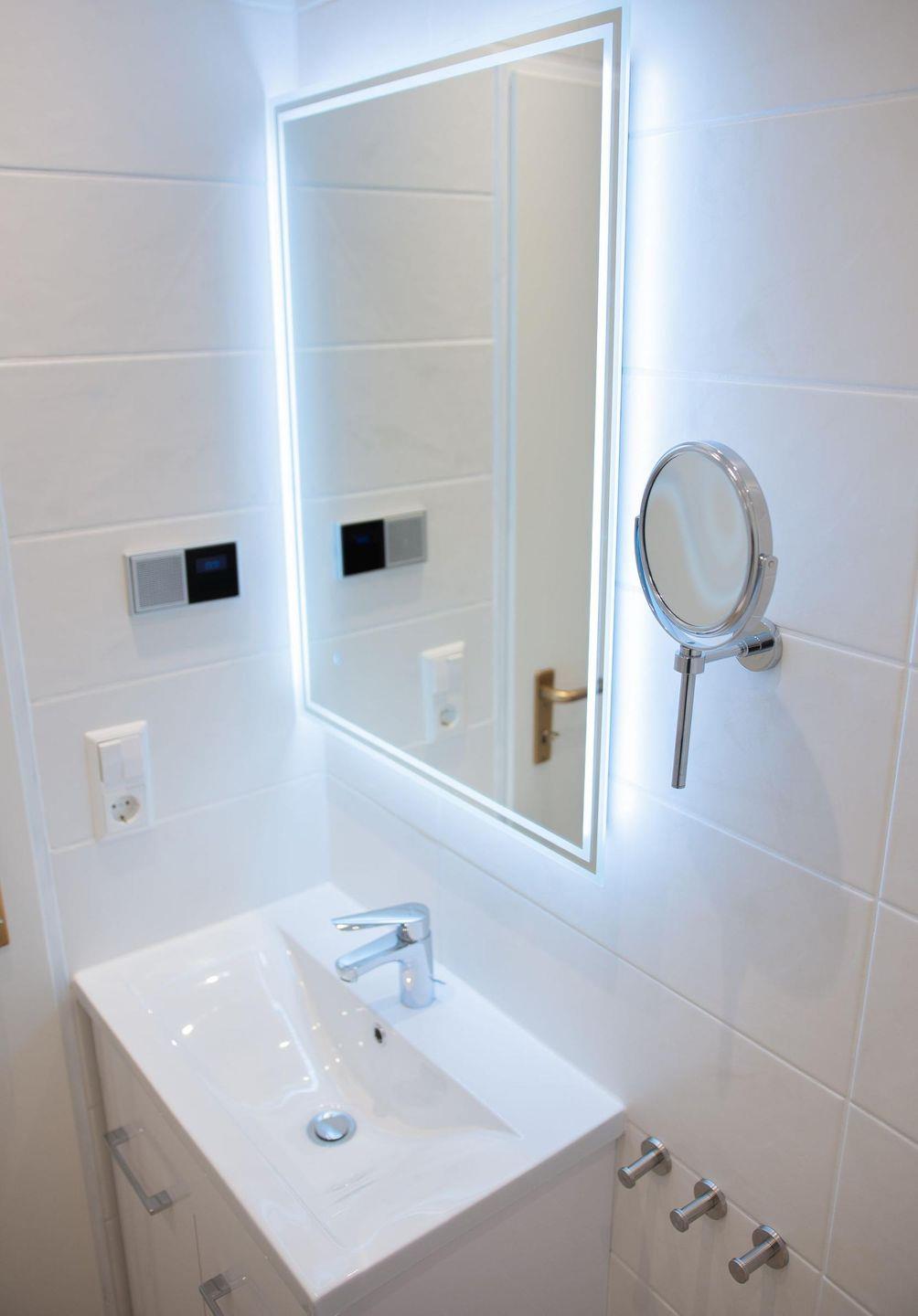 - Badezimmer mit Dusche, WC, Waschtisch, Kosmetikspiegel
