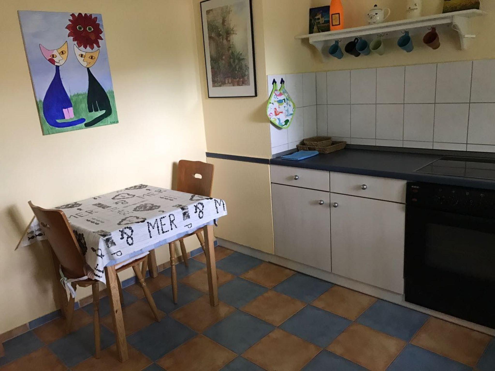 Küche ca. 10m² mit Essplatz, Kühlschrank, Ceran-Herd, Geschirrspüler. Geschirr usw.. Terrasse mit Gartenmöbeln. Autoabstellplatz. Kaminzimmer