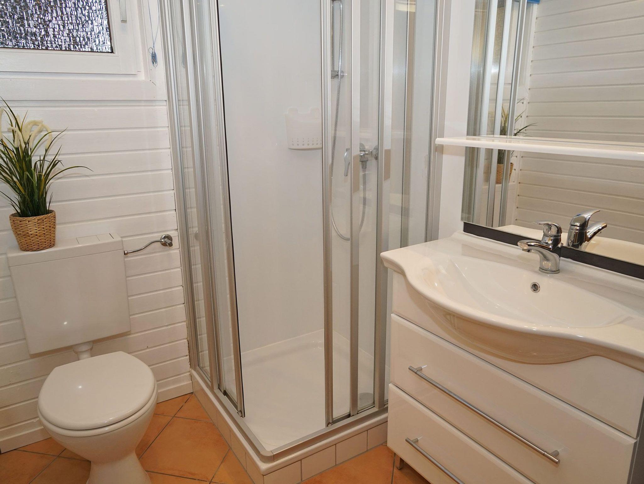 Blockhaus mit grosser Rasenfläche und eigenem Pkw-Stellplatz, ideal für Urlauber mit bis zu 4 Personen.