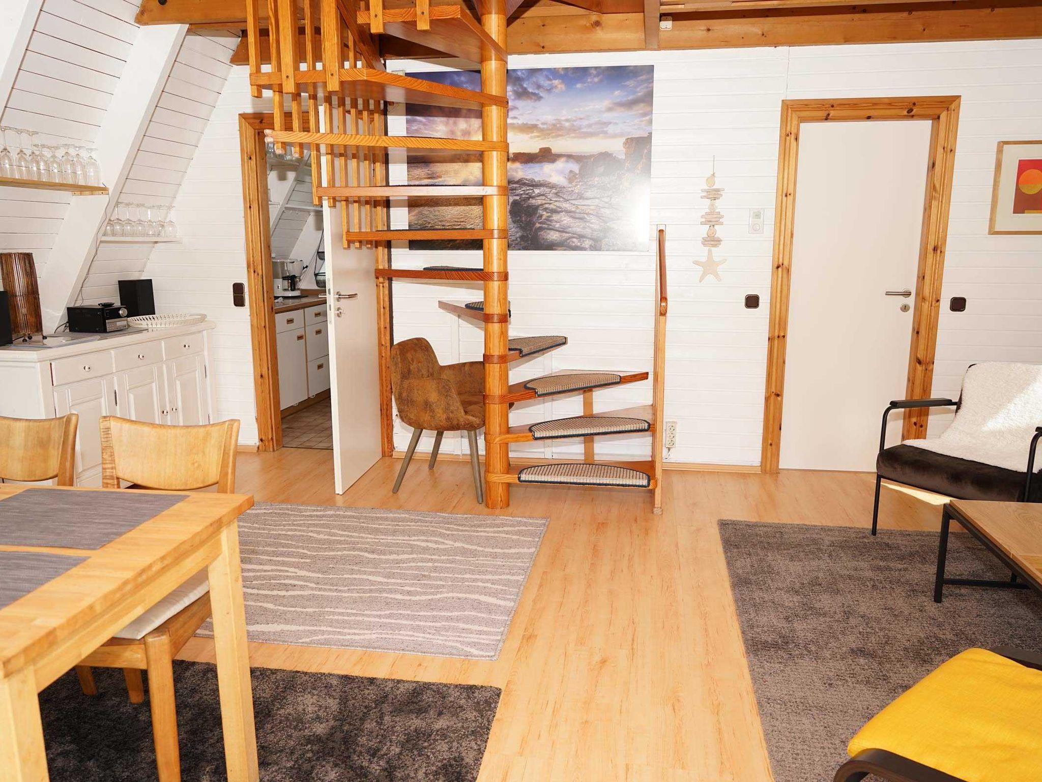 Unser Zeltdachhaus verfügt über zwei getrennte Schlafräume (im oberen Bereich des Hauses), kombiniertes Wohn- und Esszimmer, vollwertige Küche und Terrasse. Ein Kinderreisebett und Kinderhochstuhl sind immer vorhanden und kostenlos nutzbar.