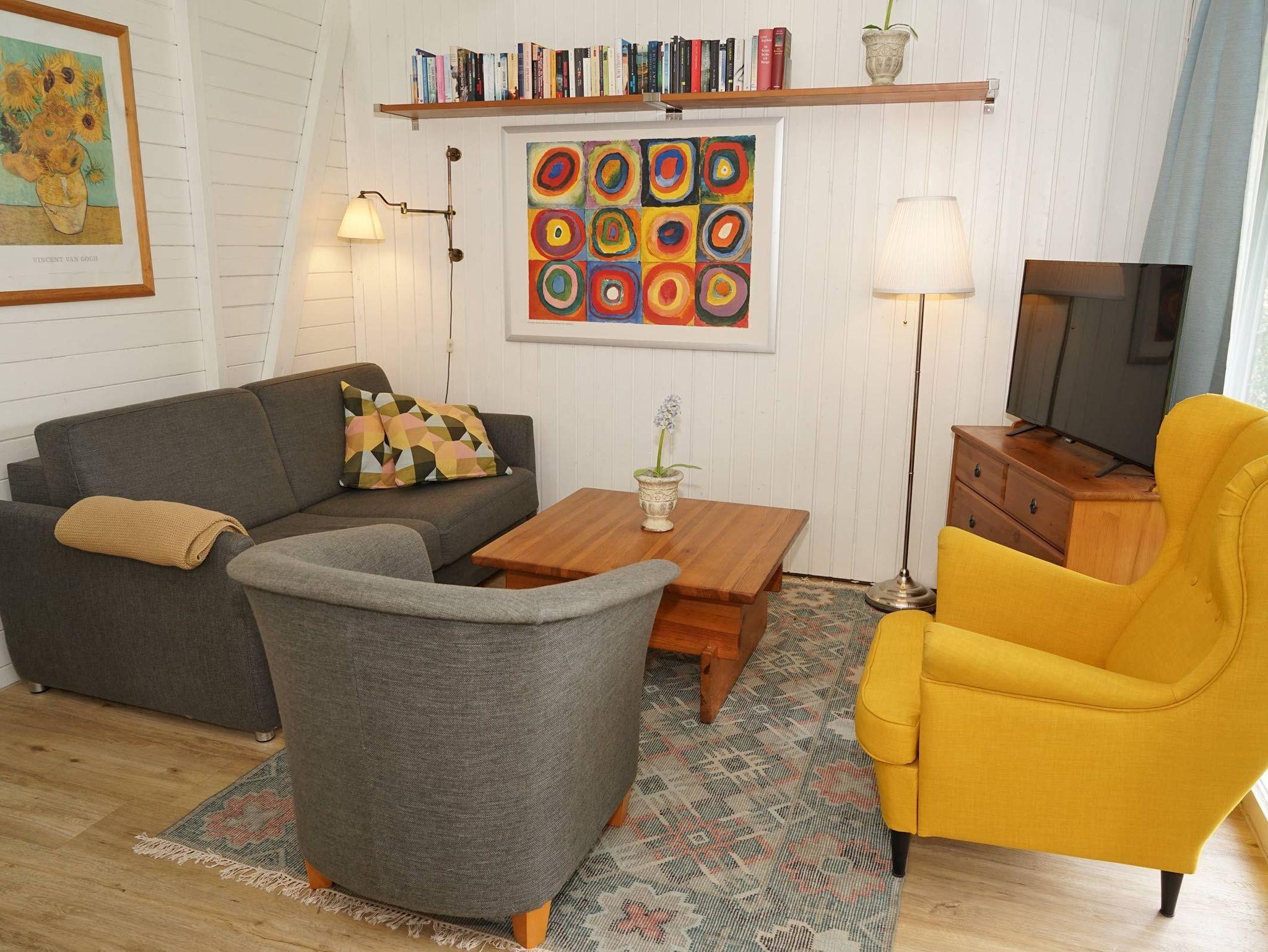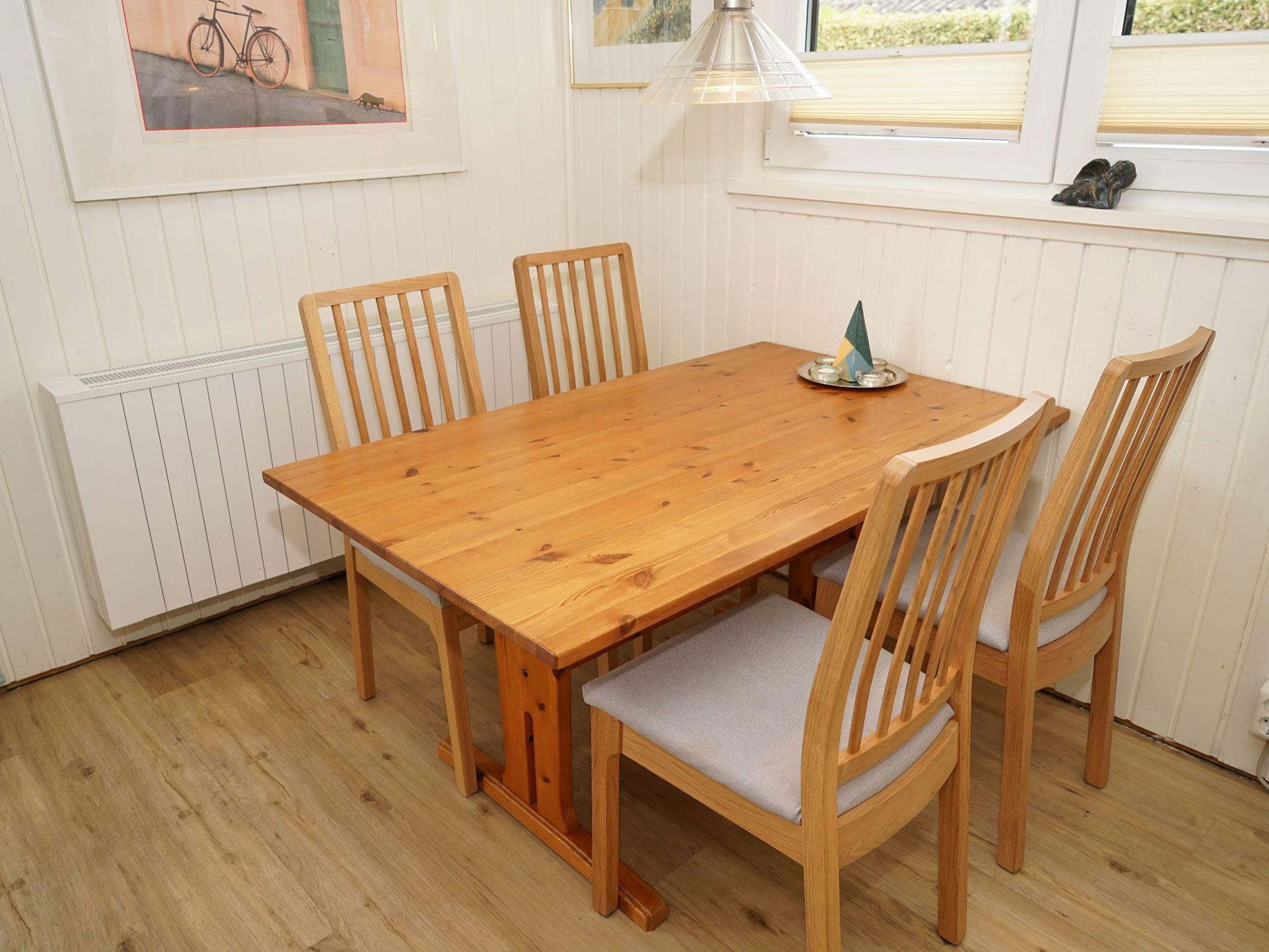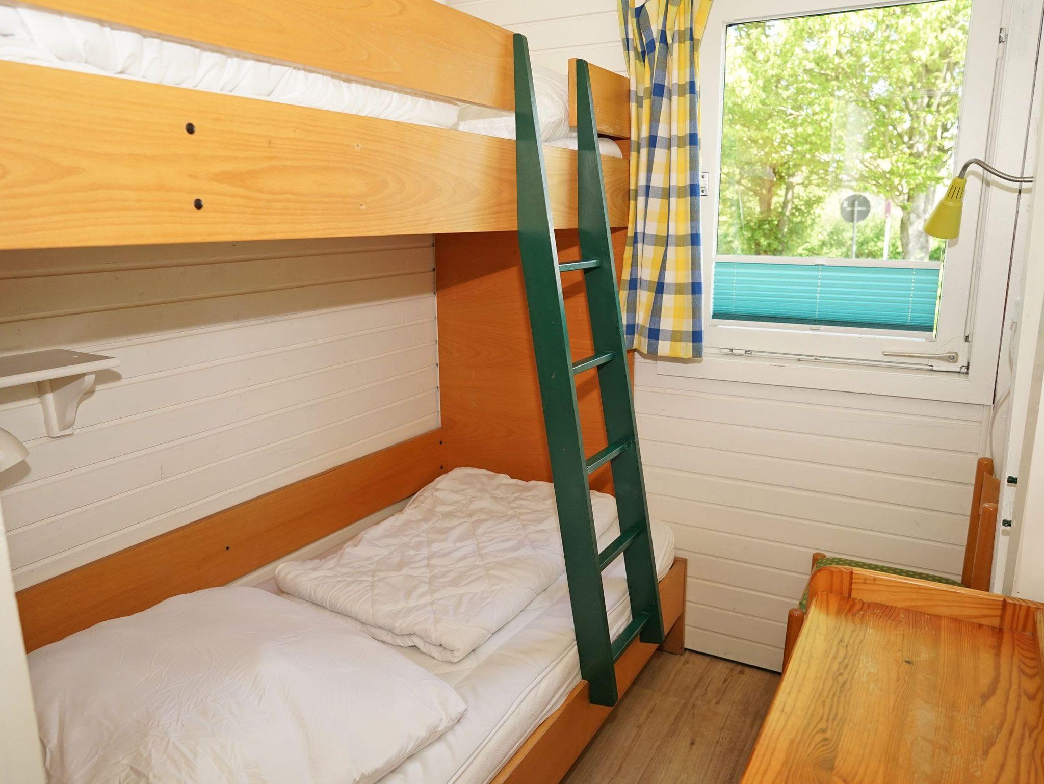 Wohnen auf einer Ebene. Zur Ausstattung gehört eine vollwertige Küche (mit Geschirrspüler), 2 getrennte Schlafzimmer (in einem Schlafzimmer befindet sich ein Etagenbett für 2 Personen), Flur, Bad mit Dusche und Wohnzimmer mit Essecke. Die überdachte und windgeschützte Terrasse erreichen Sie über das Wohnzimmer. Bringen Sie bitte Handtücher und Bettwäsche selber mit.