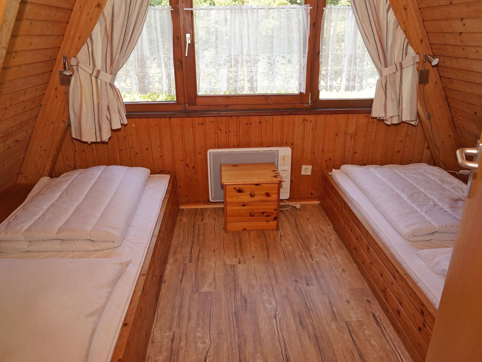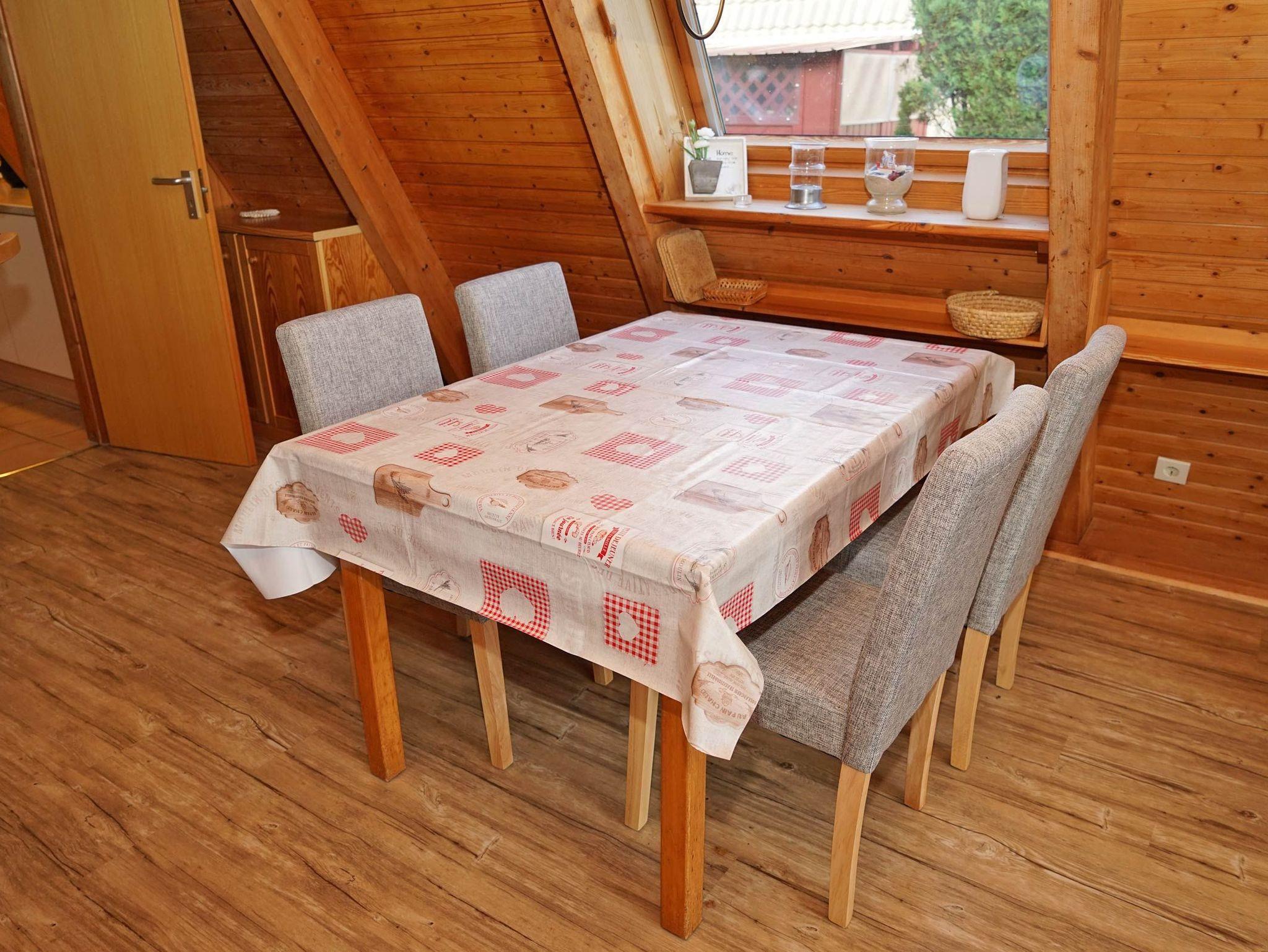 Das Zeltdachhaus verfügt über zwei getrennte Schlafräume (im oberen Bereich des Hauses), kombiniertes Wohn- und Esszimmer, vollwertige Küche und Terrasse. Ein Kinderreisebett und Kinderhochstuhl sind immer vorhanden und kostenlos nutzbar.