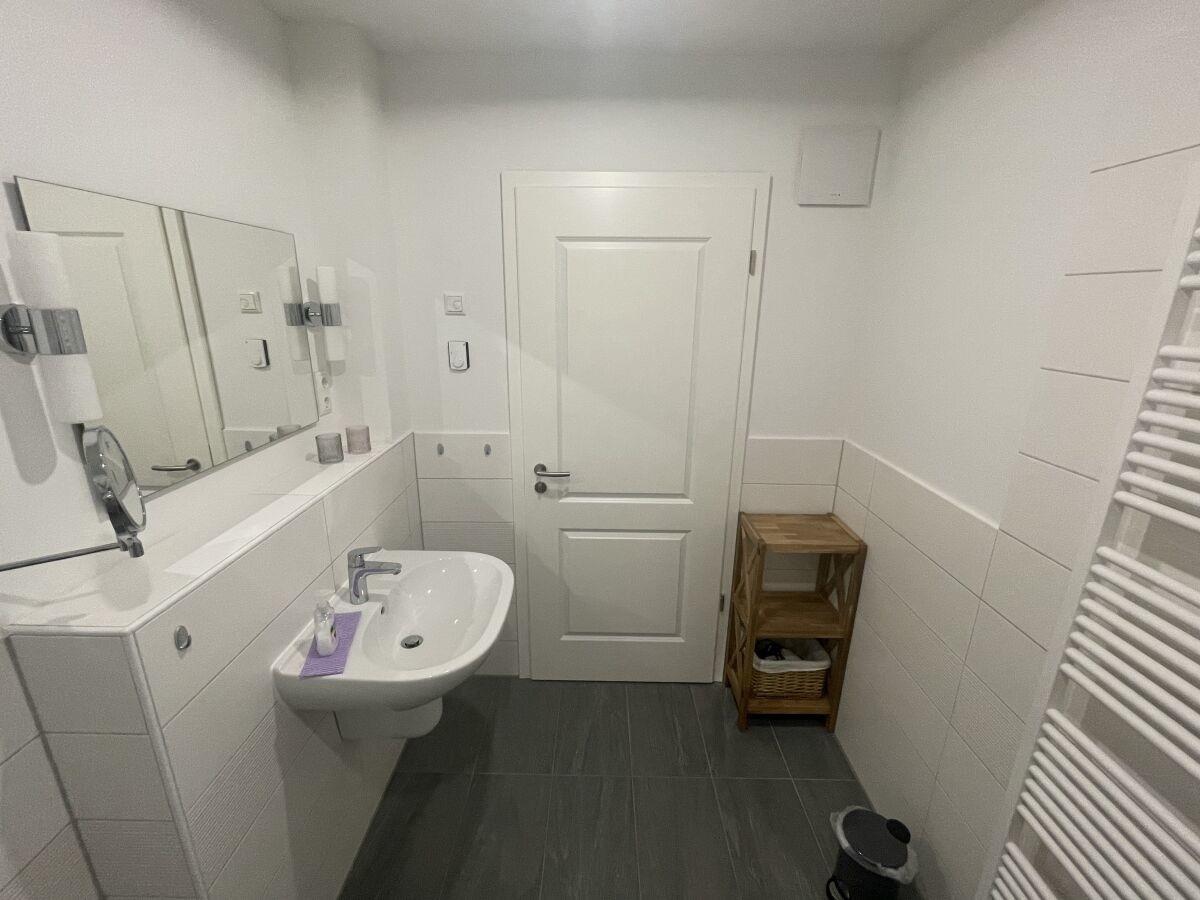 Angrenzend zum Wohnbereich liegt der Schlafbereich mit einem großen Doppelbett, der durch einen Vorhang optisch vom Rest der Wohnung getrennt ist. Vom Flur aus gelangt man zum Badezimmer mit ebenerdiger Dusche. Im Hauswirtschaftsraum ist neben Waschmaschine, Trockner und Garderobe noch reichlich Abstellplatz.