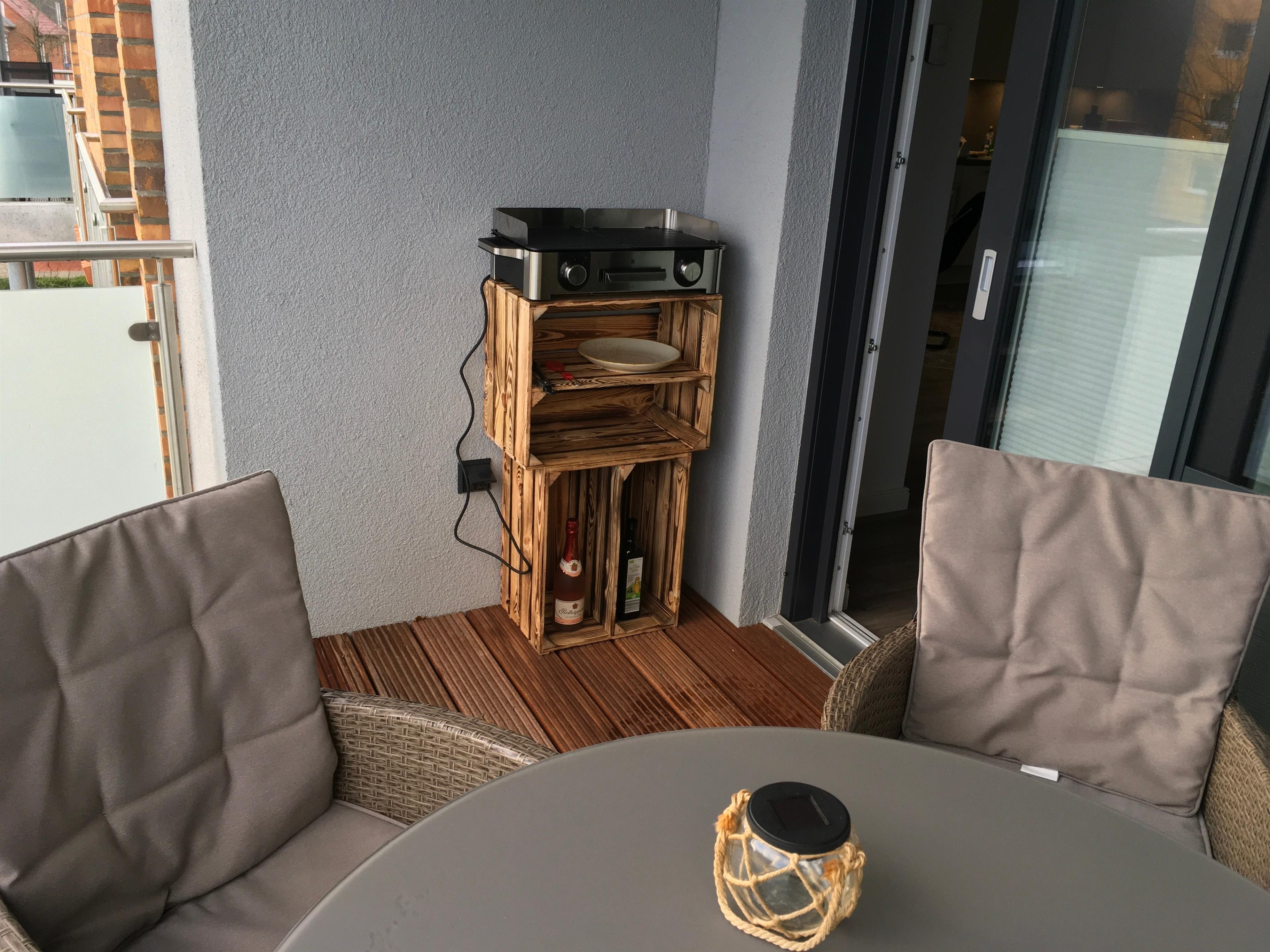 Von der Sitzecke aus sehen Sie hinter einer Baumreihe schon ein wenig die Ostsee glitzern. Diese Aussicht haben Sie auch von dem großen Balkon aus, wo Sie es sich auf den gepolsterten Gartensesseln am Tisch bequem machen können. In der Grillecke kann der vorhandene Elektrogrill aufgestellt werden.