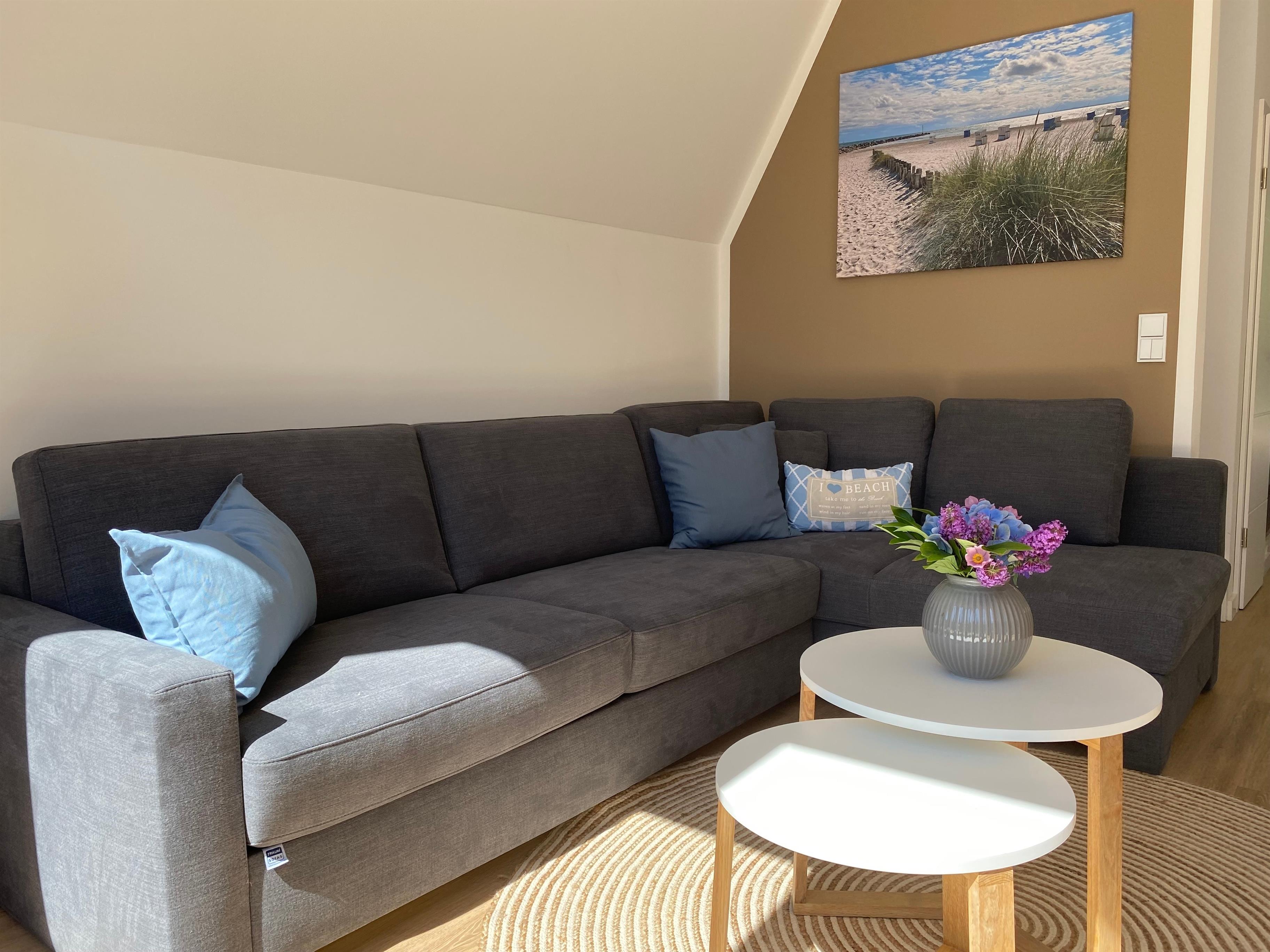 - gemütliches Wohnzimmer mit hochwertigem Ecksofa, das sich in ein Bett mit richtiger Matratze verwandeln lässt, Kamin vor der großen Fensterfront, Smart-TV und Sonoro Musikanlage