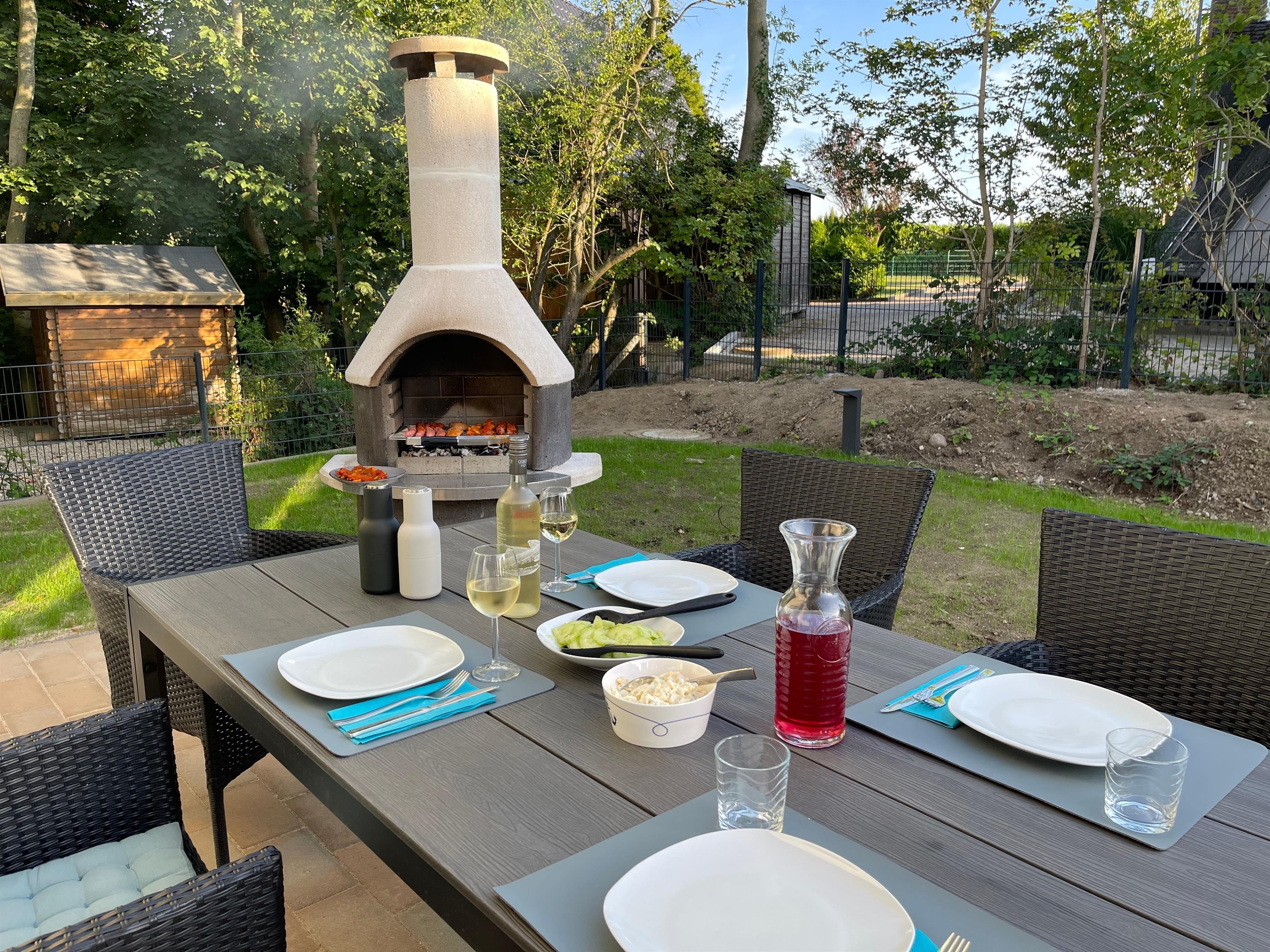 Ihr habt euren eigenen, eingezäunten Garten mit einer großen Terrasse vor dem Wohnzimmer mit Sitzgruppe und Grillkamin sowie einer zweiten Terrasse vor der Küche!
