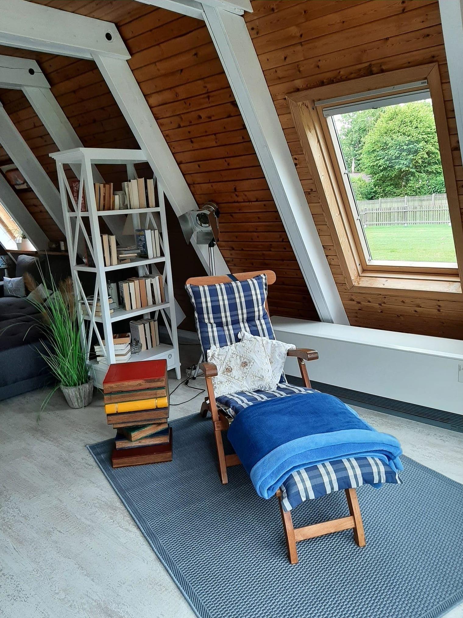 Der Lesebereich läd mit vielen Büchern und einem gemütlichen Deckchair zum chillen ein.