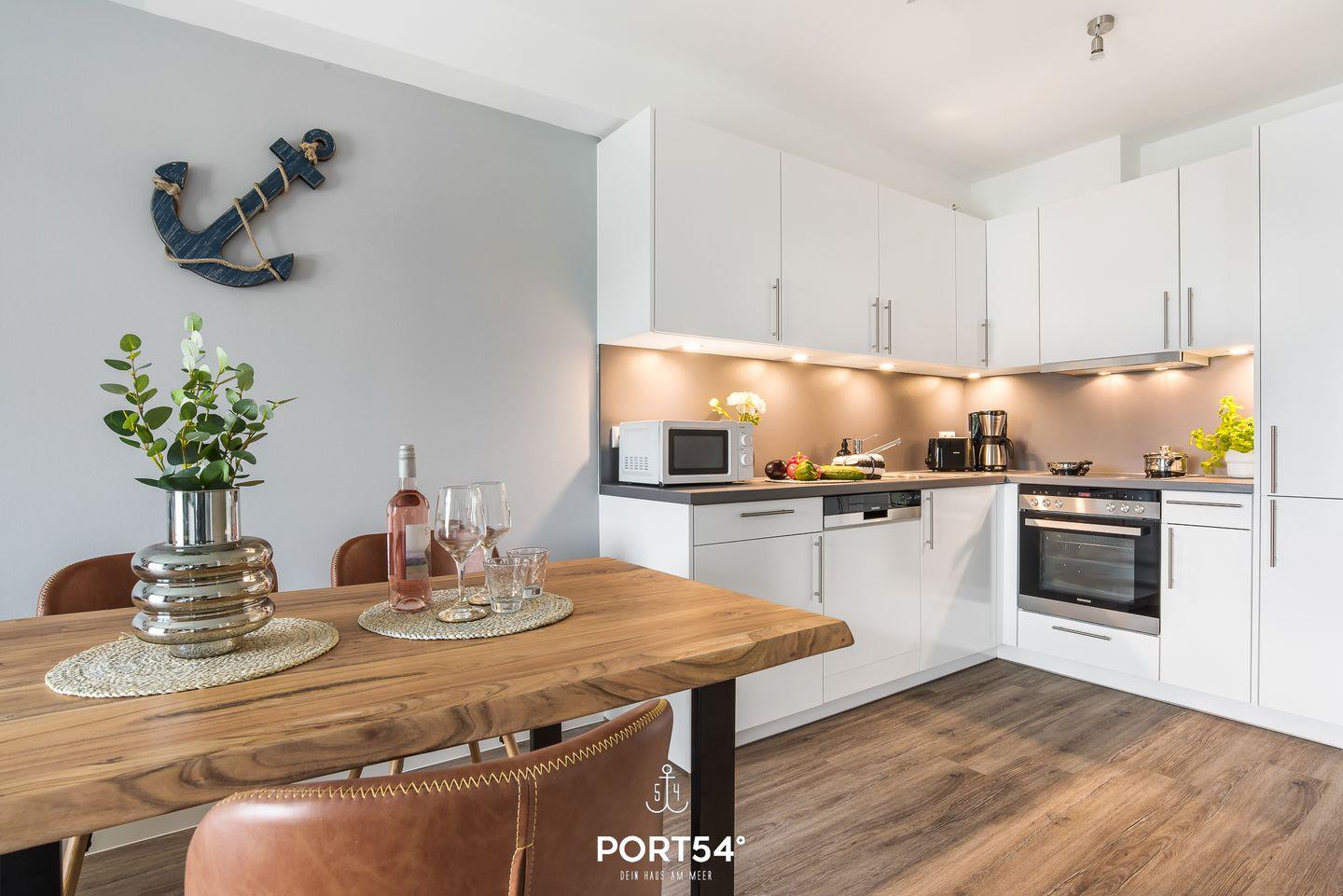 Die voll ausgestattete Küche lädt dazu ein, leckere Meisterwerke zu kreieren, die Du entweder am großzügigen Esstisch oder auf dem Balkon mit Blick durch die Bäume auf das Wasser genießen kannst. Erlebe hier unvergessliche Mahlzeiten unter freiem Himmel, begleitet vom beruhigenden Rauschen der Wellen.