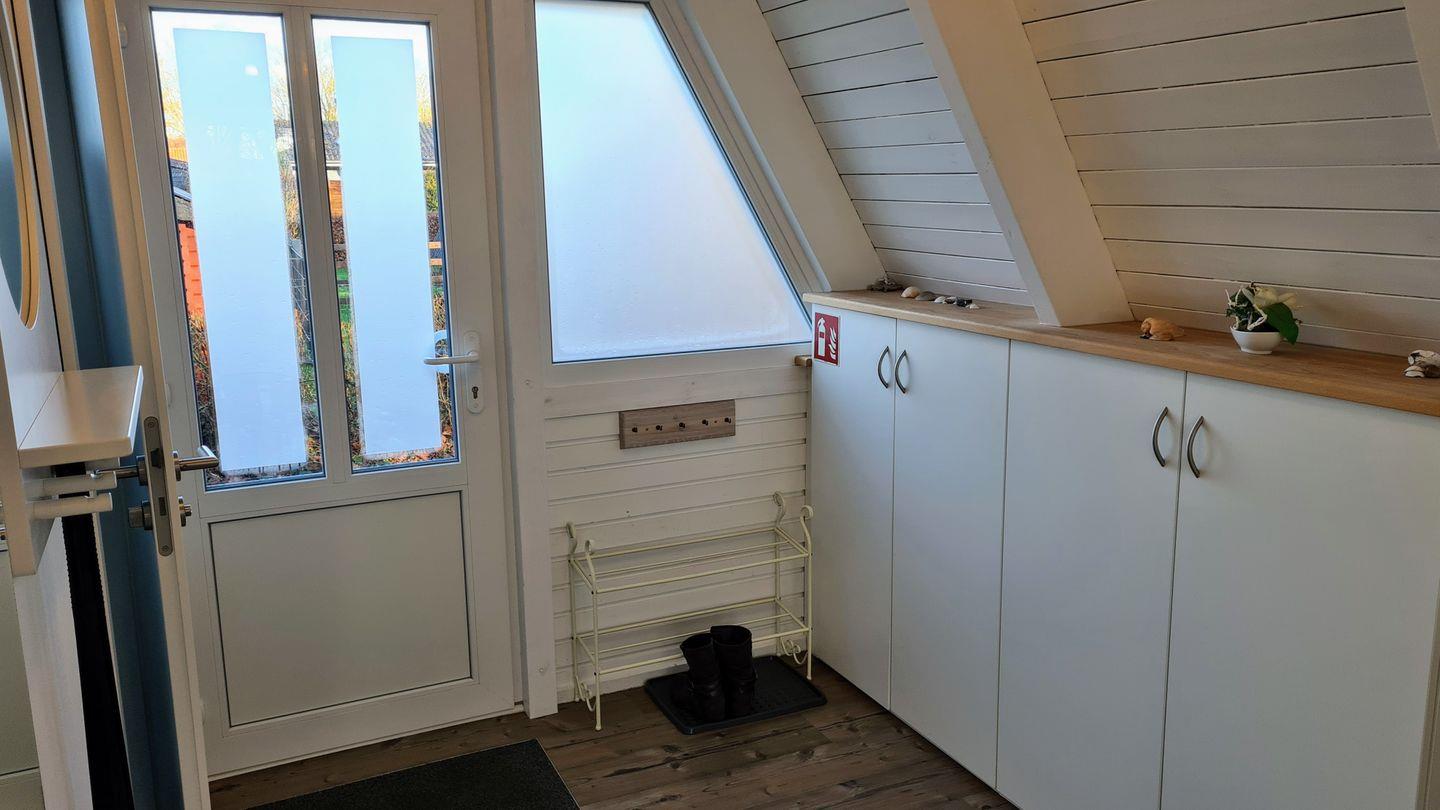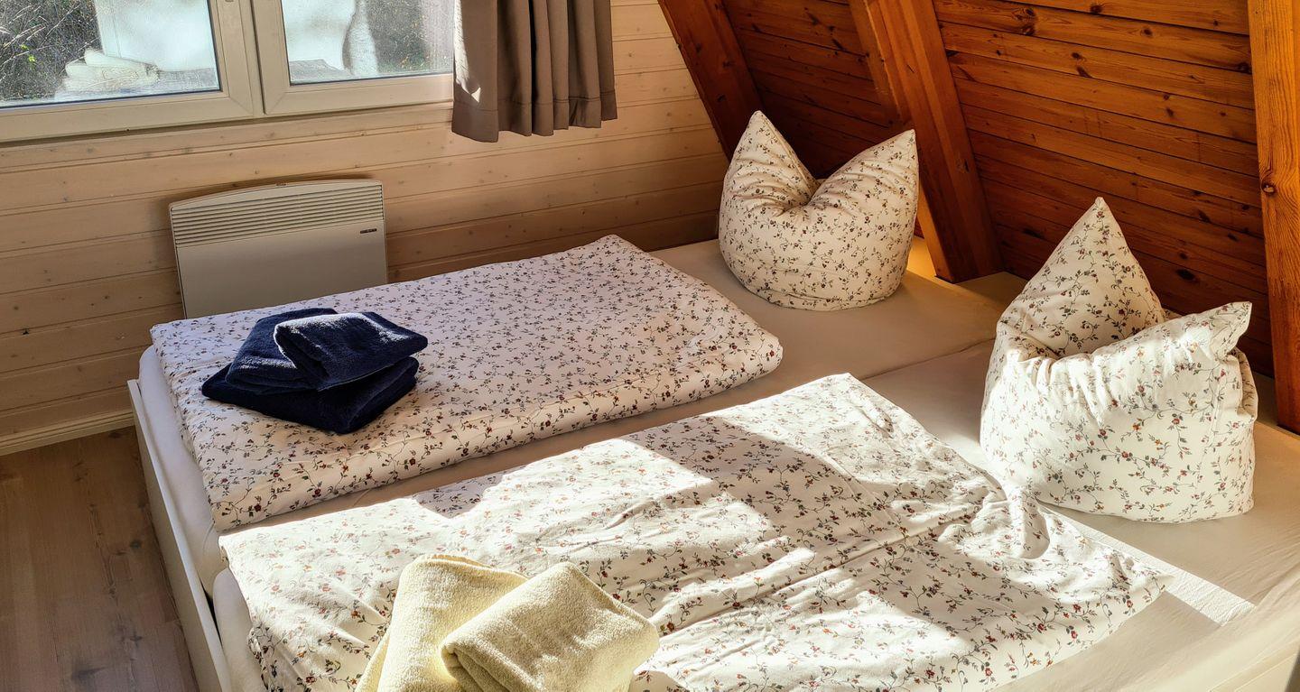 Vom Wohnbereich aus führt eine Treppe in die obere Etage. Hier erwartet Sie ein kleiner Bereich, um sich mit einem guten Buch zurückzuziehen und die beiden Schlafzimmer, eines mit Doppelbett und eines mit zwei Einzelbetten. Ein Bettchen für unsere kleinen Gäste bis 2,5 Jahre kann bei Bedarf aufgestellt werden.