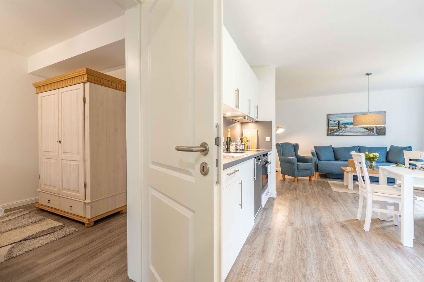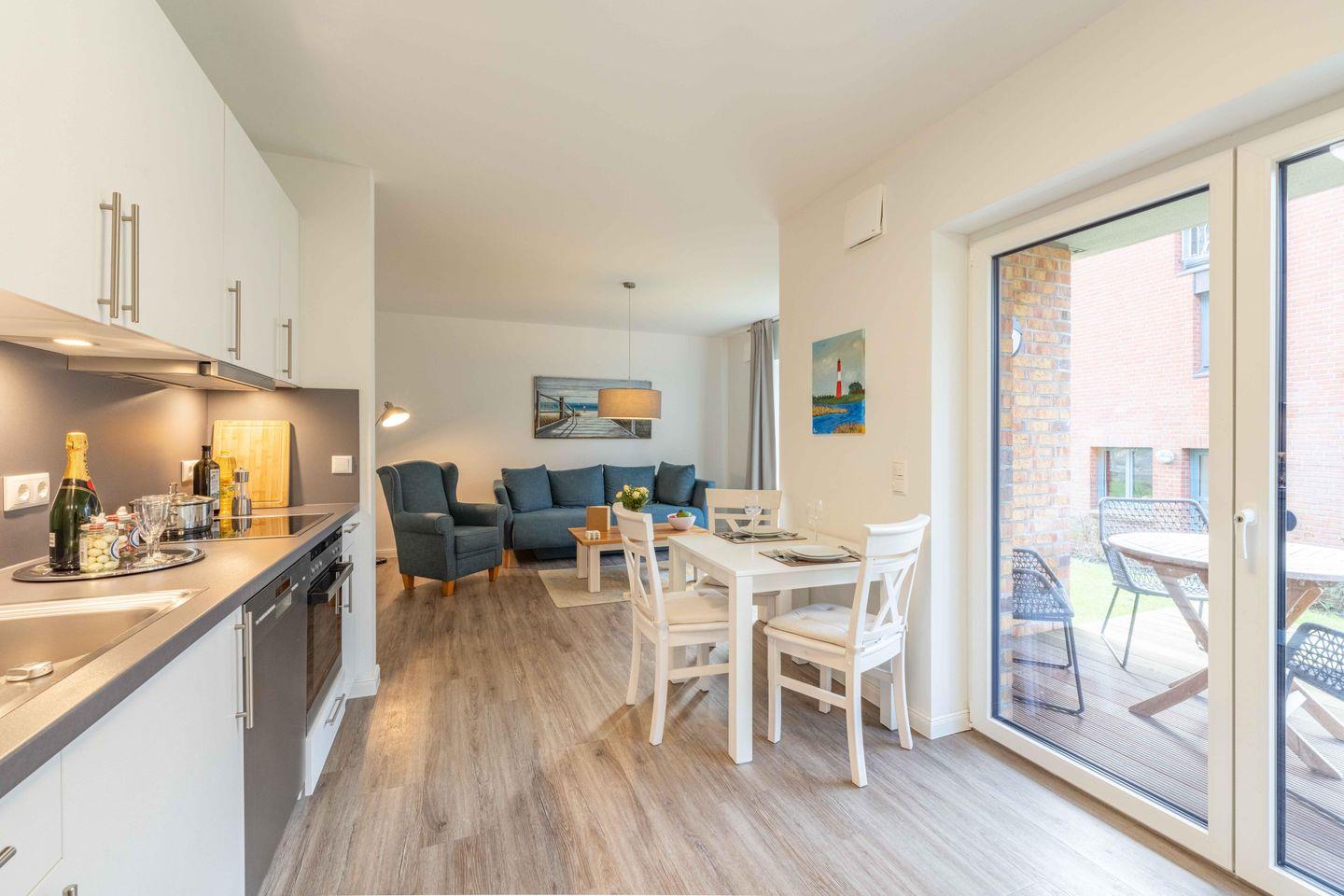 Die hochwertige Ausstattung der Ferienwohnung lässt keine Wünsche offen. Eine vollständig eingerichtete, offene Küche, die direkt in den Wohnbereich übergeht, verfügt unter anderem über einen Backofen, Geschirrspüler, einen Kühlschrank mit Gefrierfach sowie zahlreiche Küchengeräte wie eine Kaffeemaschine, einen Wasserkocher, einen Toaster und eine Espressomaschine. Hier kannst Du hervorragend selbst für Dein leibliches Wohl sorgen, während Du Dich im gemütlichen Essbereich zusammenfindest.