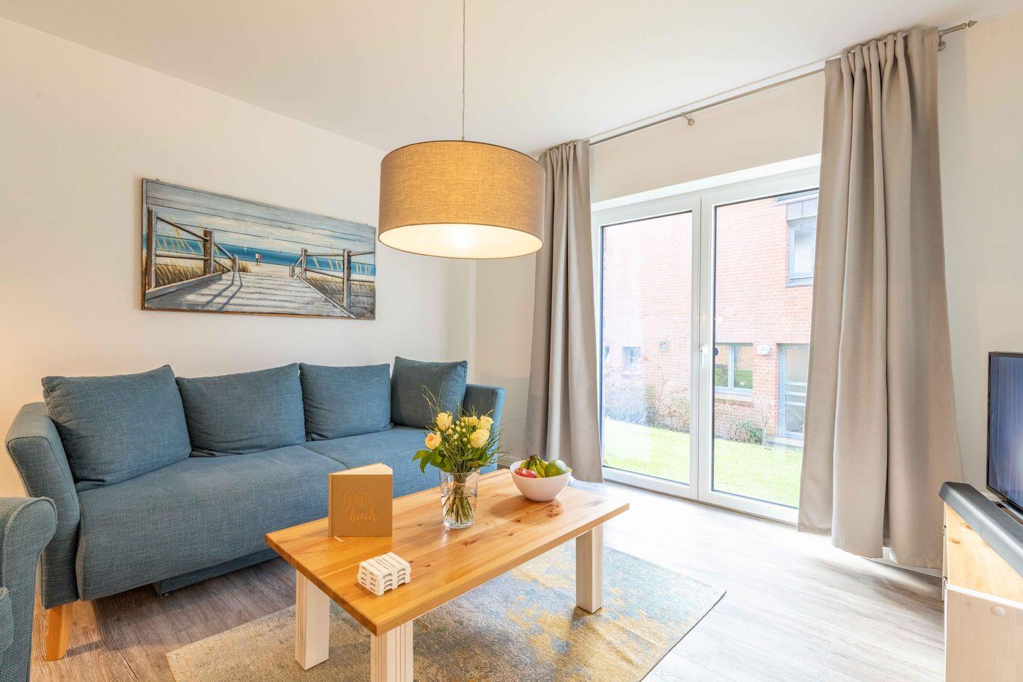 Im Wohnbereich steht Dir ein komfortables Sofa zur Verfügung, welches sich bei Bedarf zu einem dritten Schlafplatz ausziehen lässt. Ein moderner Fernseher mit digitalem Anschluss und Video-on-Demand sorgt für Unterhaltung an gemütlichen Abenden. Fernab der Hektik kannst Du hier in Ruhe die Zeit genießen oder spannende Spieleabende verbringen.