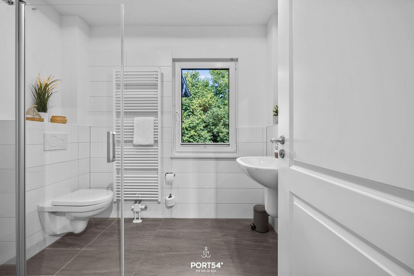 Das moderne Badezimmer verfügt über eine bodengleiche Dusche, ein Waschbecken, ein WC, einen Kosmetikspiegel, einen Haartrockner sowie Badetücher. Zusätzlichen Komfort bieten Dir ein Ganzkörperspiegel und ein Wäscheständer.