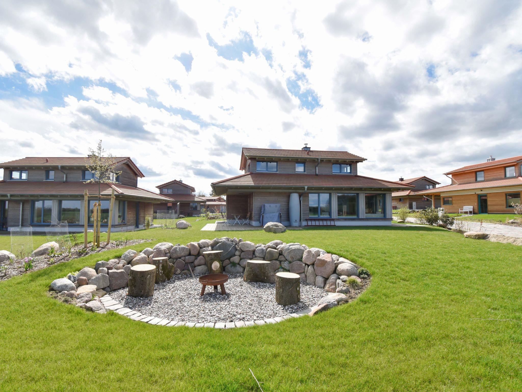 Auf der Terrasse warten Strandkorb, Gartenmöbel und eine Feuerstelle aus Feldsteinen – perfekt für lange Abende unter Sternen. Der weitläufige und liebevoll gestaltete Garten lädt zum Verweilen im Freien ein.