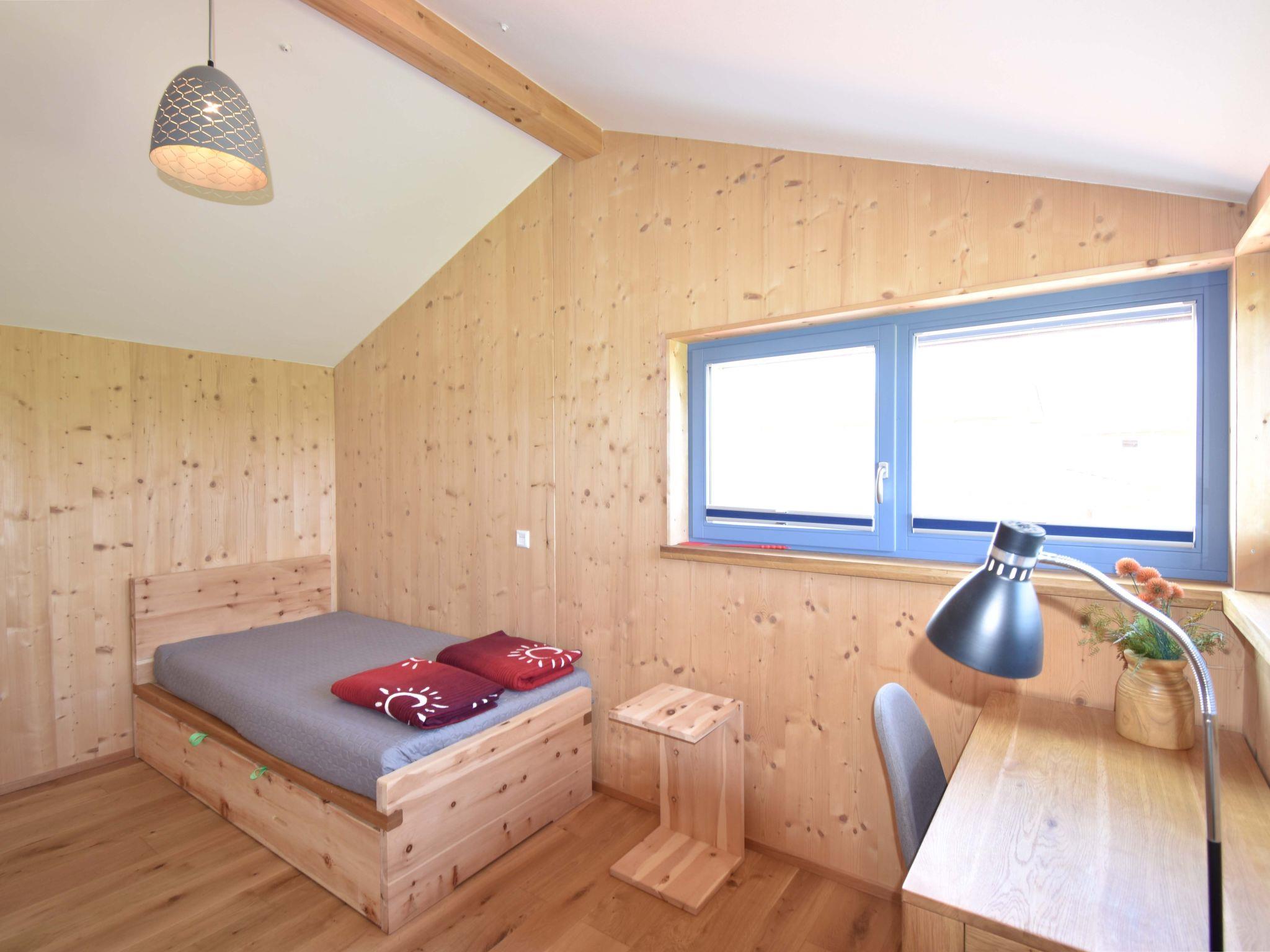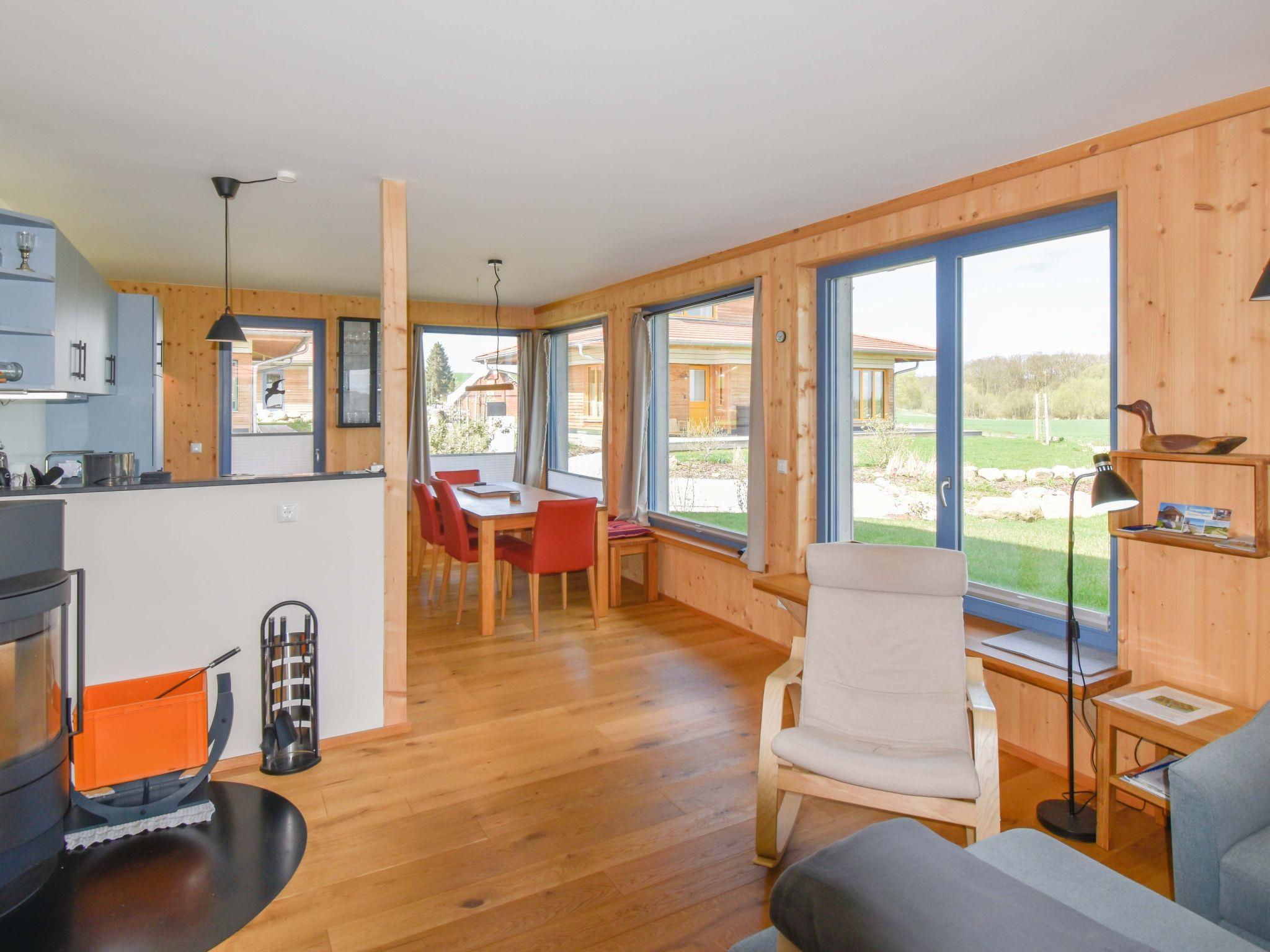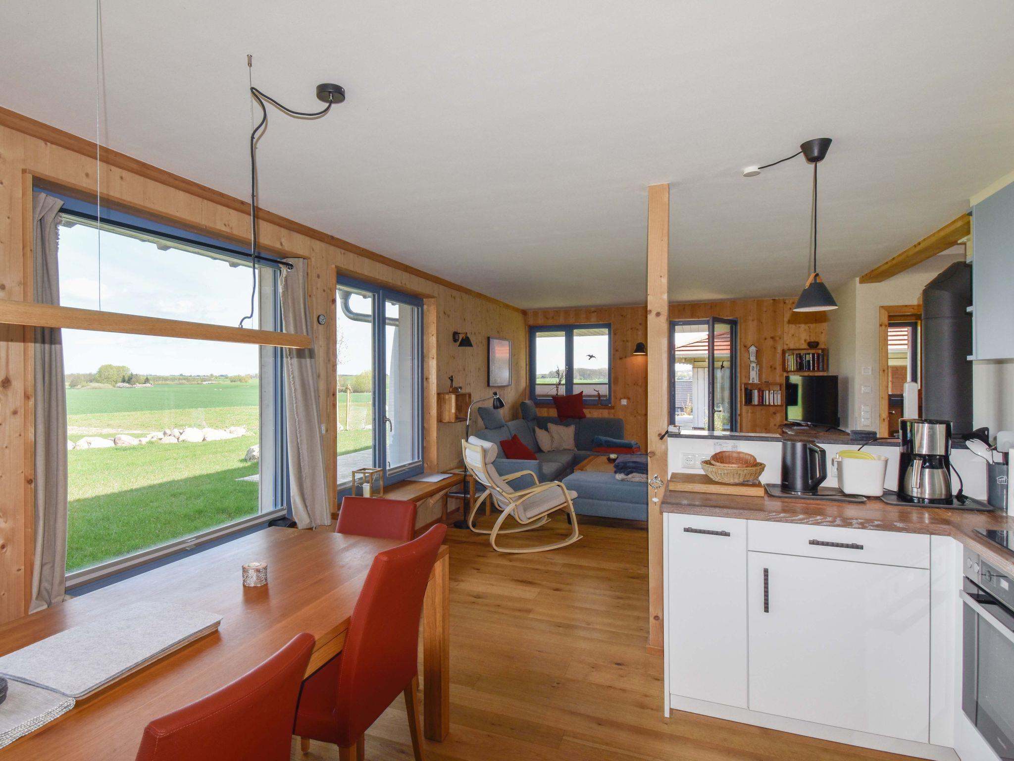 Das Massivholzhaus mit Innenwänden aus Lehm, das durch regionale Biomasse beheizt wird, schafft ein wohltuendes Wohnklima. Drei gemütliche Schlafzimmer, ausgestattet mit schlaffördernden Zirbenholzbetten, zwei Bäder im Erdgeschoss und ein zusätzliches kleines Bad im Obergeschoss sorgen für entspannten Komfort. Die großzügig ausgestattete Küche mit Blick ins Grüne lässt keine Wünsche offen. Smart-TV und funktionierendes Glasfaser-WLAN sind selbstverständlich.