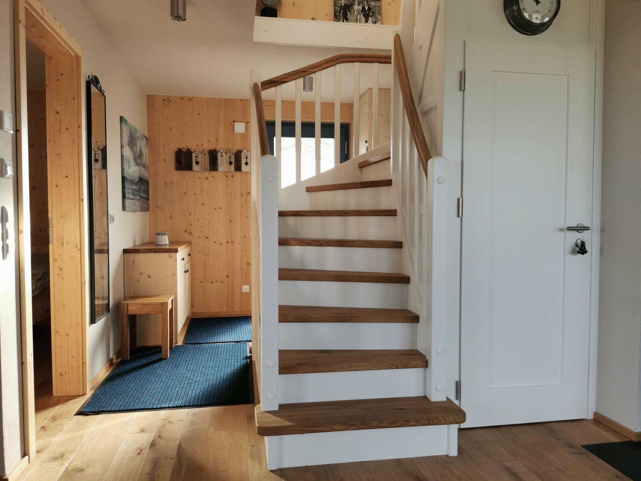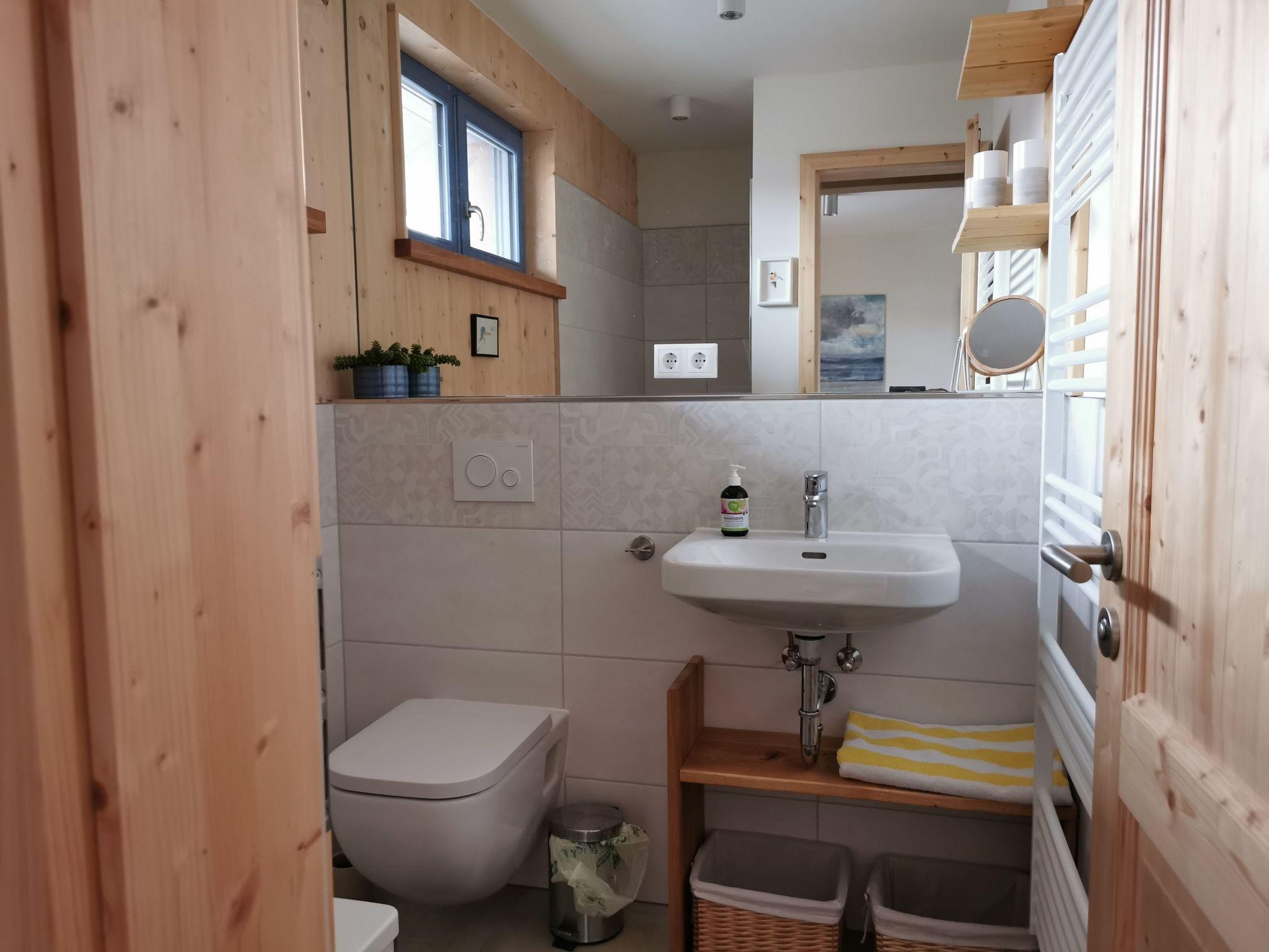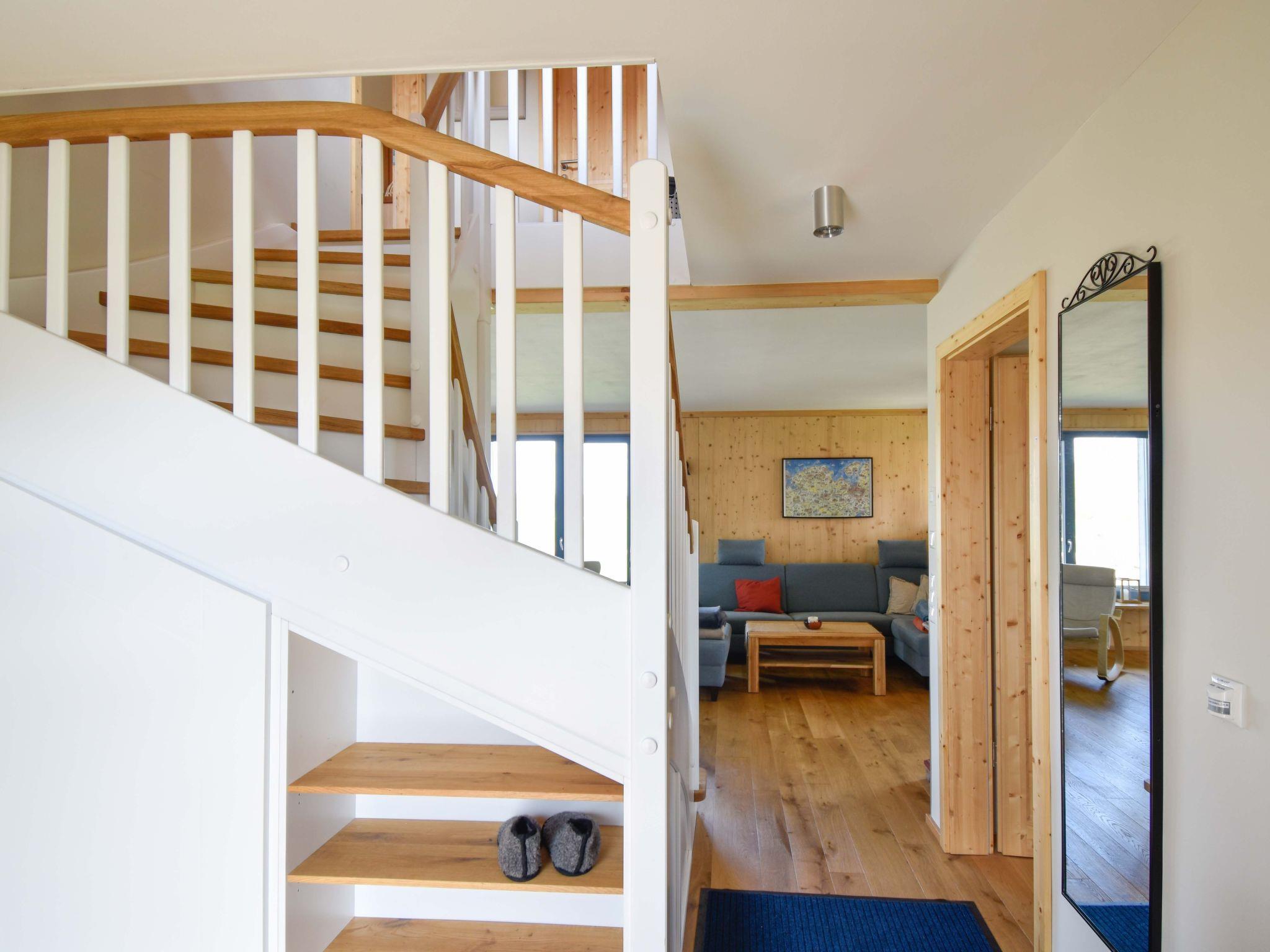 Das Massivholzhaus mit Innenwänden aus Lehm, das durch regionale Biomasse beheizt wird, schafft ein wohltuendes Wohnklima. Drei gemütliche Schlafzimmer, ausgestattet mit schlaffördernden Zirbenholzbetten, zwei Bäder im Erdgeschoss und ein zusätzliches kleines Bad im Obergeschoss sorgen für entspannten Komfort. Die großzügig ausgestattete Küche mit Blick ins Grüne lässt keine Wünsche offen. Smart-TV und funktionierendes Glasfaser-WLAN sind selbstverständlich.