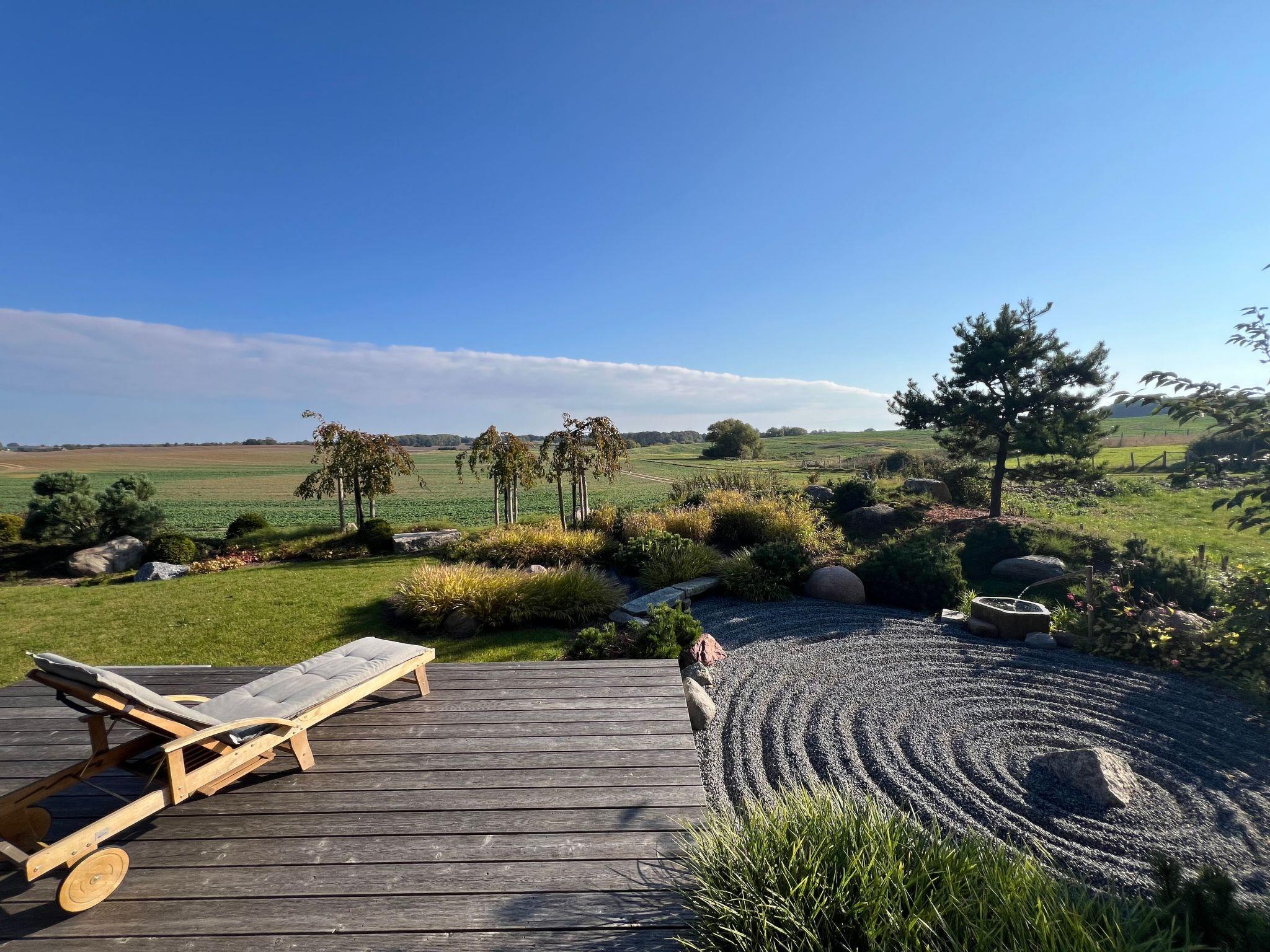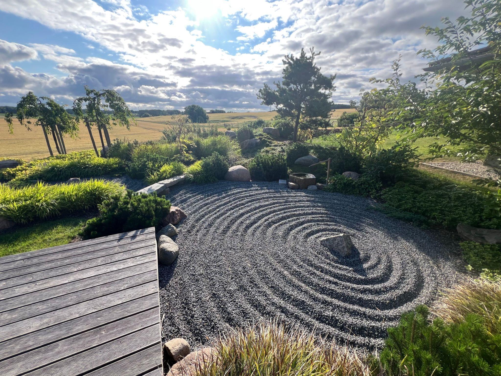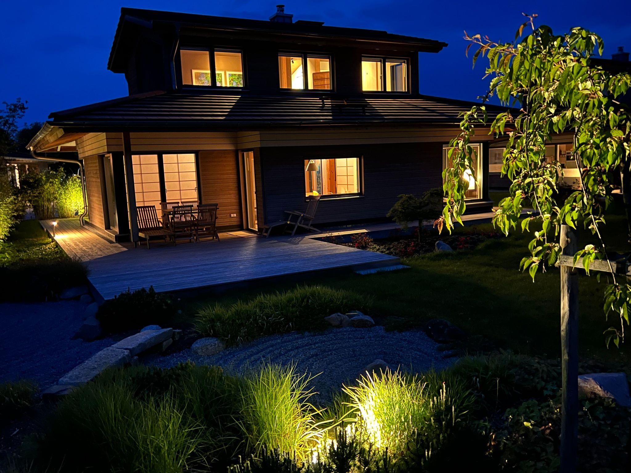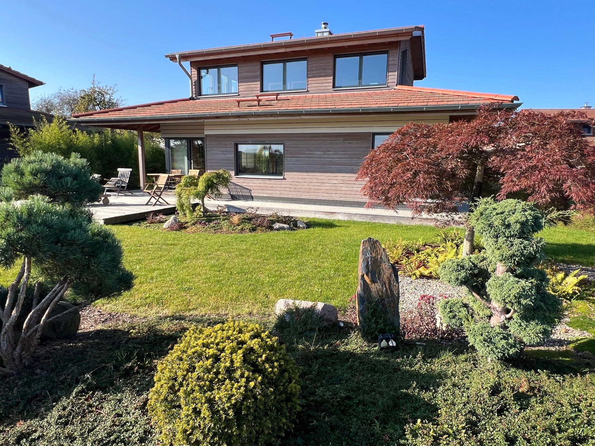 Der Außenbereich unseres Bio-Holzhauses ist ein wahrer Rückzugsort. Die rundum verlaufende, teilweise überdachte Terrasse lädt zu jeder Tageszeit zum Verweilen ein. Der sorgfältig angelegte, japanisch inspirierte Garten mit seinem Ahornbaum, Bambus, Kirschbäumen und einem Zen-Steingarten bietet Ihnen Ruhe und Erholung pur. Hier finden Sie die perfekte Symbiose von Natur und nachhaltiger Architektur, die Ihnen einen einzigartigen Rückzugsort vom Alltag bietet.