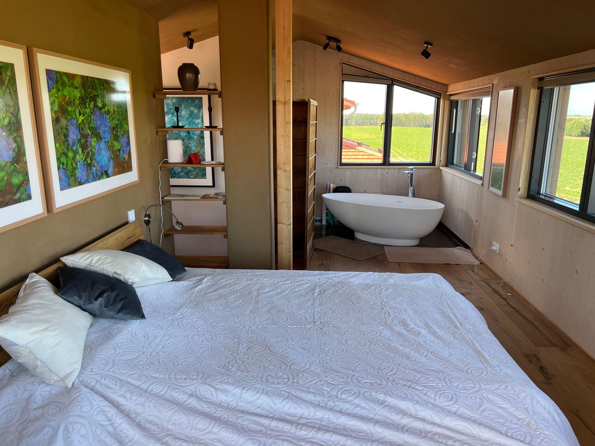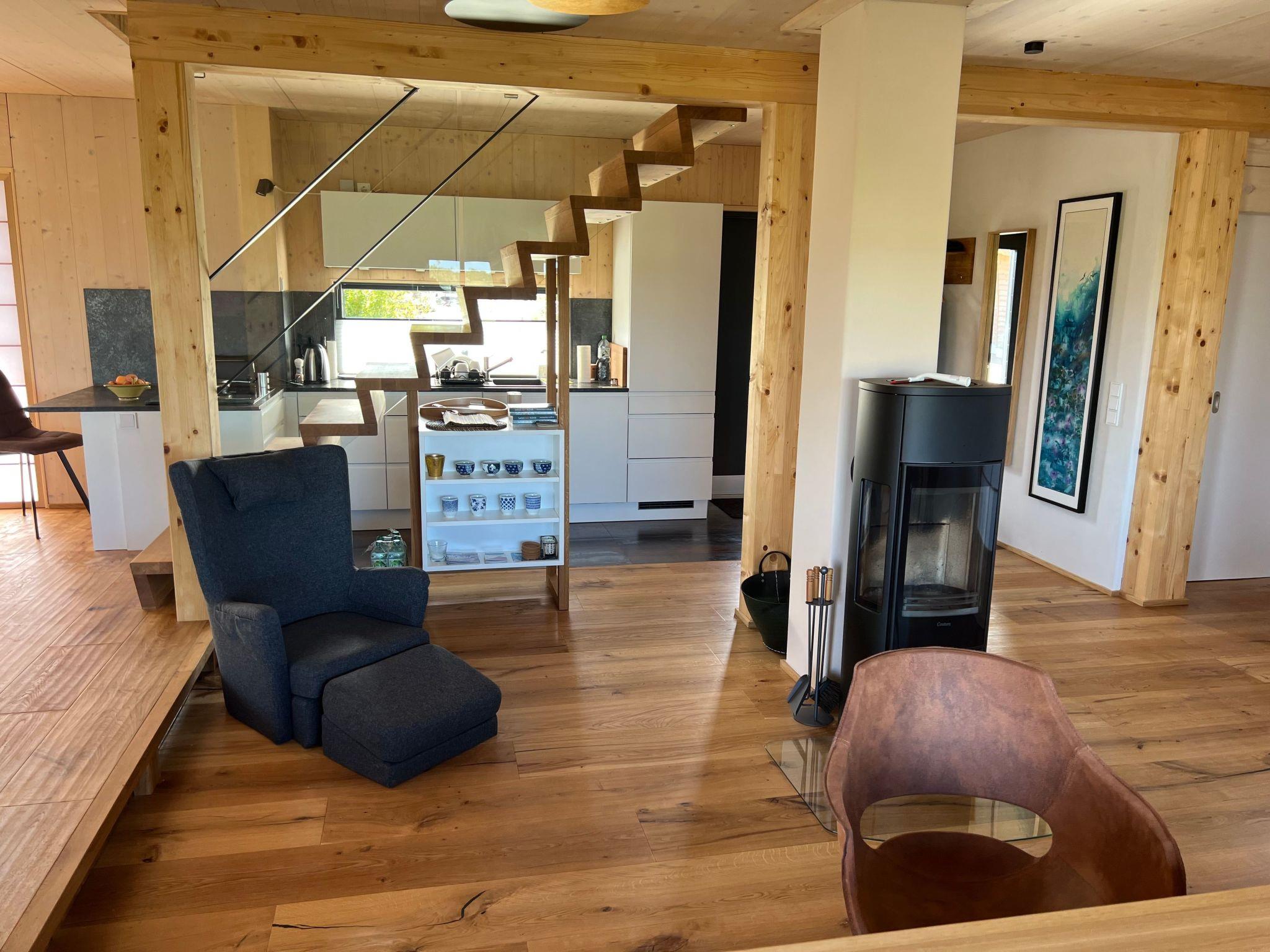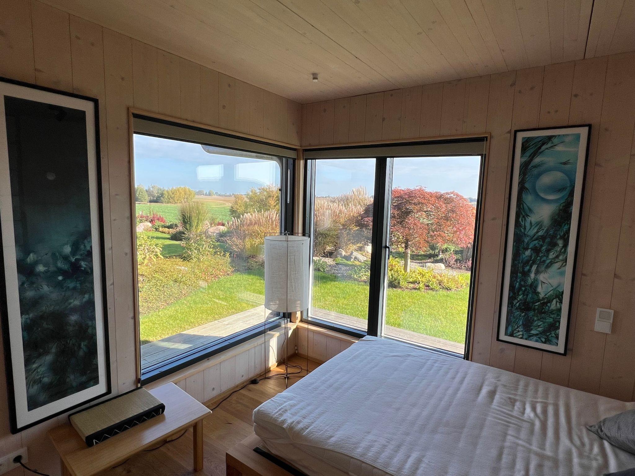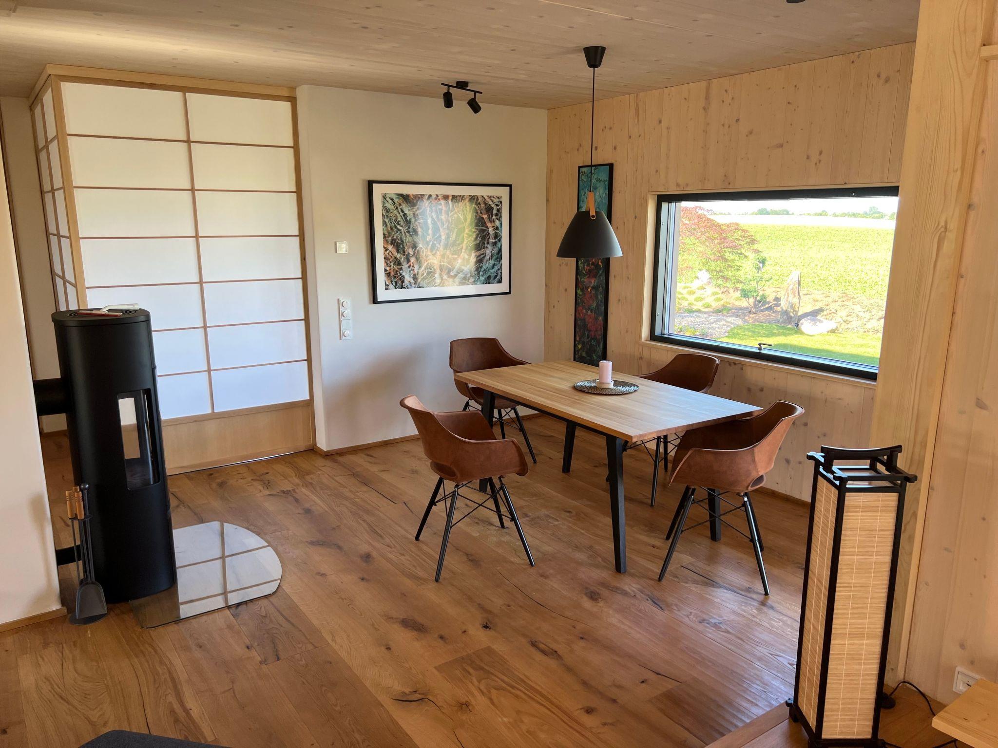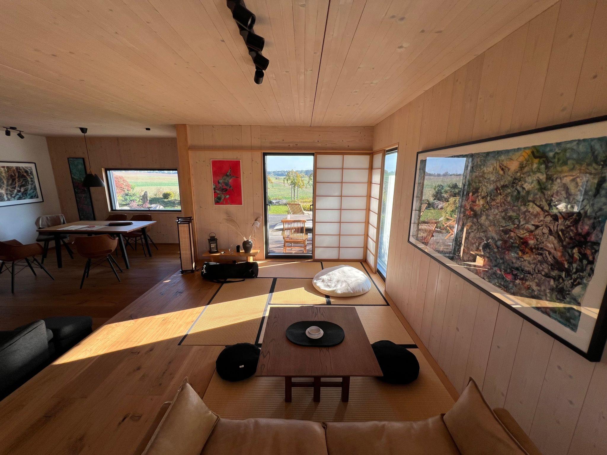 Im Inneren besticht das Haus durch seine hochwertige Ausstattung. Das Hauptschlafzimmer im 1. Stock bietet durch seine zahlreichen Fenster atemberaubende Ausblicke auf die umliegende mecklenburgische Landschaft. Das offene Bad mit freistehender Badewanne lädt zum Entspannen ein, während das kleinere Schlafzimmer im Erdgeschoss auch als Ruhe- oder Meditationsraum genutzt werden kann. Ein weiteres Badezimmer sowie der großzügige Wohn- und Essbereich mit einem großen Tatami-Podest sorgen für ein außergewöhnliches Wohnerlebnis. Die durchdachte Gestaltung mit einem Holzofen, Fuß- oder Deckenheizung und Böden aus Eiche oder Tatami unterstreicht das besondere Ambiente des Hauses.