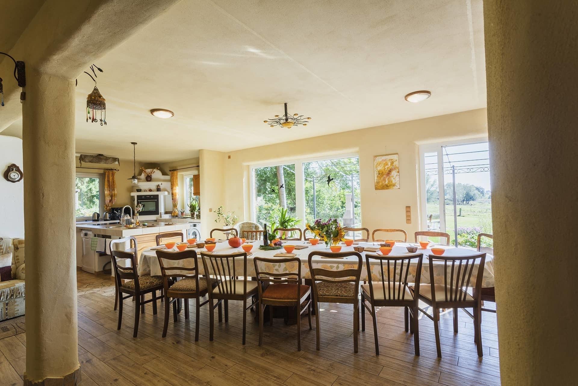 Unser großzügiges Ferienhaus "Schulgartenhaus" in Welzin bietet auf 400 m² reichlich Platz für große Gruppen oder die gesamte Großfamilie, in direkter Ostseenähe unweit von Boltenhagen. Der großzügige Seminarraum, sowie der vollständig ausgestattete Koch- und Essbereich bieten alles, was Sie für einen angenehmen Aufenthalt ganz nach Ihren Bedürfnissen benötigen.