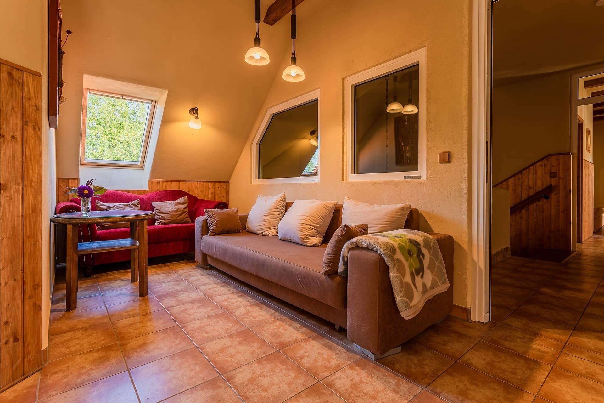 Im großen Wohn- und Medienbereich des Ferienhauses können Sie nicht nur bei Schlechtwetter gemeinsame Zeit verbringen. Alle Personen finden hier reichlich Platz auf einer unserer gemütlichen Couchgarnituren oder können gemeinsam im großen Essbereich Mahlzeiten zu sich nehmen. Das große Panoramafenster ermöglicht ihnen dort einen wunderschönen Blick in die Natur. Im gesamten Ferienhaus verfügen Sie über Gratis-WLAN.