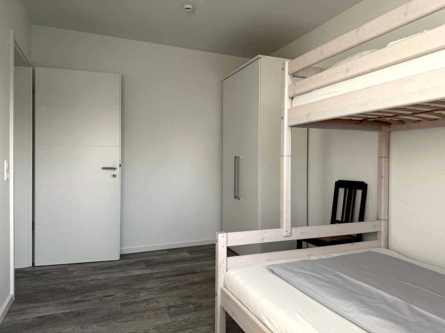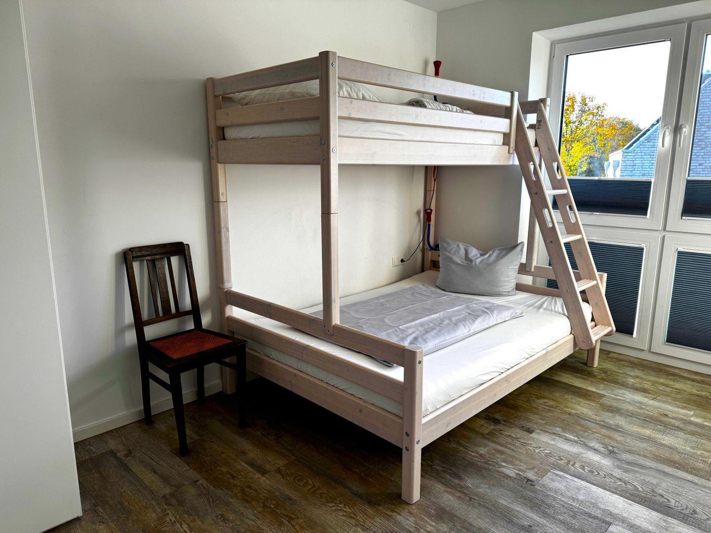 Schlafzimmer 2: Stockbett für 3 Personen: 1x Einzelbett oben (Maße: 90 x 200 cm), Doppelbett unten (140 x 200 cm)