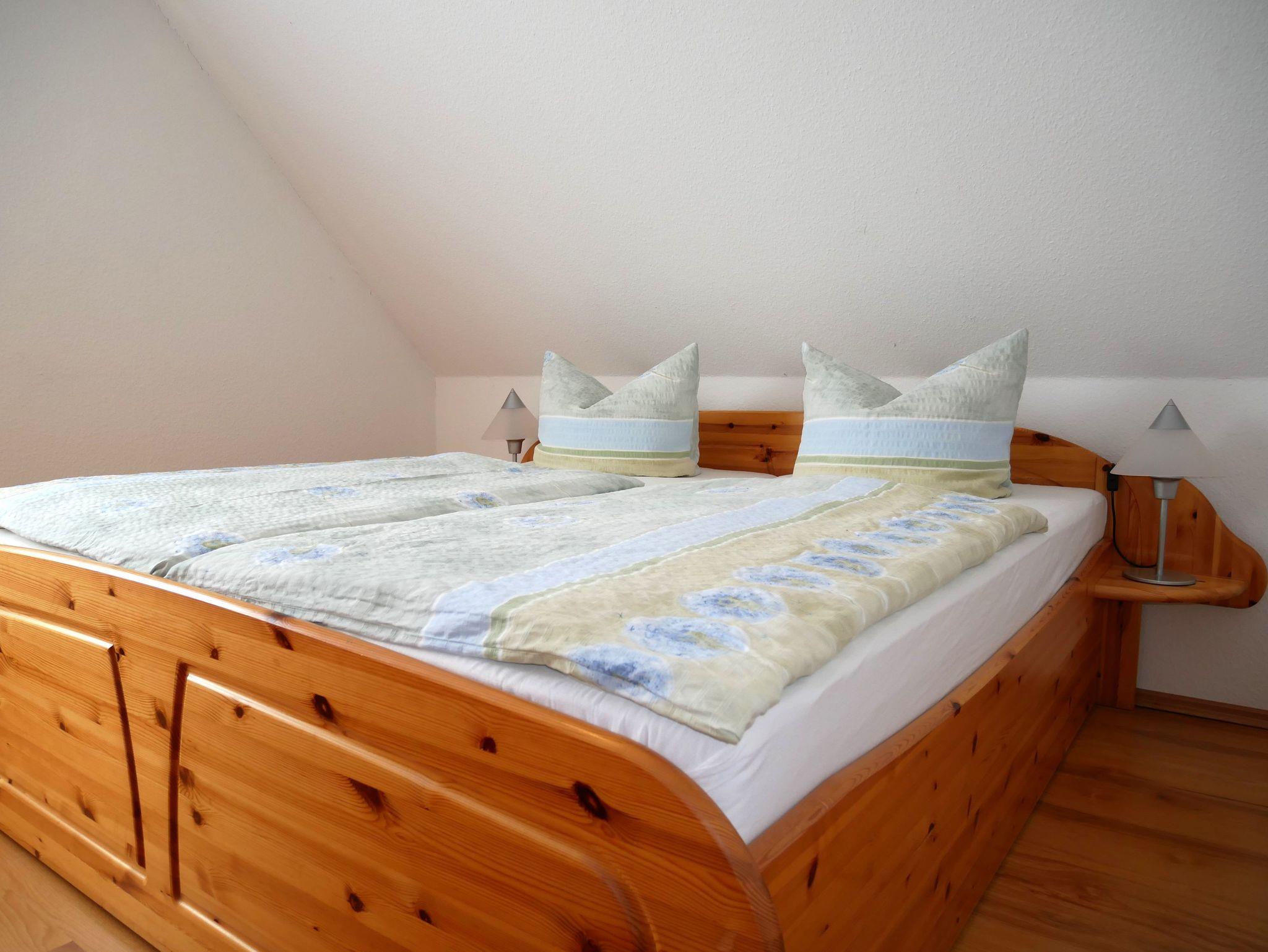 Die Wohnung verfügt über eine sonnige Terrasse zur Südseite, die zum Frühstück im Freien oder zum Entspannen am Nachmittag einlädt. Ein Sonnenschirm kann auf Anfrage zur Verfügung gestellt werden. Es erwarten Sie zwei Schlafzimmer: ein Elternschlafzimmer mit einem gemütlichen Doppelbett sowie ein Kinderzimmer mit einem Einzelbett, das sich bei Bedarf ausklappen lässt auf eine Größe von 1,40m x 2,00m. Das Wohnzimmer ist mit einem Schlafsofa ausgestattet und bietet zusätzlichen Raum zum Ausruhen oder Übernachten. Das Schlafsofa hat eine Liegefläche von 1,20 x 1,80m.