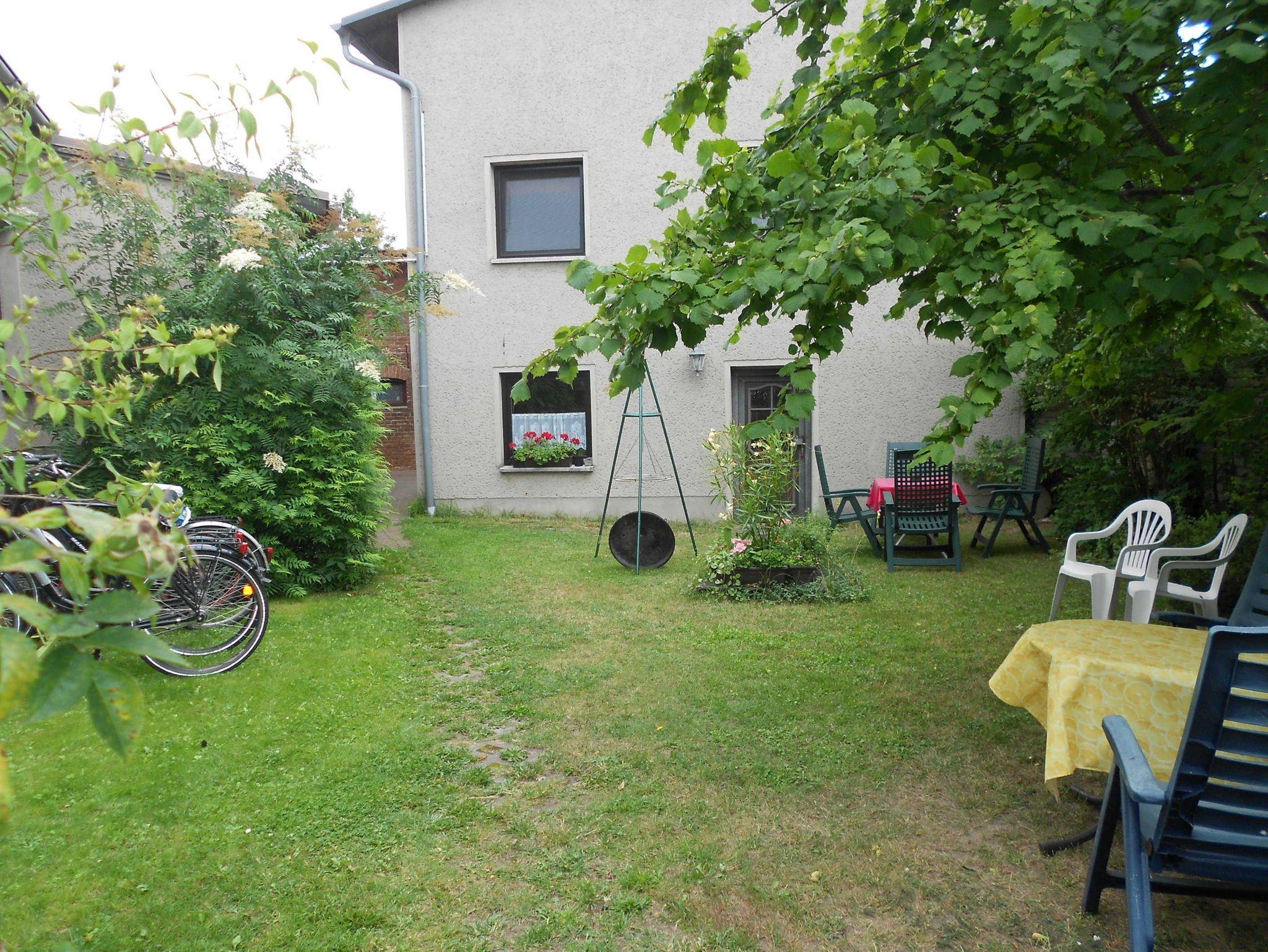 Eine Sitzgruppe auf dem Hof vor der Wohnung lädt zum entspannten Verweilen ein.