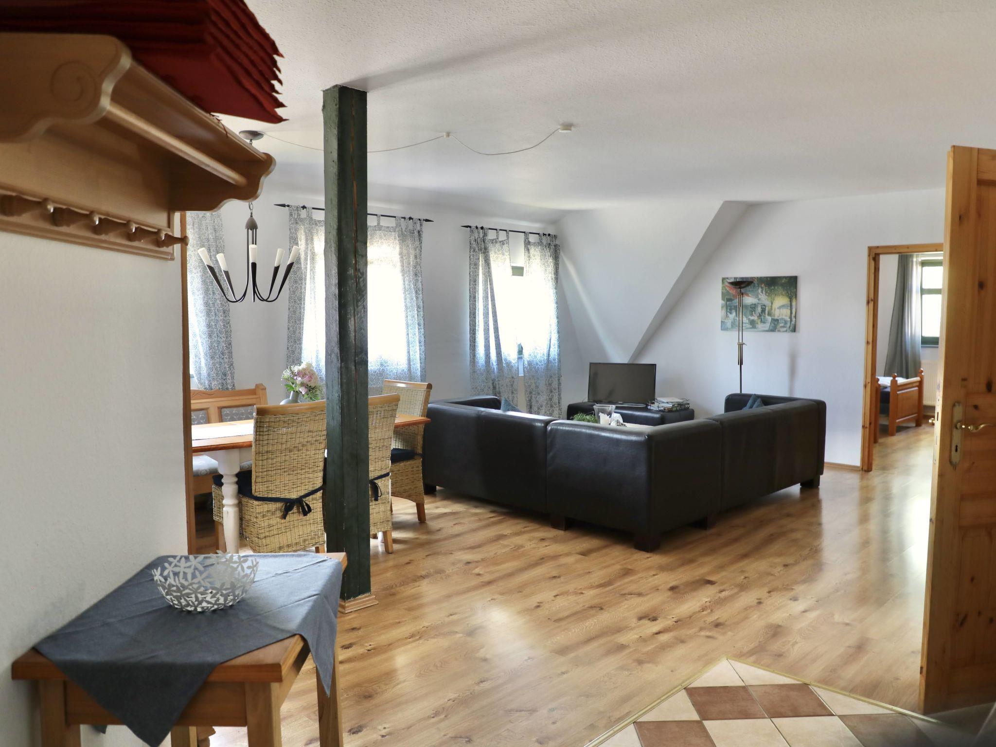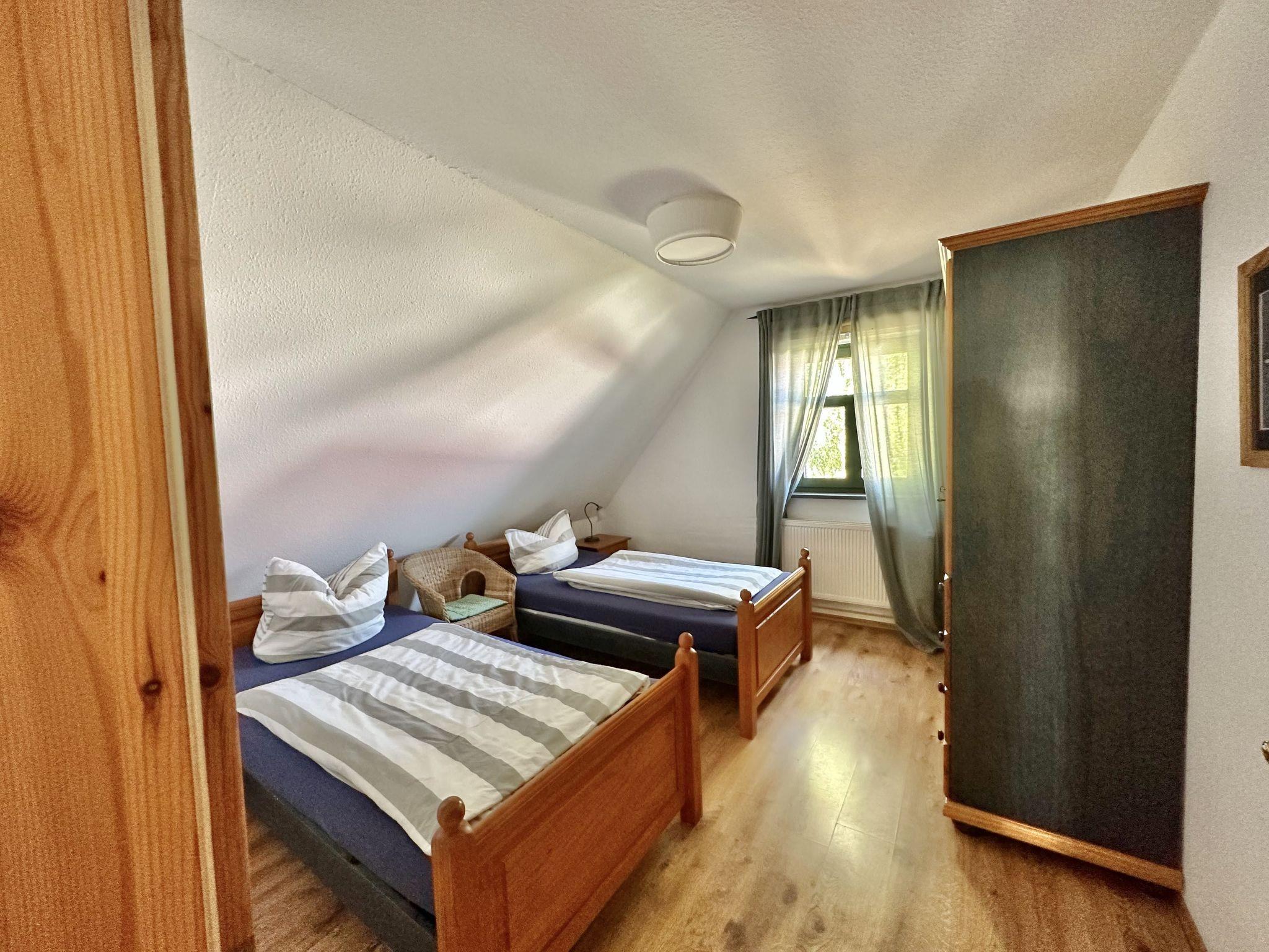 "Rügen", 4-Zimmer-Wohnung 105 m2 im 1. Stock. Abgeschrägtes Wohn-/Esszimmer mit Sat-TV (Flachbildschirm). 2 abgeschrägte Zimmer, jedes Zimmer mit 2 Betten. 1 abgeschrägtes Zimmer mit 1 Bett und 1 Doppelbett. Kochnische (Backofen, Geschirrspüler, elektrische Kaffeemaschine). Dusche/WC. Zur Verfügung: Internet (Wireless LAN, gratis). Bitte beachten: Nichtraucher-Unterkunft.