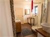 ein exklusives Badezimmer (Fön, Ganzkörperspiegel, Handtücher, Badetücher) mit Rundglasdusche, Natursteinfliesen, 2 Waschtische, abgetrenntes WC – beides mit Fenster,