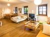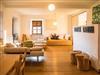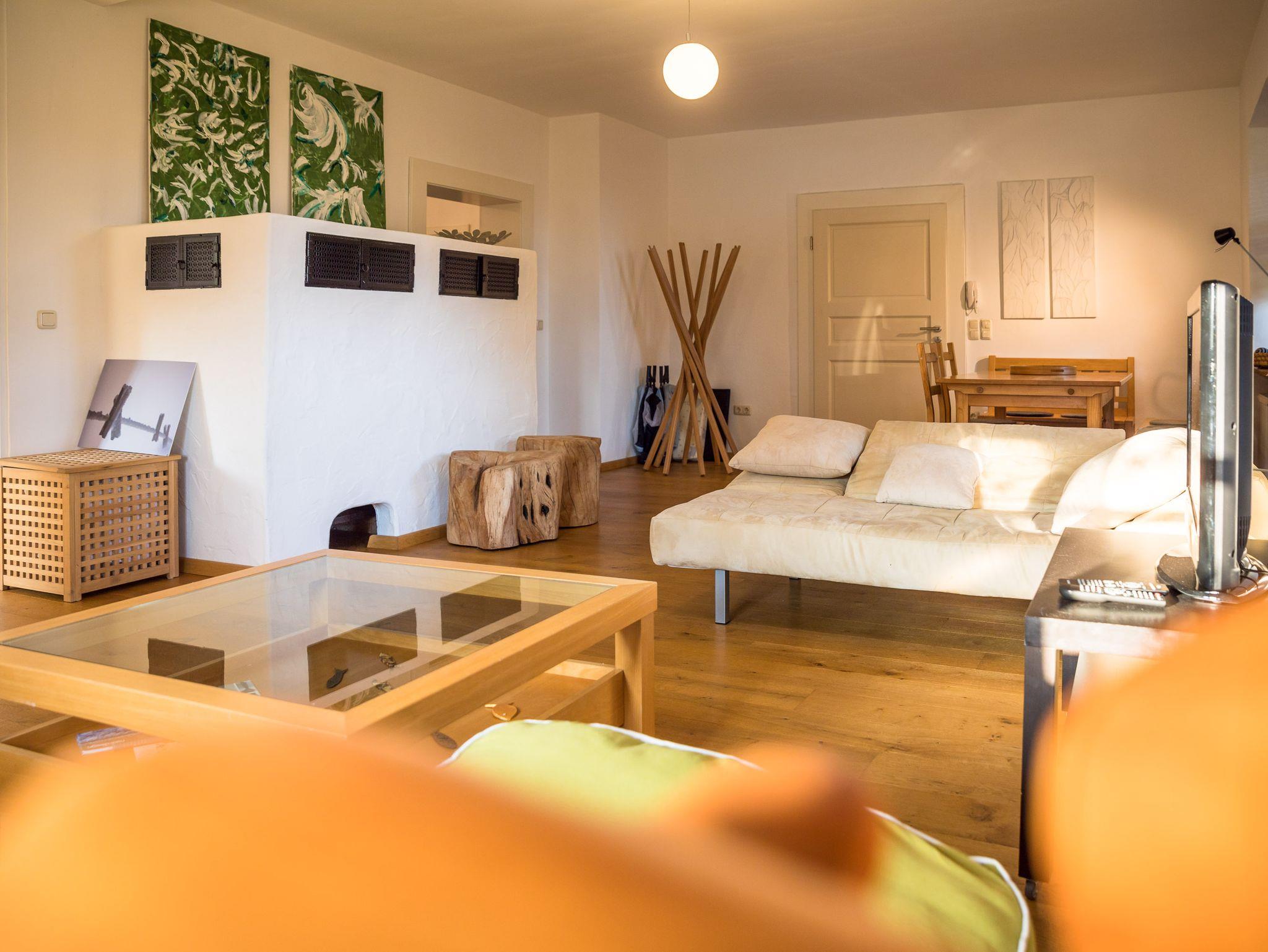 Ein großzügiger Wohnbereich mit Kachelofen und Schlafcouch für 2 zusätzliche Schlafplätze,