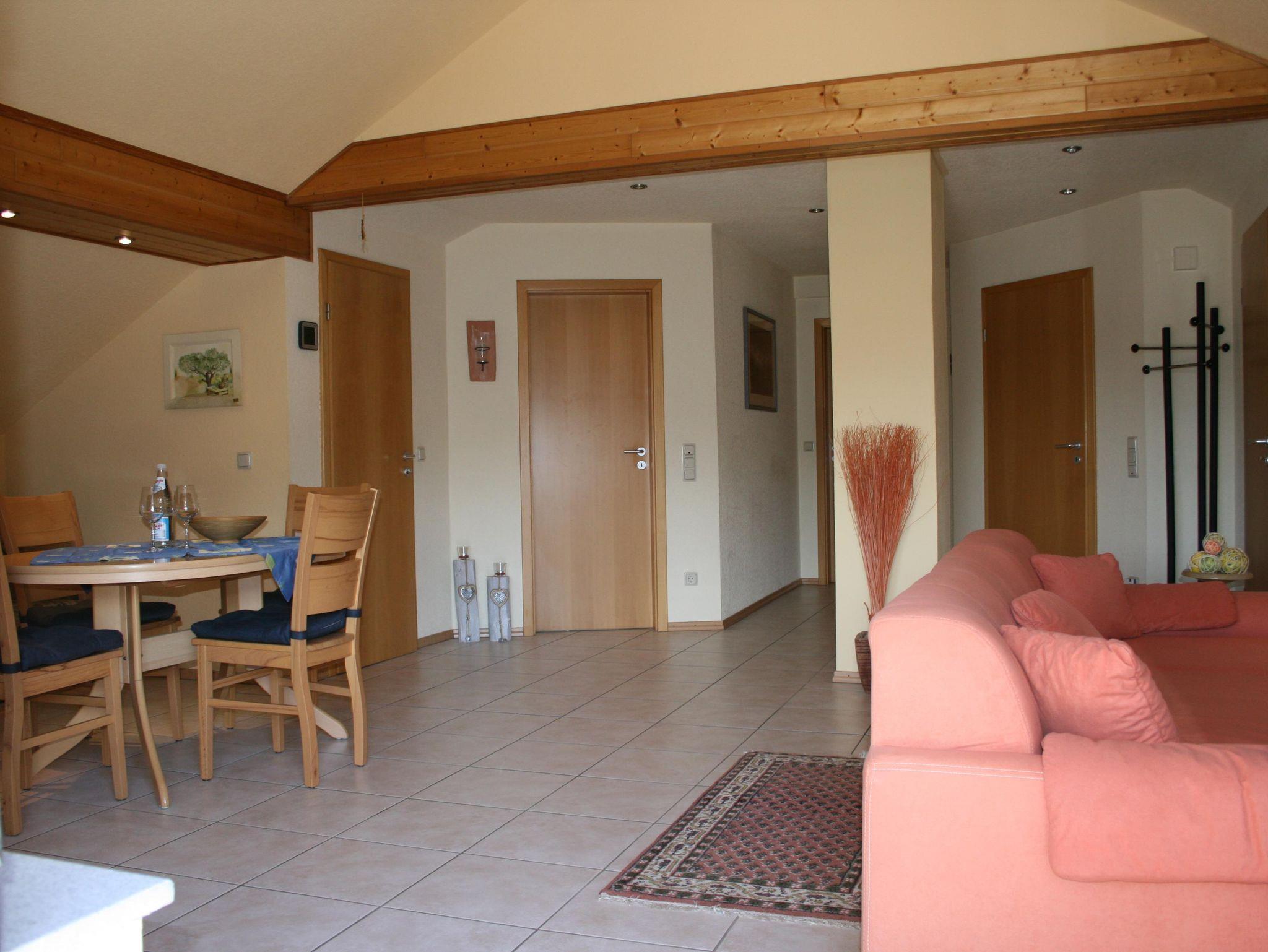 Die 70 m² große, modern eingerichtete Nichtraucher-Wohnung ist durch eine Außentreppe erreichbar und besteht aus einem Wohnzimmer mit integrierter Küchenzeile, Doppelschlafzimmer und Bad mit Dusche/WC. Im Wohnzimmer befinden sich 2 Schlafsofas.