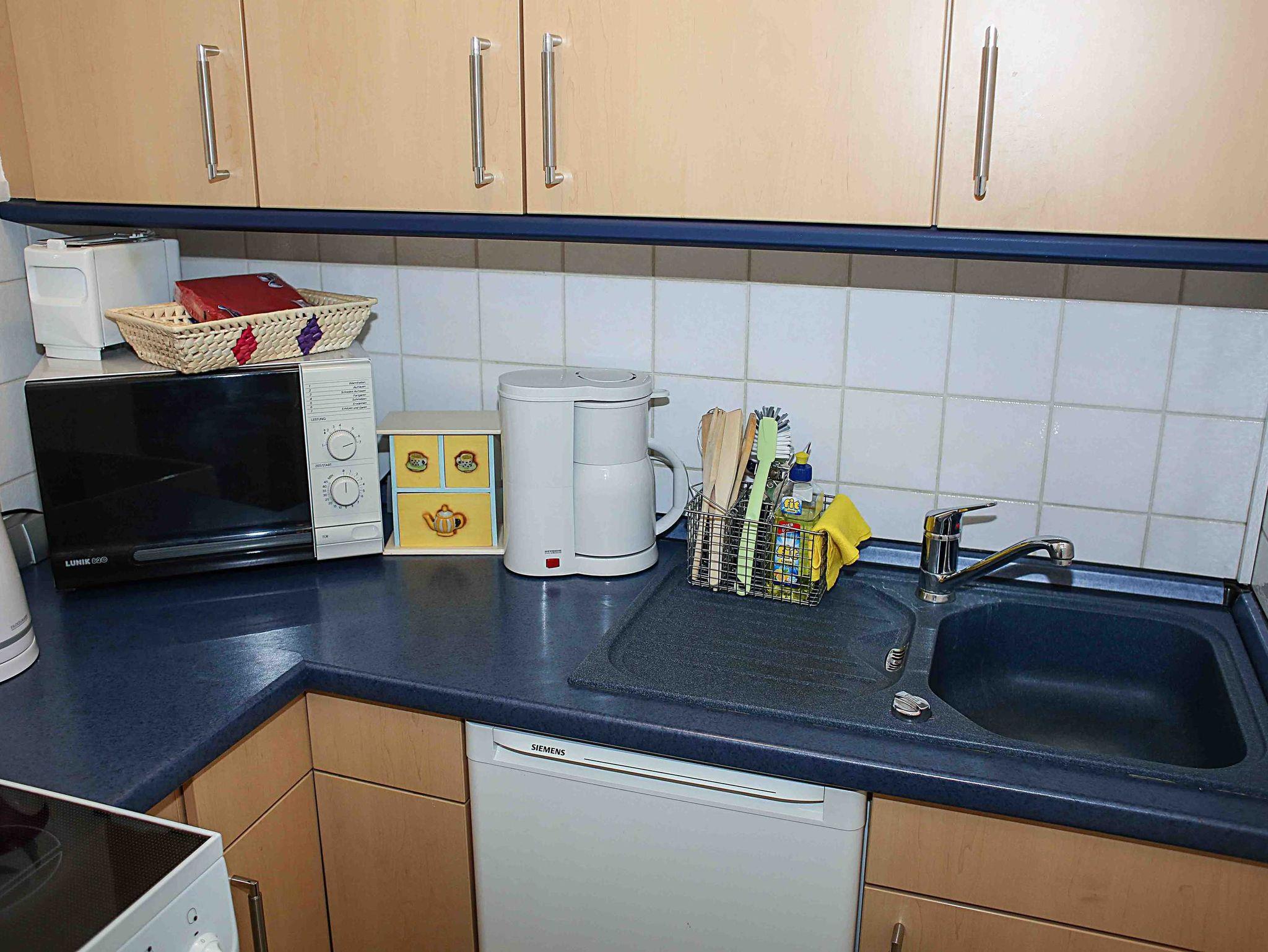 Die Wohnung ist ganzjährig zu vermieten. Die Ferienwohnung verfügt über einen kombinierten Wohn- und Schlafraum mit einem Doppelbett, einer komplett eingerichtet Küche (inkl. Kühlschrank, Mikrowelle, Herd). Das Bad ist mit einer Dusche, Toilette und einer Waschmaschine ausgestattet.