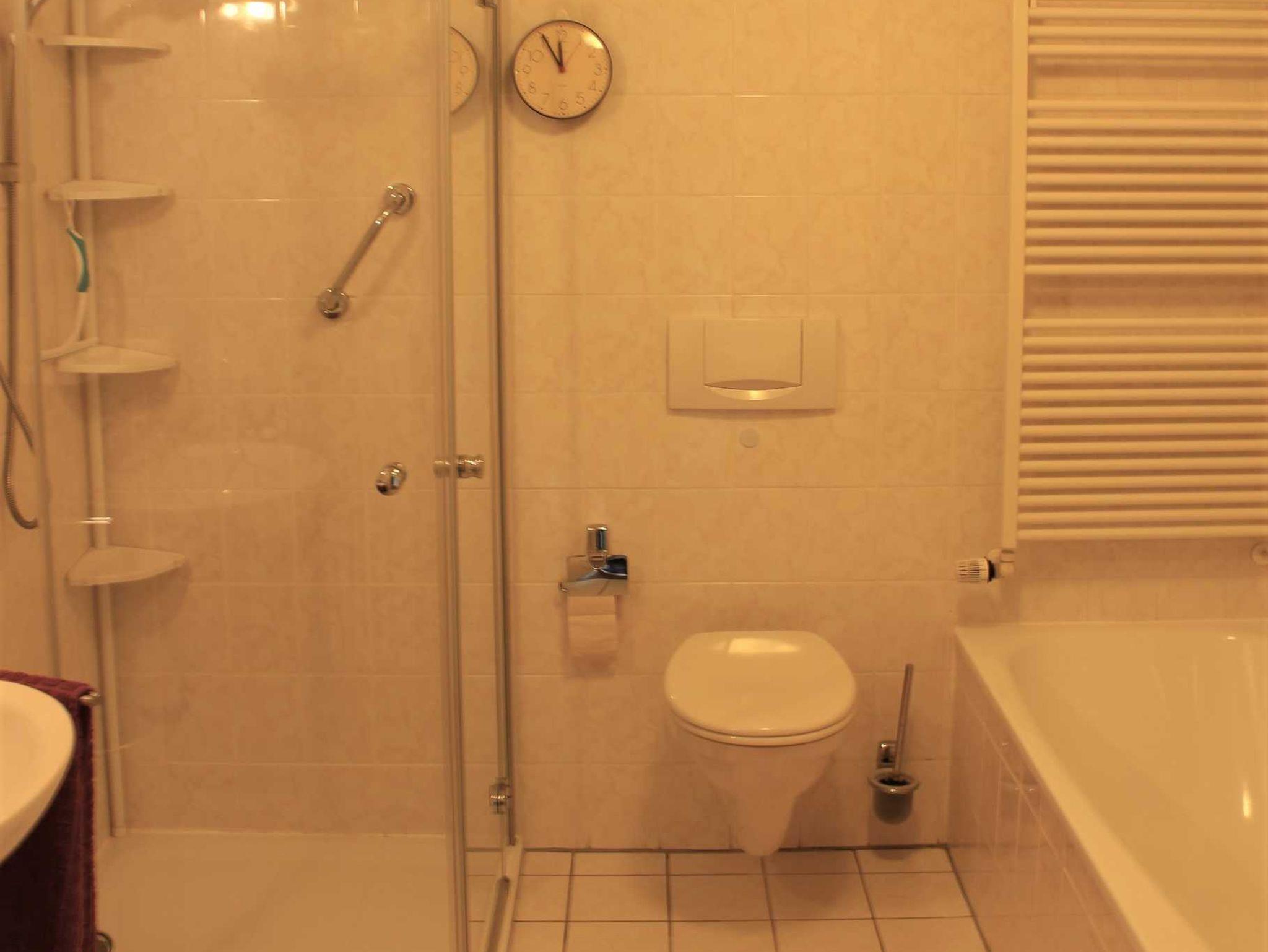 Badewanne, ein Hauswirtschaftsraum mit Waschmaschine zur