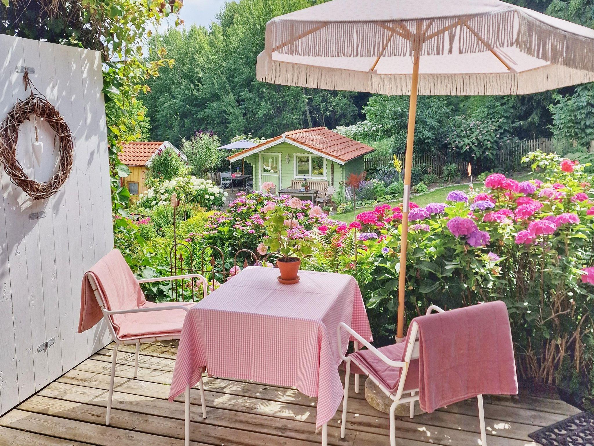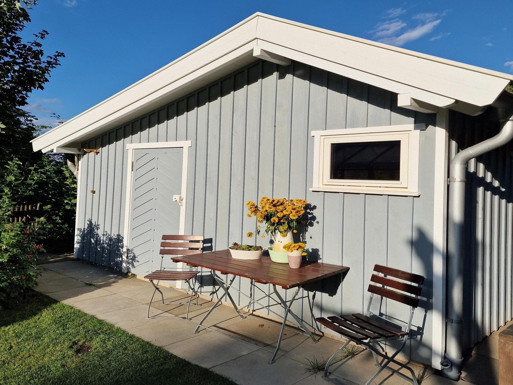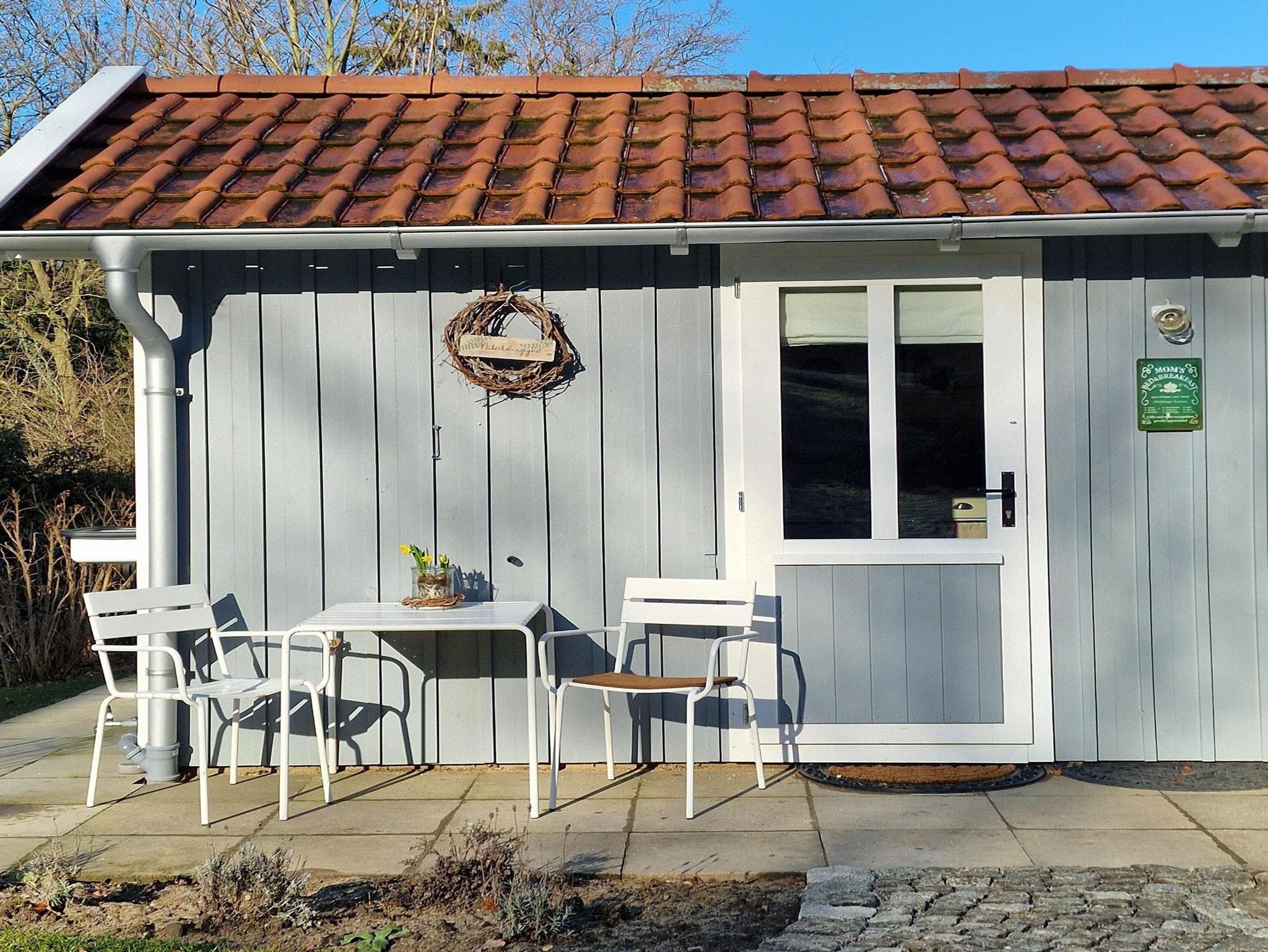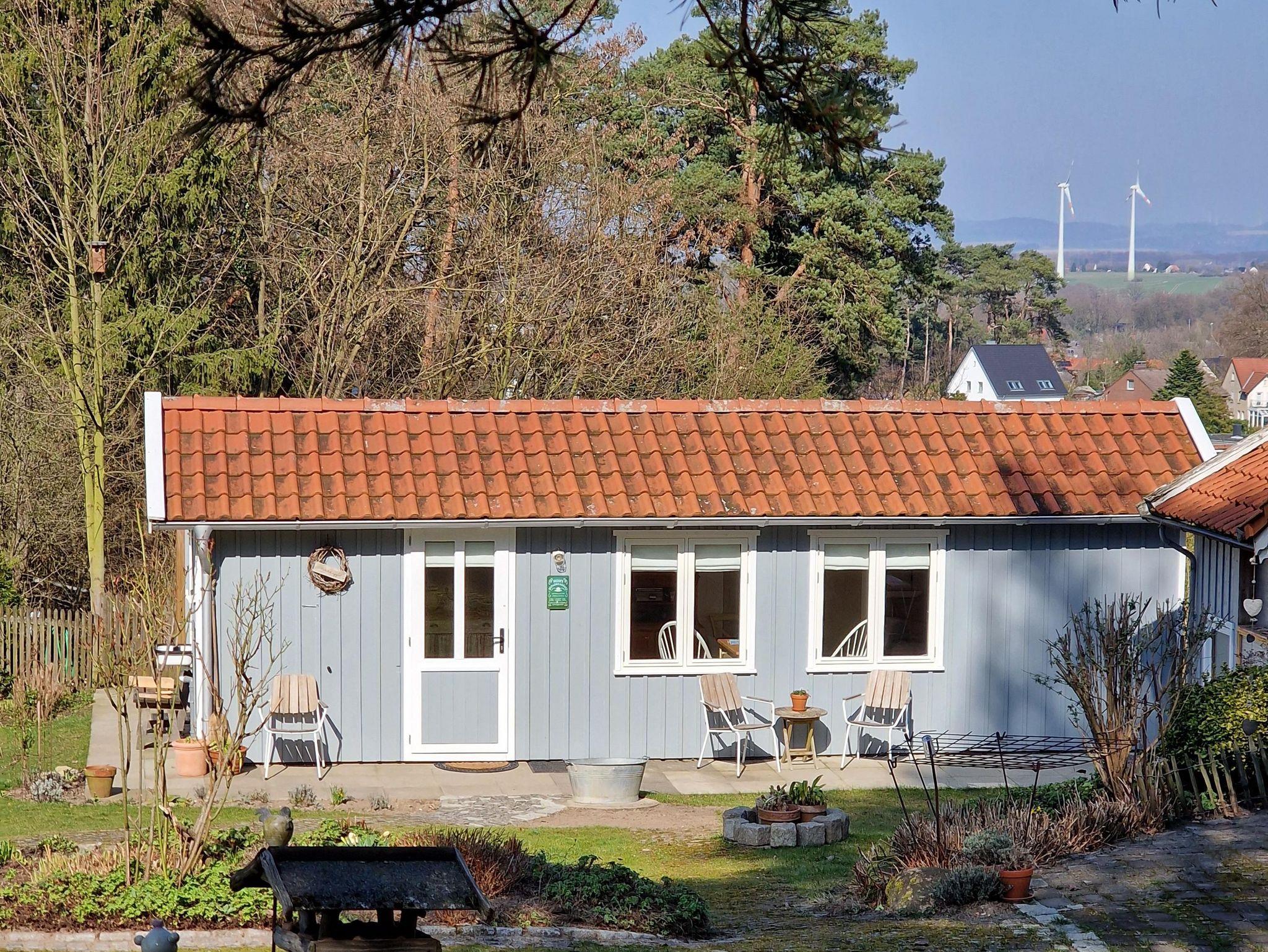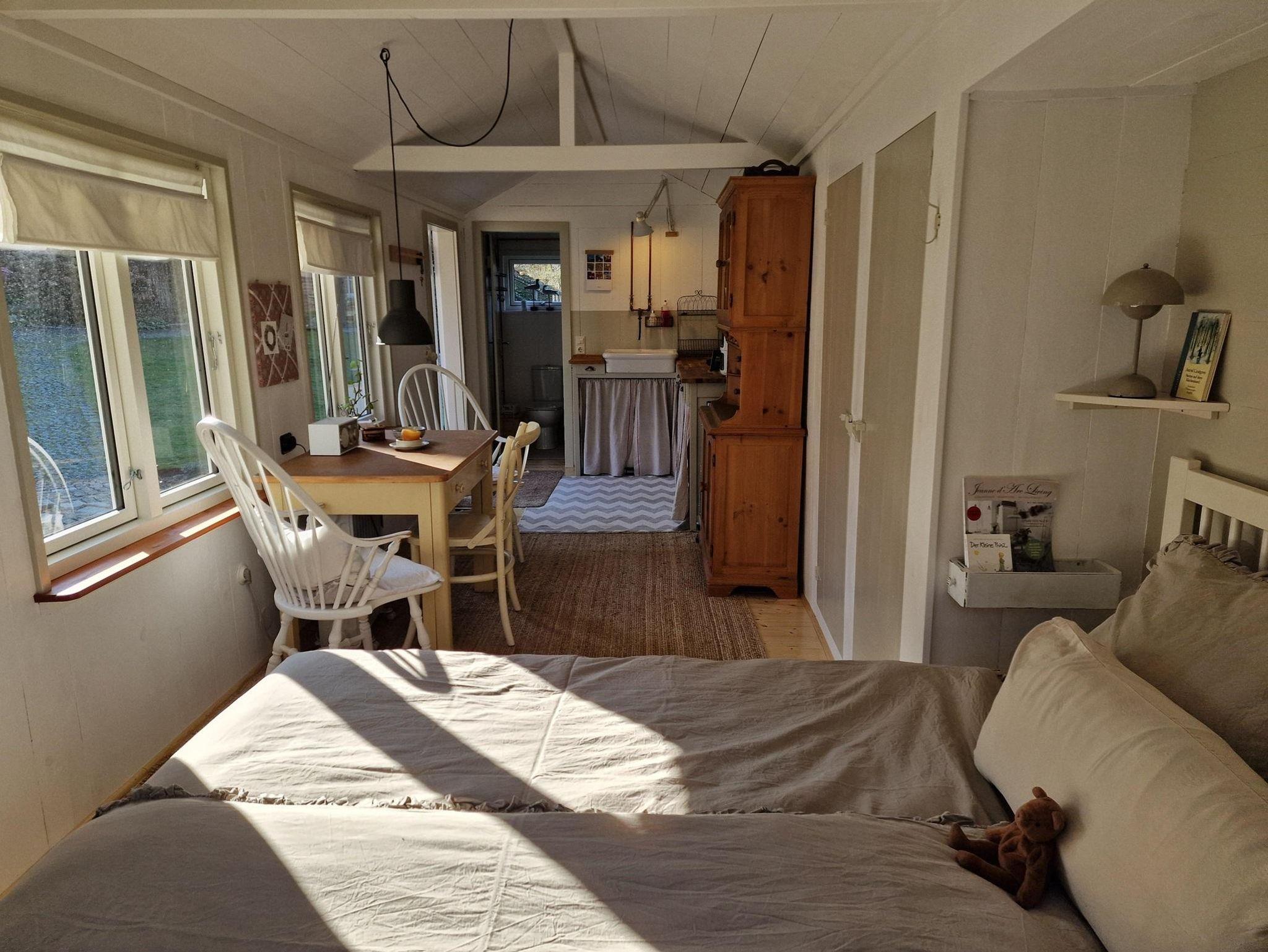Das Gästeapartment Wiesenstübchen (25 qm) ist ein kleines Tiny House, inmitten unseres Gartens, mit Ausblick auf das benachbarte Wiesengrundstück und unseren Garten, am Rande des Waldes. Es ist ausgestattet mit einem bequemen Doppelbett (160 x 200 cm), einem schönen Eßplatz, einer gut ausgestatteten Küchenzeile (Toaster, Wasserkocher, 2 Kochplatten, Airfryer, Kaffeemaschine) und einem kleinen Bad mit Dusche und WC. Zur Aufbewahrung von Kleidung gibt es einen geräumigen Wandschrank und einen Küchenschrank. Ein sonniger Außensitzplatz, WLAN und ein kostenloser Parkplatz sind ausserdem vorhanden.