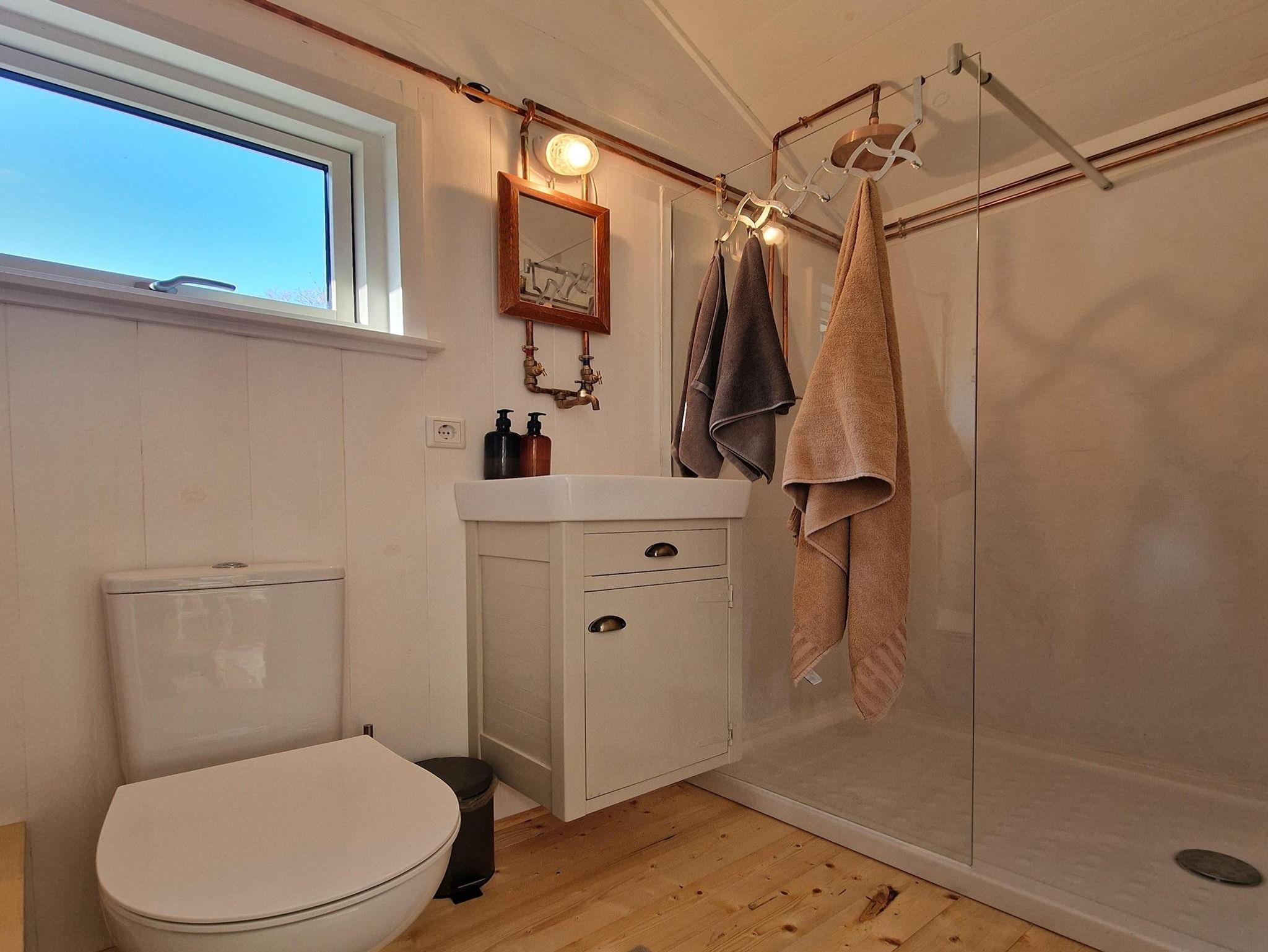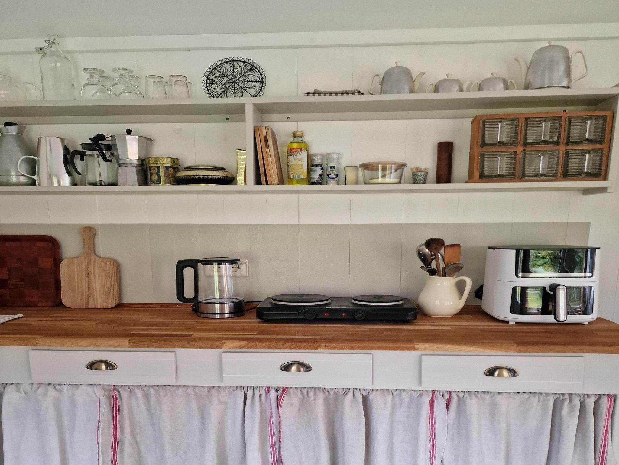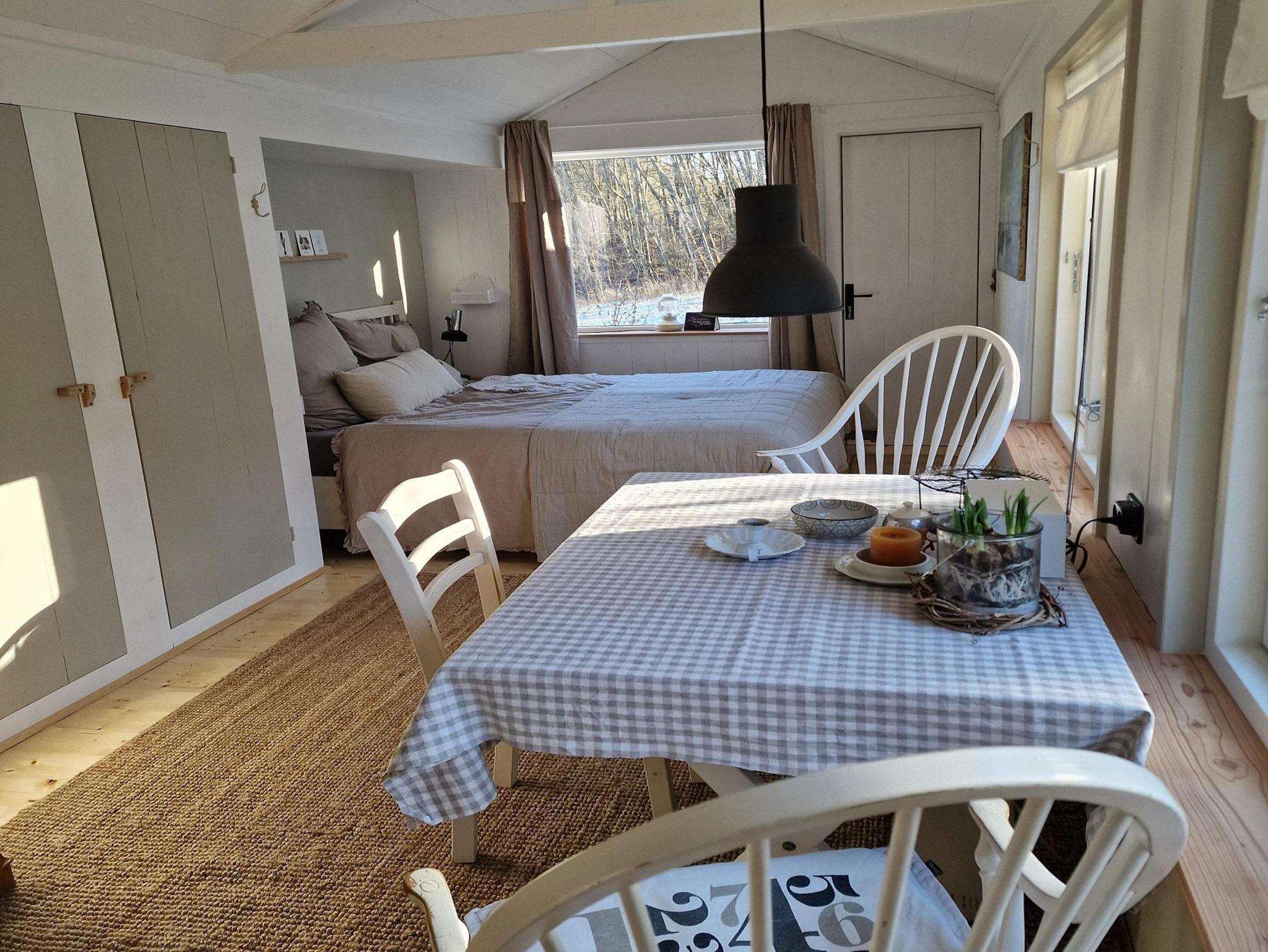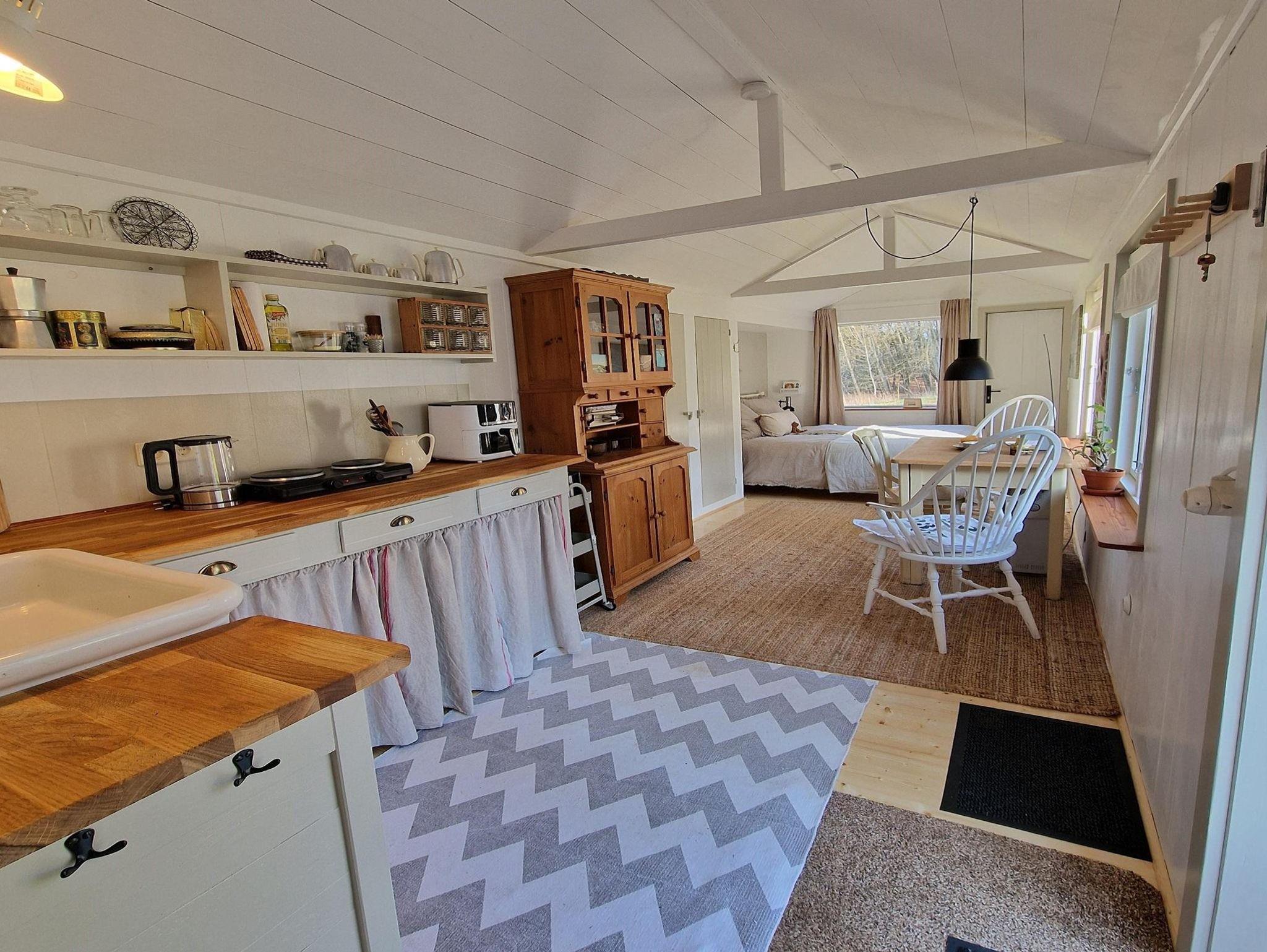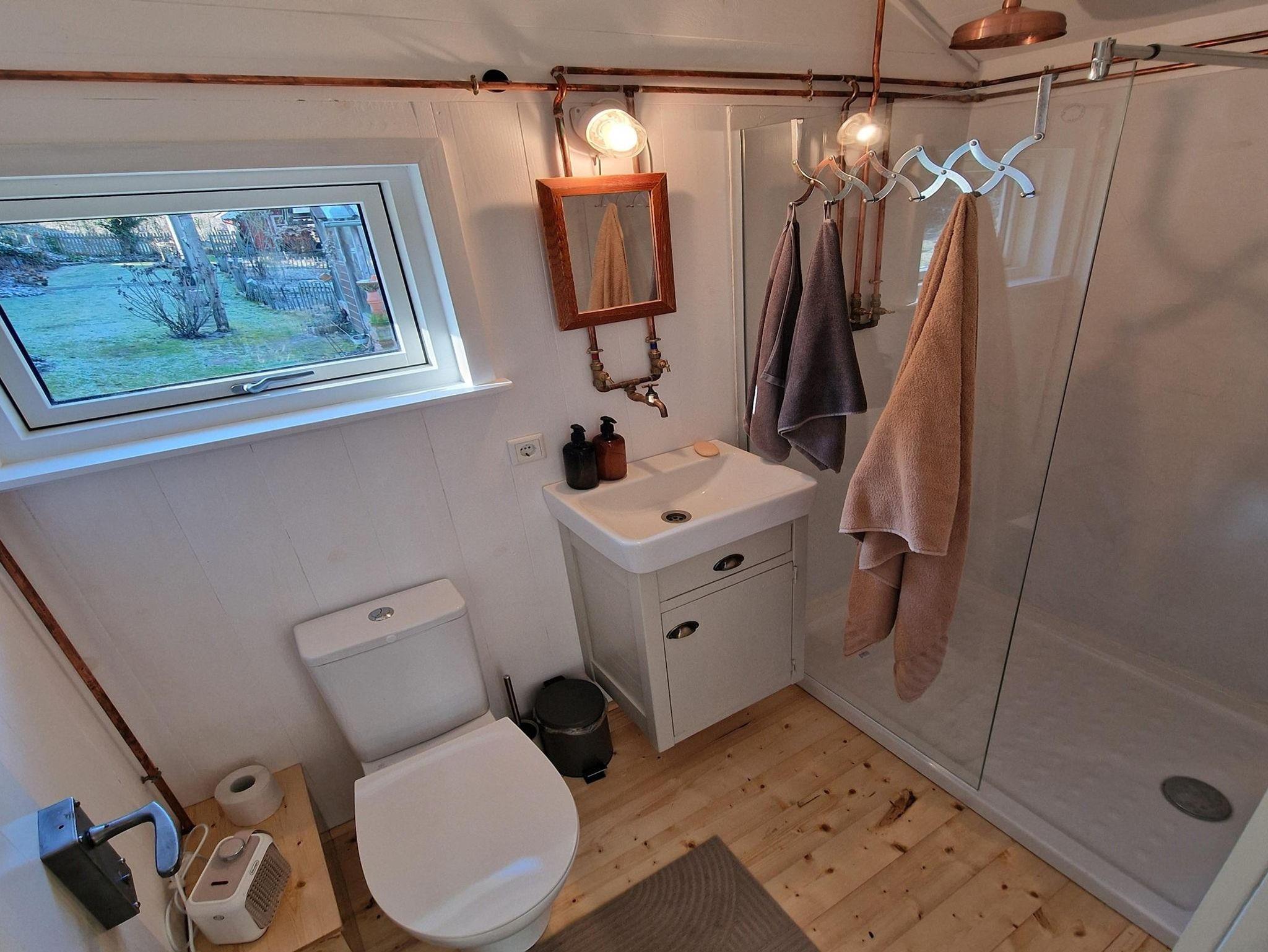 Das Gästeapartment Wiesenstübchen (25 qm) ist ein kleines Tiny House, inmitten unseres Gartens, mit Ausblick auf das benachbarte Wiesengrundstück und unseren Garten, am Rande des Waldes. Es ist ausgestattet mit einem bequemen Doppelbett (160 x 200 cm), einem schönen Eßplatz, einer gut ausgestatteten Küchenzeile (Toaster, Wasserkocher, 2 Kochplatten, Airfryer, Kaffeemaschine) und einem kleinen Bad mit Dusche und WC. Zur Aufbewahrung von Kleidung gibt es einen geräumigen Wandschrank und einen Küchenschrank. Ein sonniger Außensitzplatz, WLAN und ein kostenloser Parkplatz sind ausserdem vorhanden.