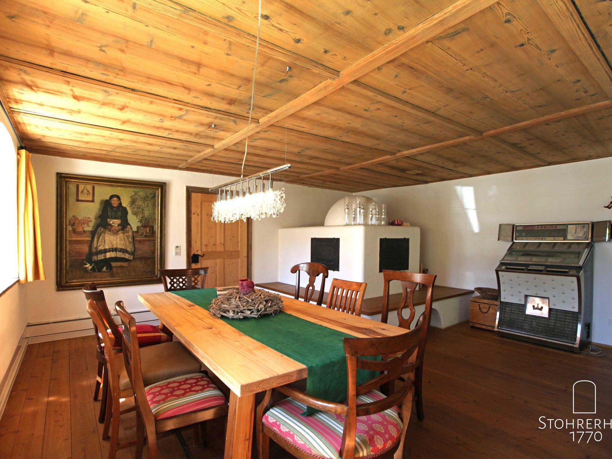 Der großzügige Flur (22qm) im Erdgeschoß mit direkter und indirekter Beleuchtung und zentralen Rauchmeldern sowie USM-Haller Regalen, bietet direkten Zugang zu allen Räumen. Neben der hellen Garderobe (5qm) mit einer Schuhputzmaschine kann man direkt in die historische Bauernstube (28qm) mit seinem wunderschönen Grundofen, Jukebox, Spielen und einem großen Stubentisch (für bis zu 16 Personen), der aus den uralten Dielen des Stubenbodens erstellt wurde, einkehren. Alle Möbel wurden liebevoll von herausragenden Schreinern gestaltet. Die Stühle wurden in Einzelanfertigung besonders für diese Stube hochwertigst, individuell hergestellt. In diesem Haus haben wir nichts dem Zufall überlassen. Wir haben besonders Wert auf den historischen Rückbau dieses Raumes mit seiner alten Holzdecke und der originalen Bauerntür aus dem 18 Jhdt. gelegt.