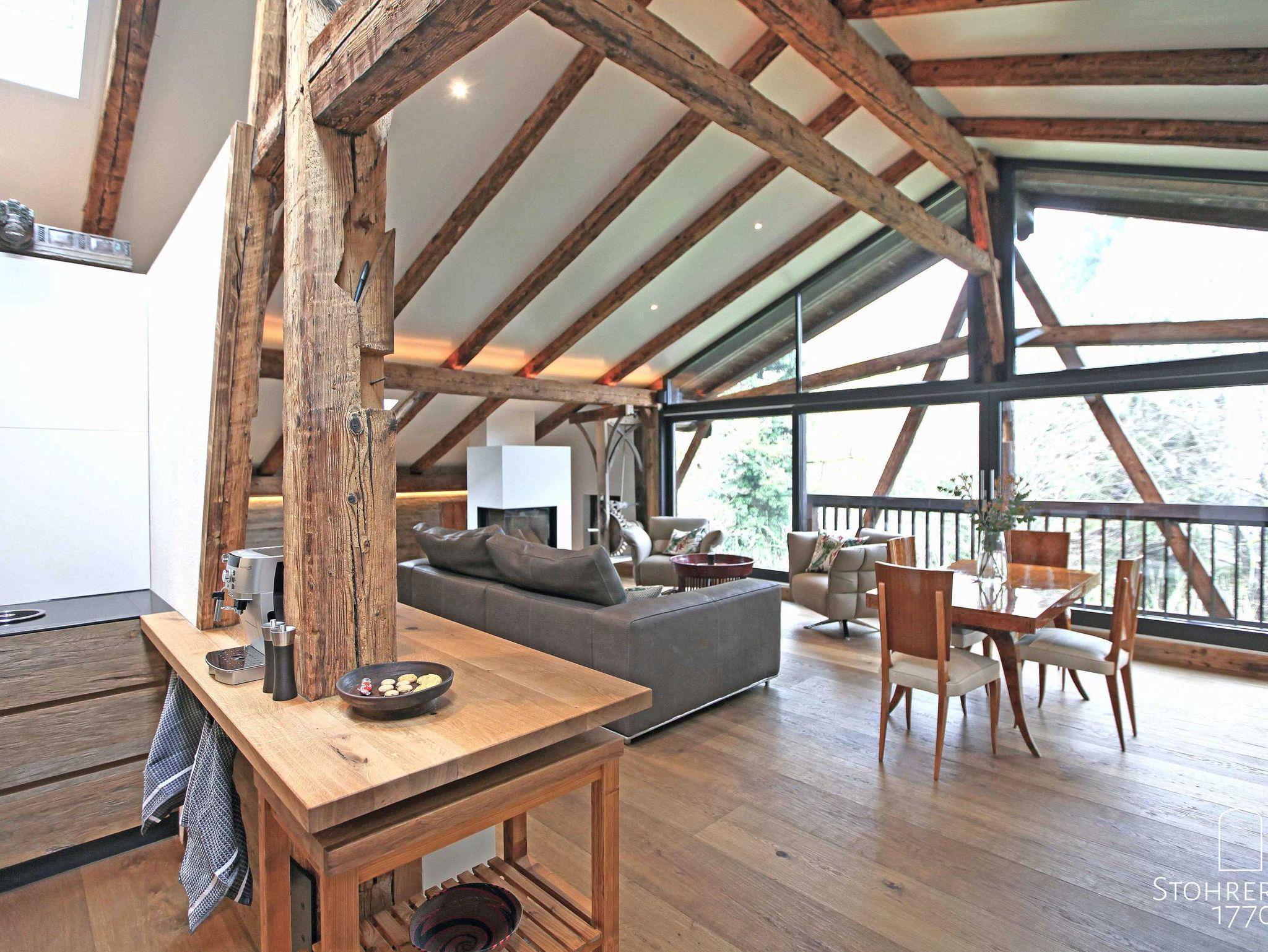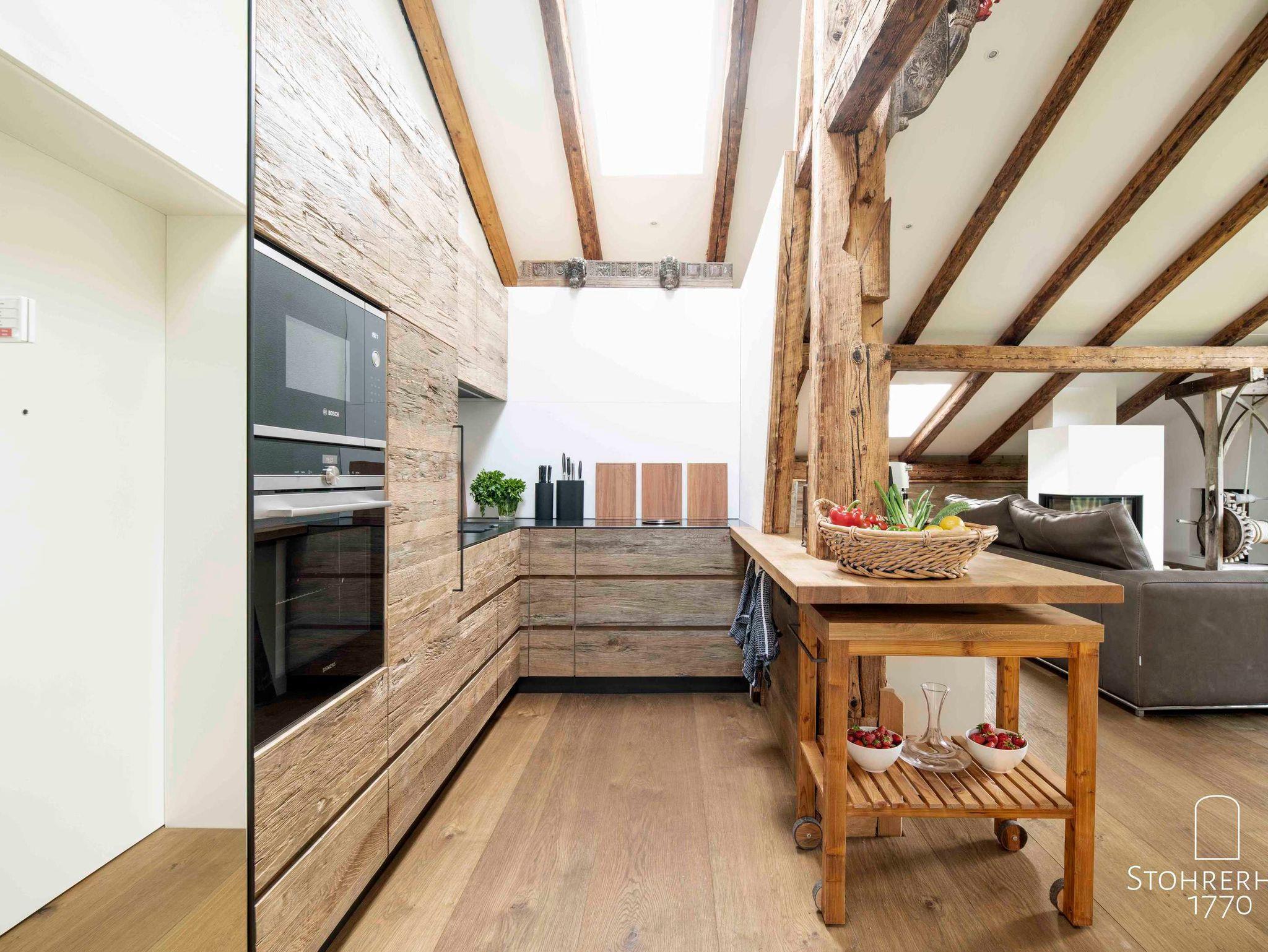 Über die historische Holztreppe erreichen Sie nun direkt das exklusive und lichtdurchflutete ganz offen gestaltete Penthouse (100 qm). Das Penthouse verfügt über zwei von unserem Schreiner eigens designten Doppelbetten (1,80 x 2,00), zwei Bädern, einer Dusche sowie einer separaten Küche. Die komplett verglaste Giebelseite gewährt Ihnen einen wunderbaren Ausblick und der wunderschöne Kaminofen lädt zu gemütlichen Stunden am Feuer ein.